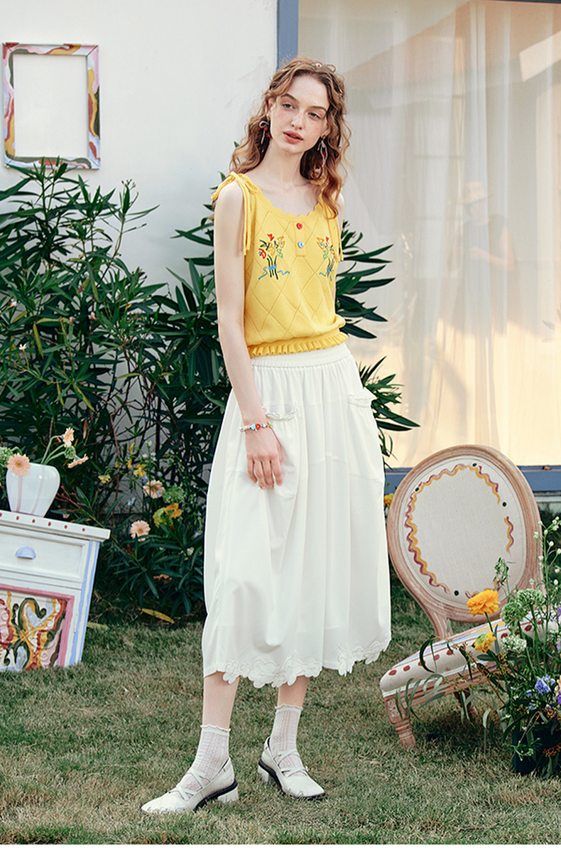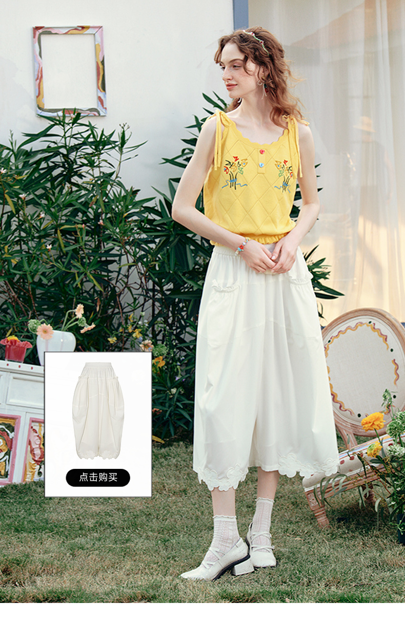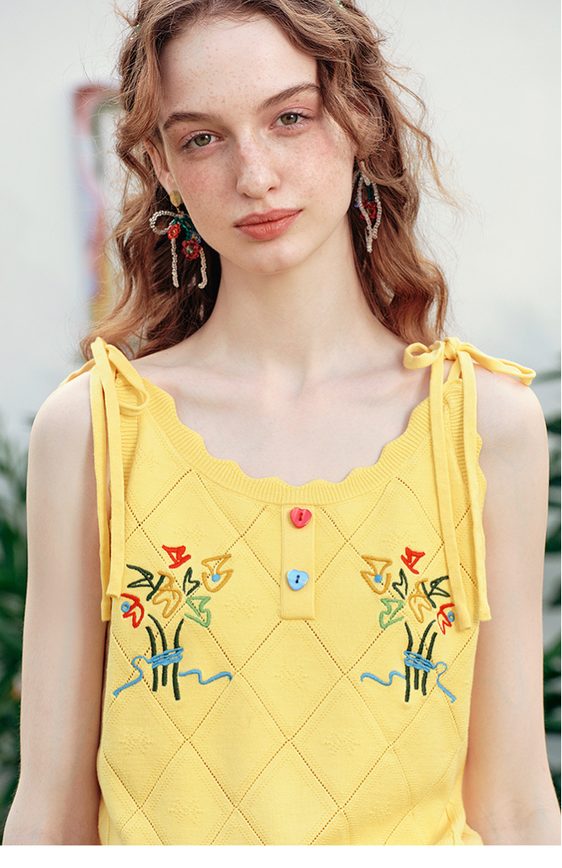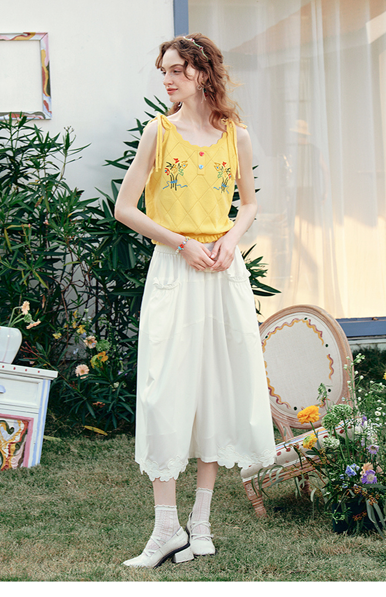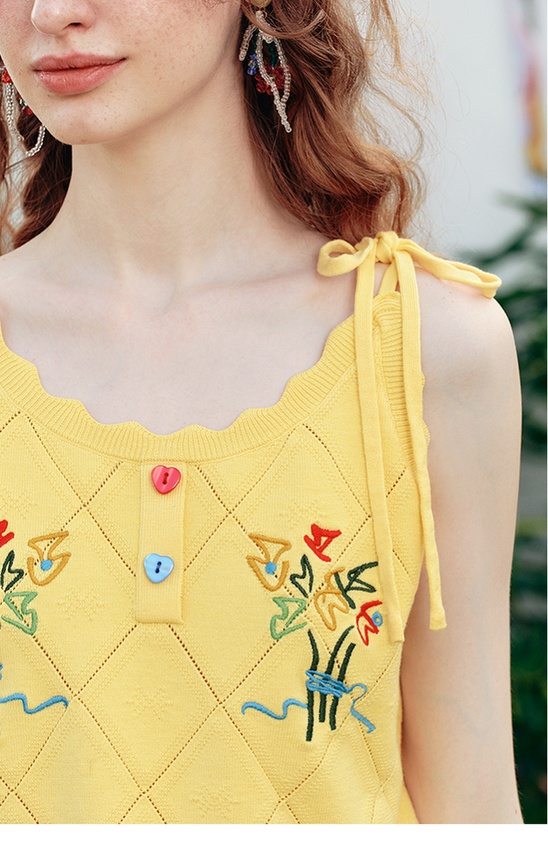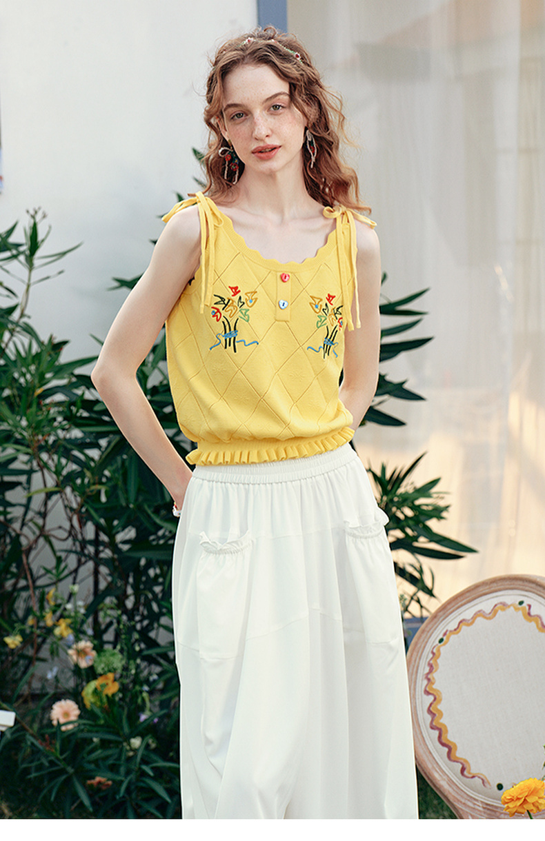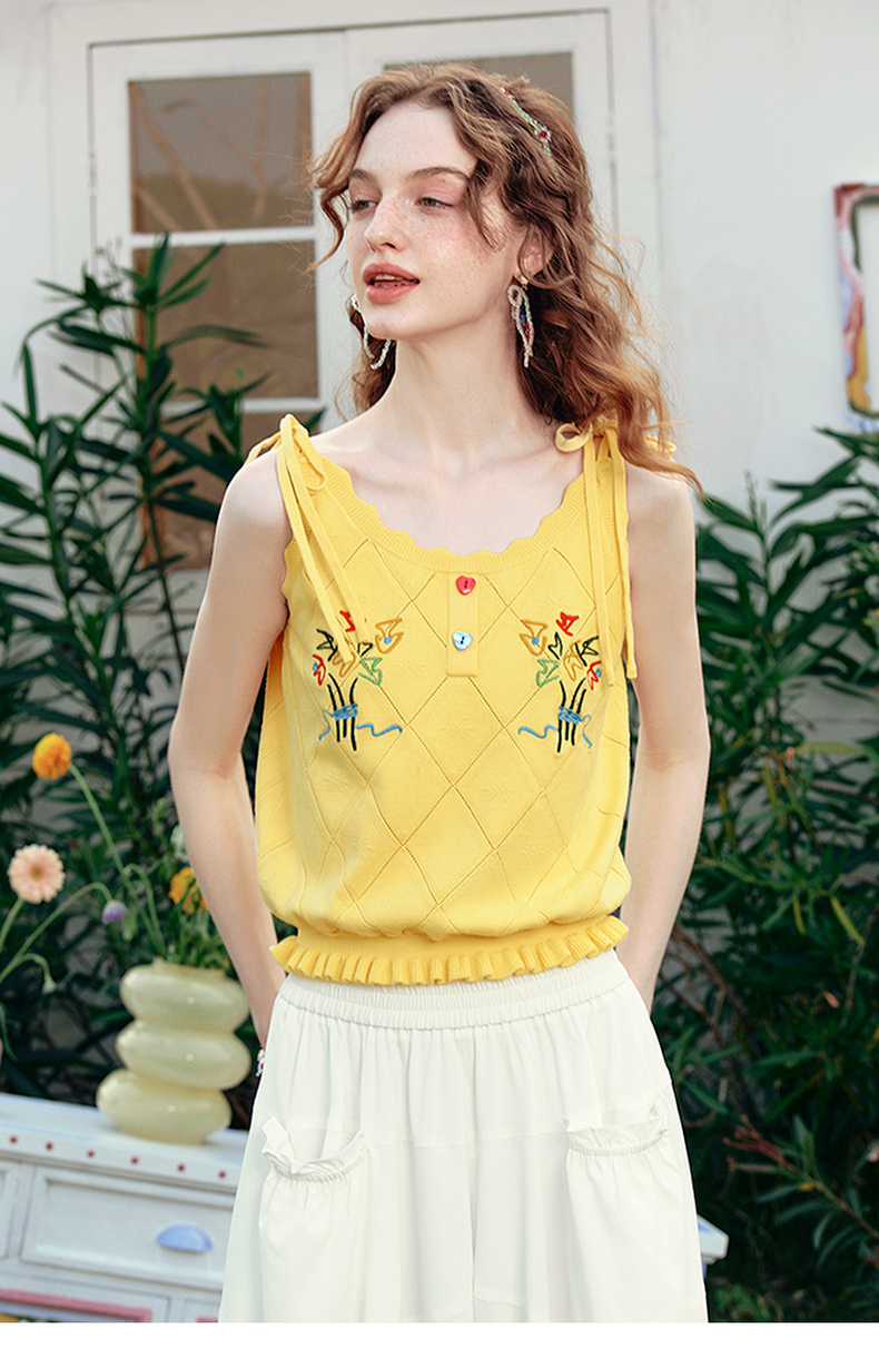 两三事 童谣乐园 2025夏季新款小清新木耳边下摆刺绣吊带针织衫女