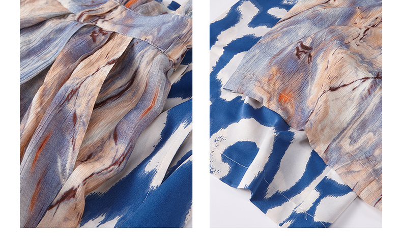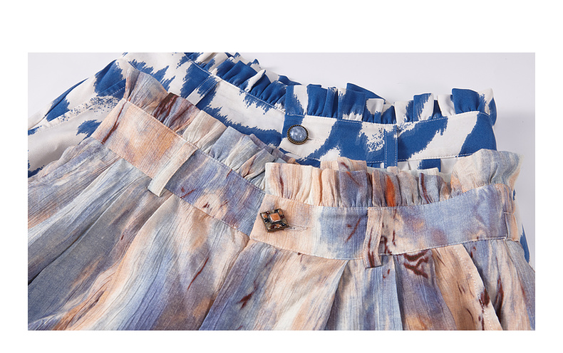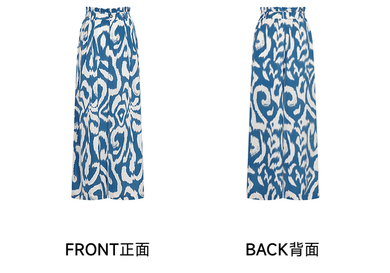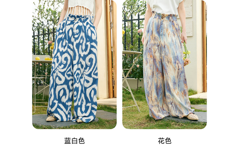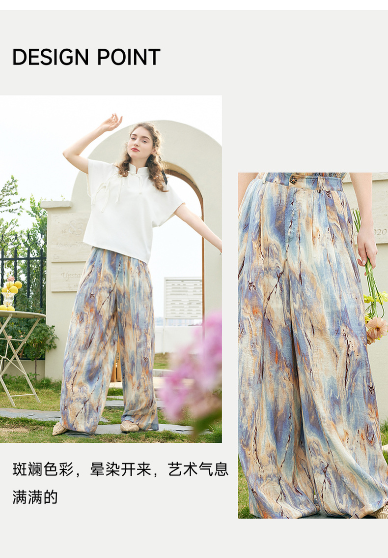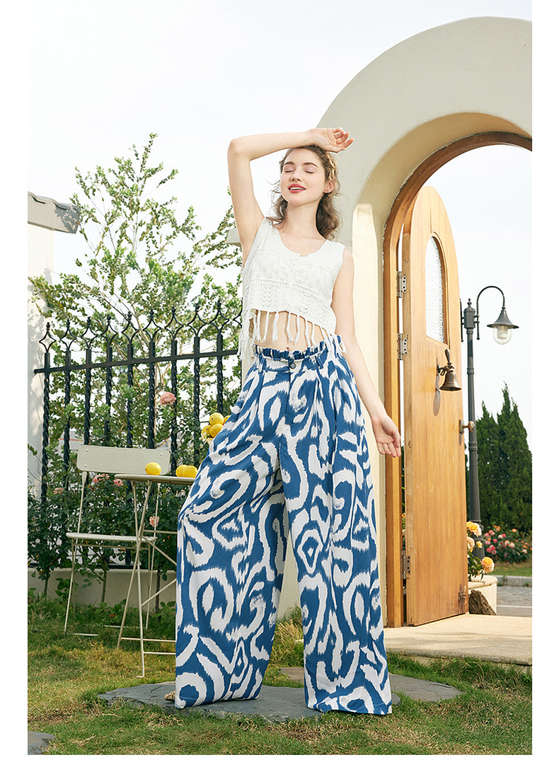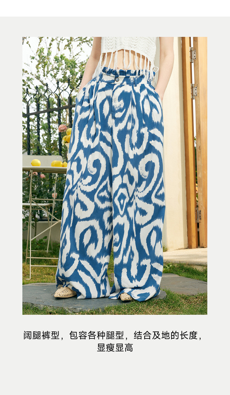 两三事 藏蓝奇 2024夏季新款复古抽象印花高腰阔腿裤休闲裤女