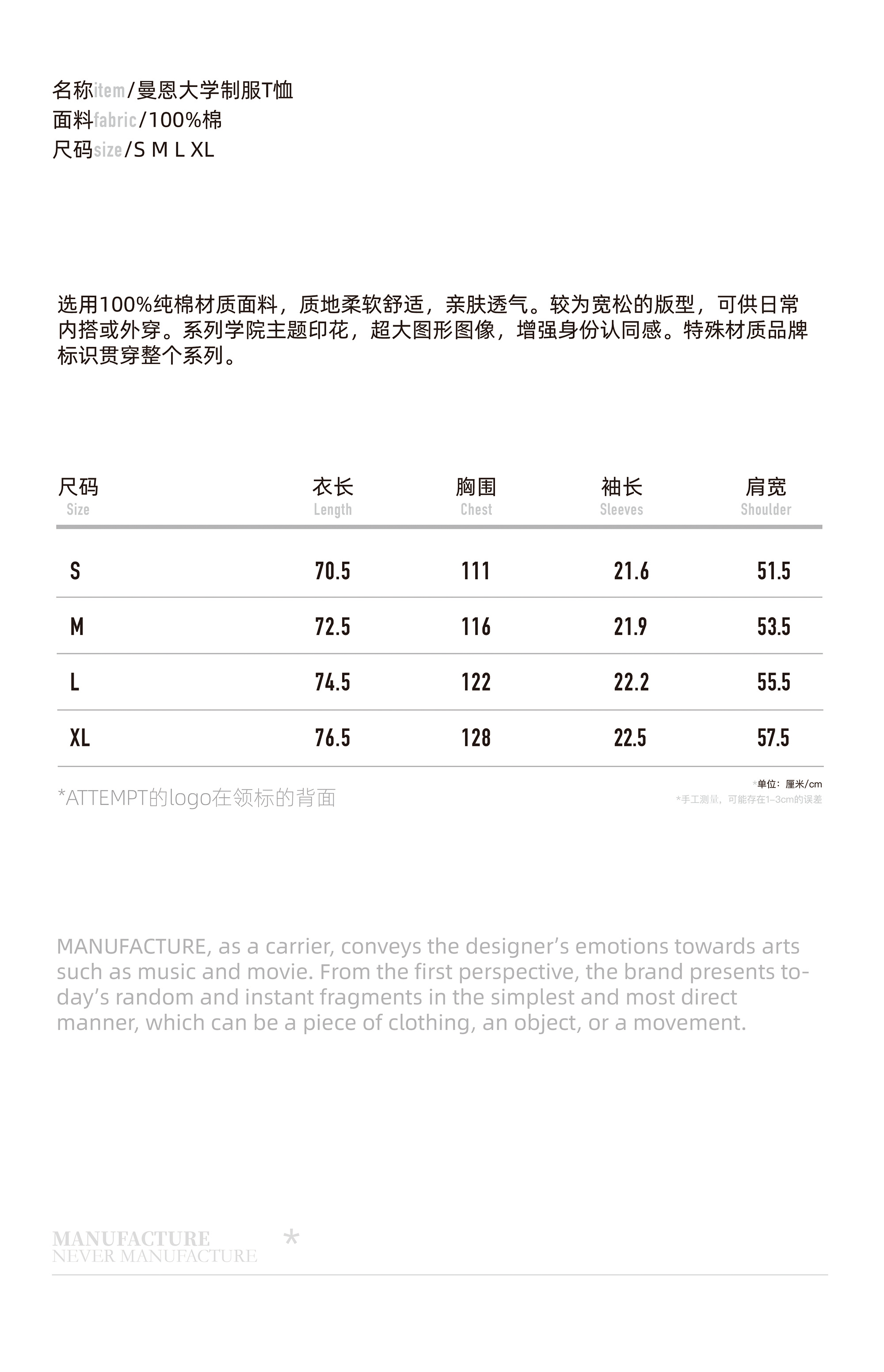 MANUFACTURE BY ATTEMPT 曼恩大学制服T-shirt 短袖T恤