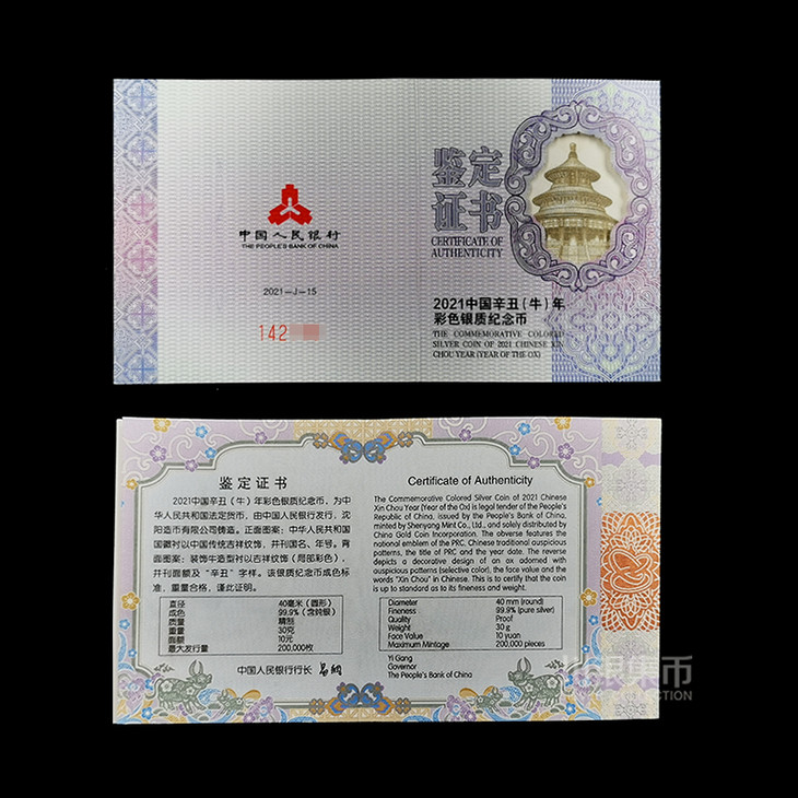 规格介绍: 30克圆形银质彩色纪念币为精制币,含纯银30克,直径40毫米,面额10元,成色99.9%,最大发行量200000枚。