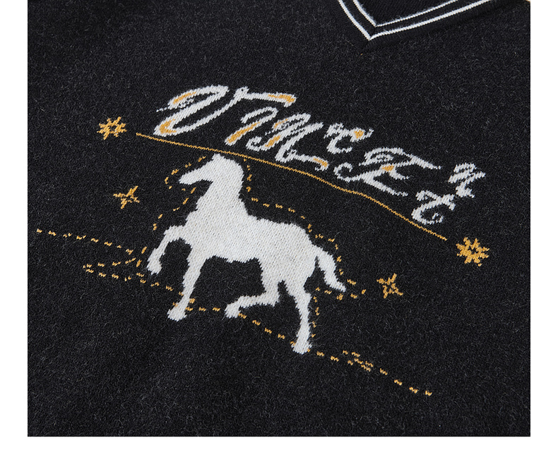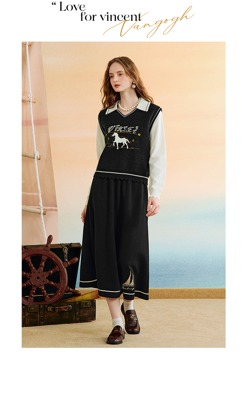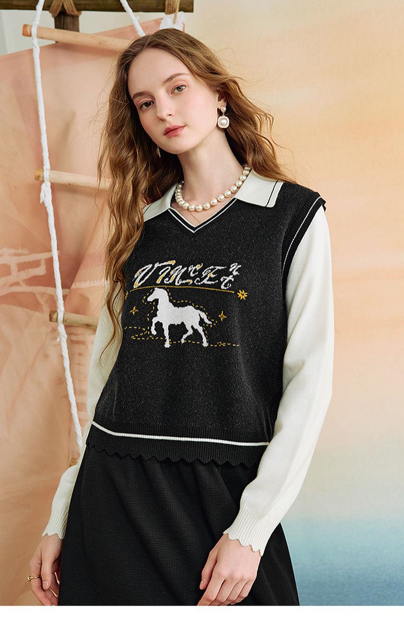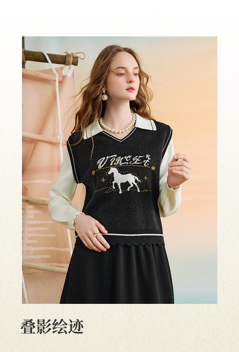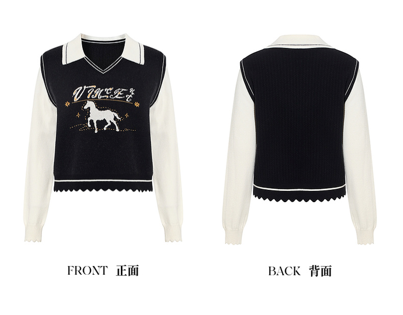 两三事梵高文艺 叠影绘迹 2025秋季新款动物图案撞色假两件毛衣女