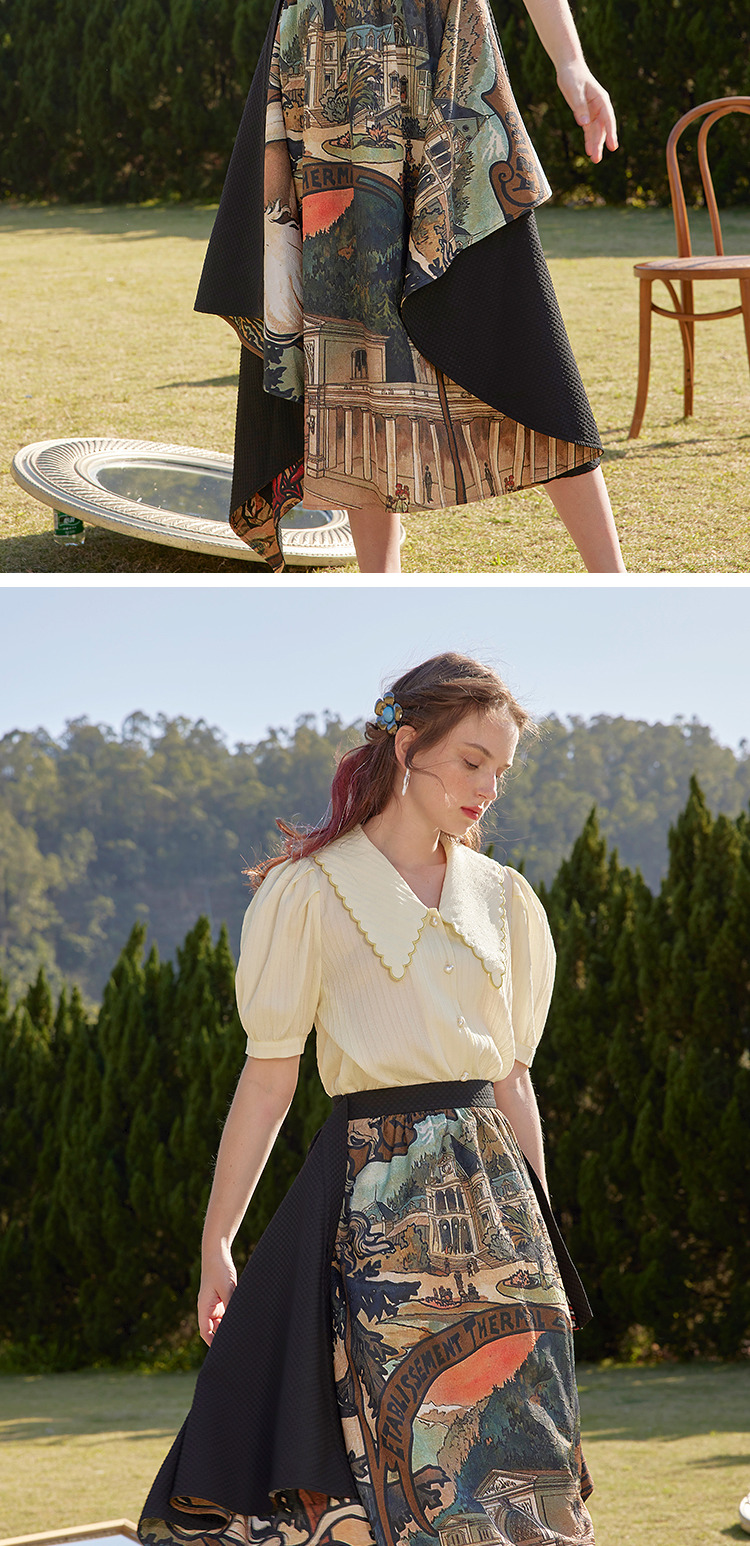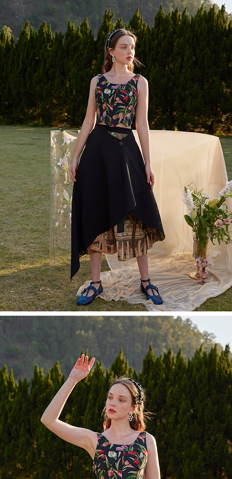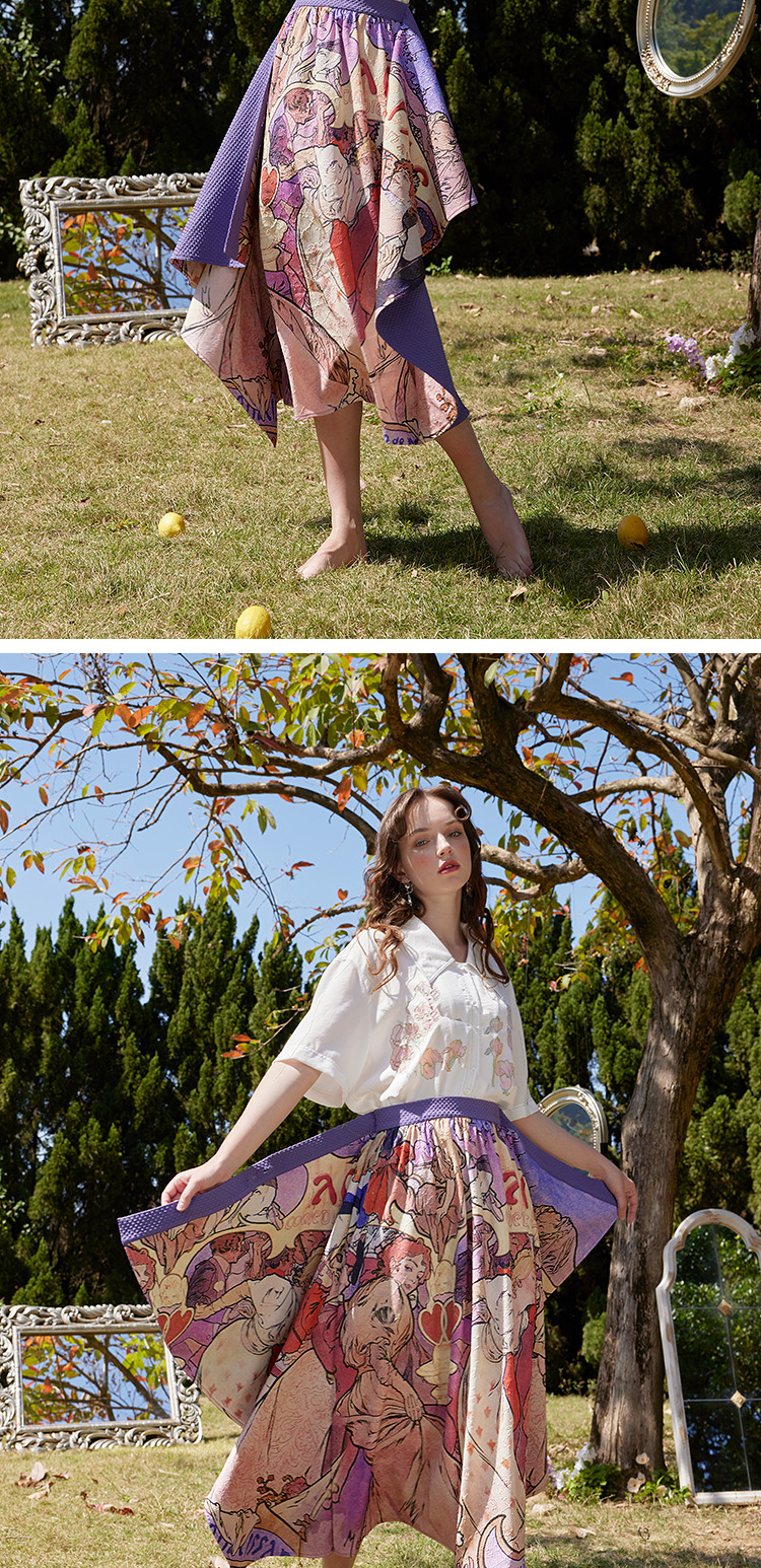 半裙两三事初夏梦 夏季新款复古手绘画印花不规则剪裁高腰半身裙
