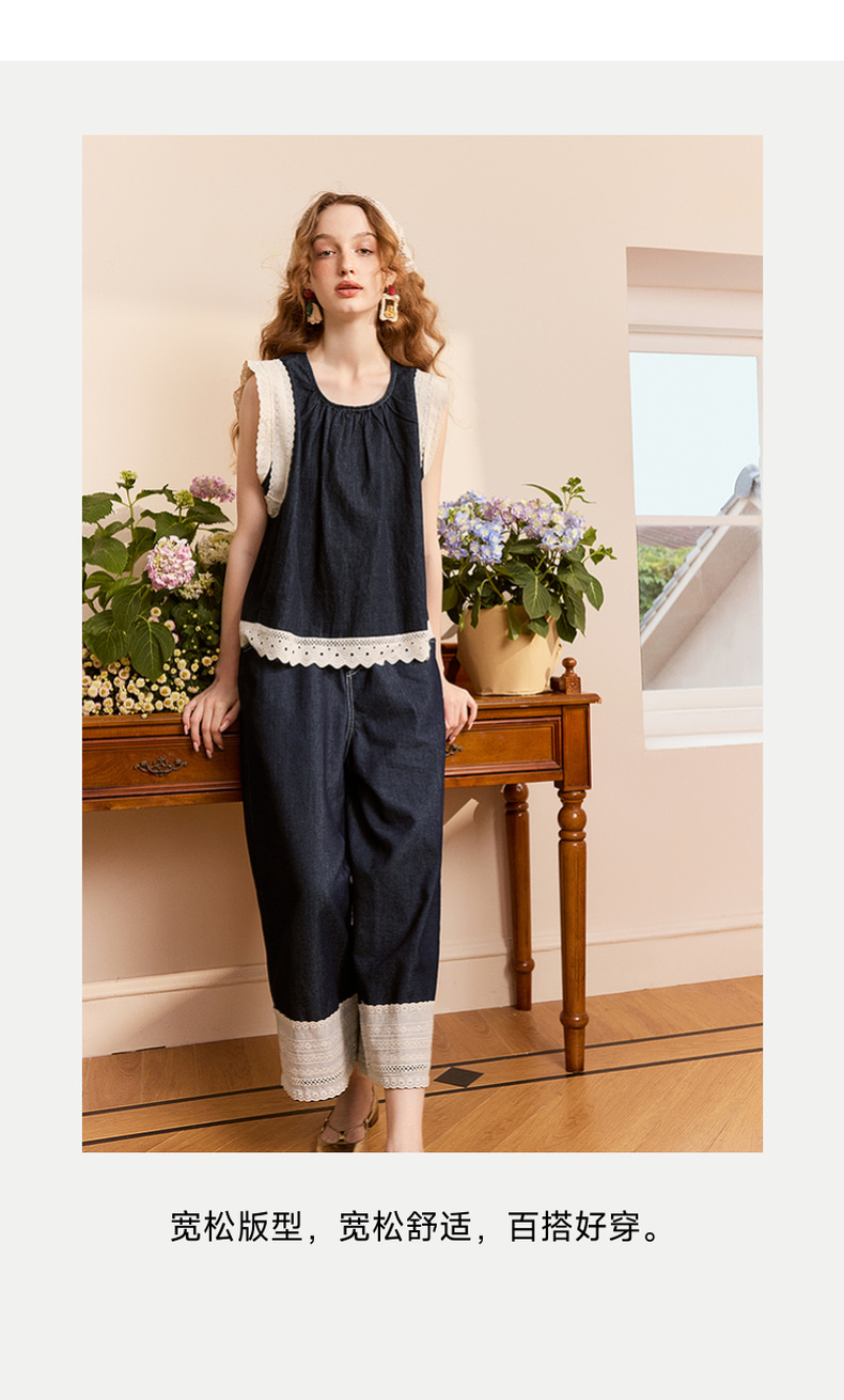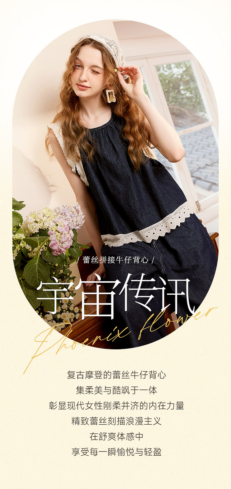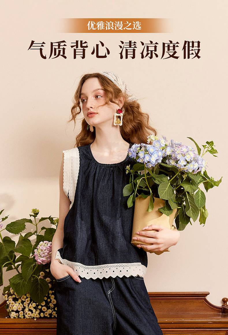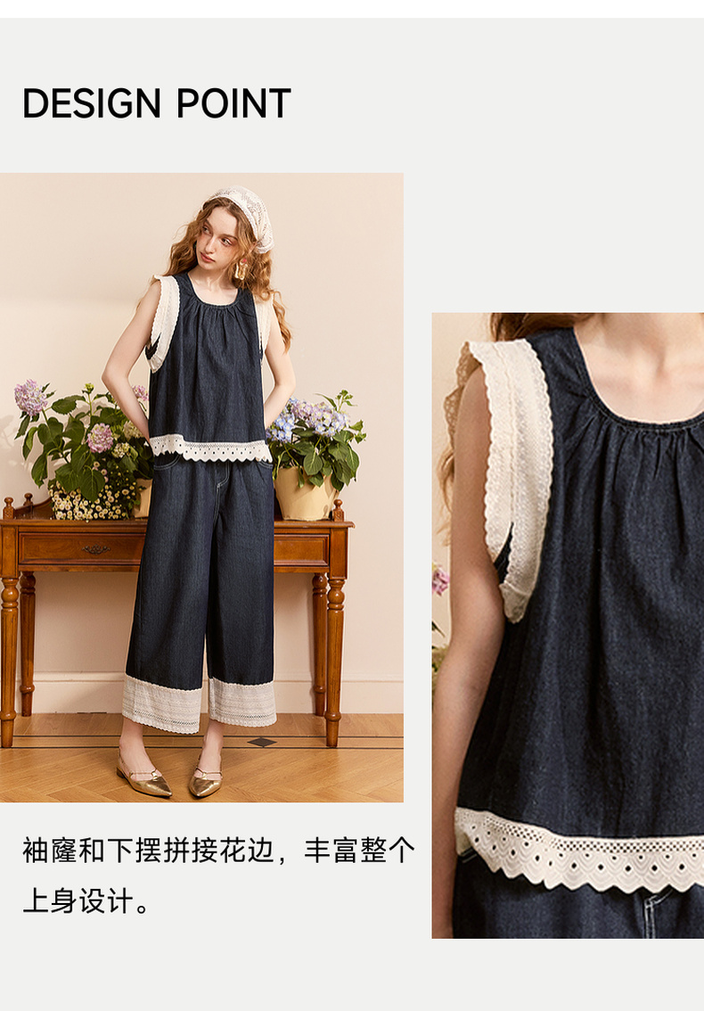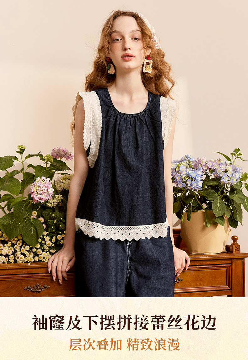 两三事 宇宙传讯 2024夏季新款复古蕾丝边拼接牛仔短款上衣背心女