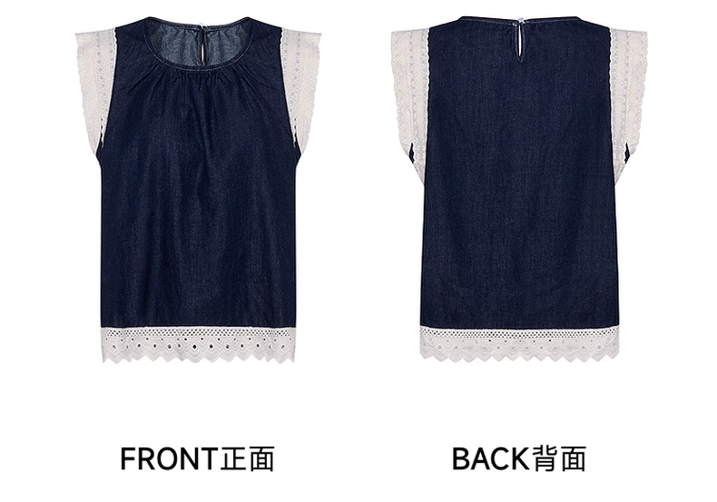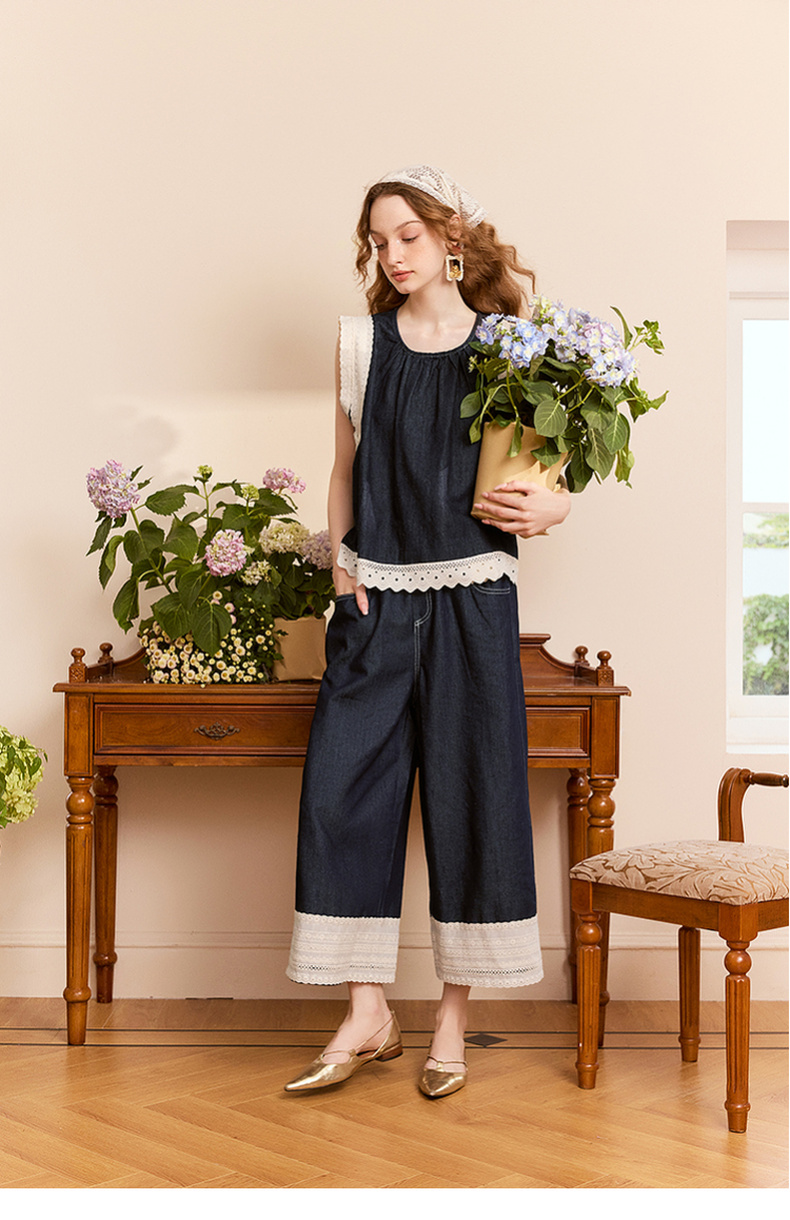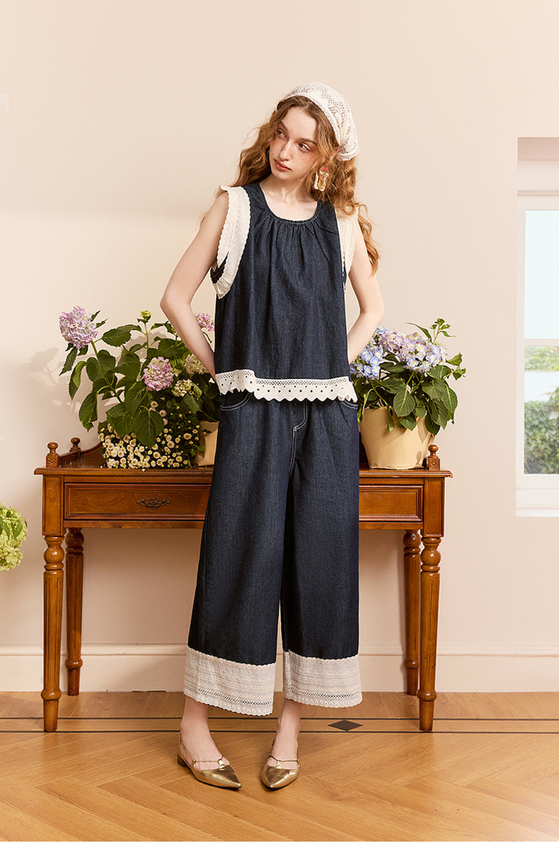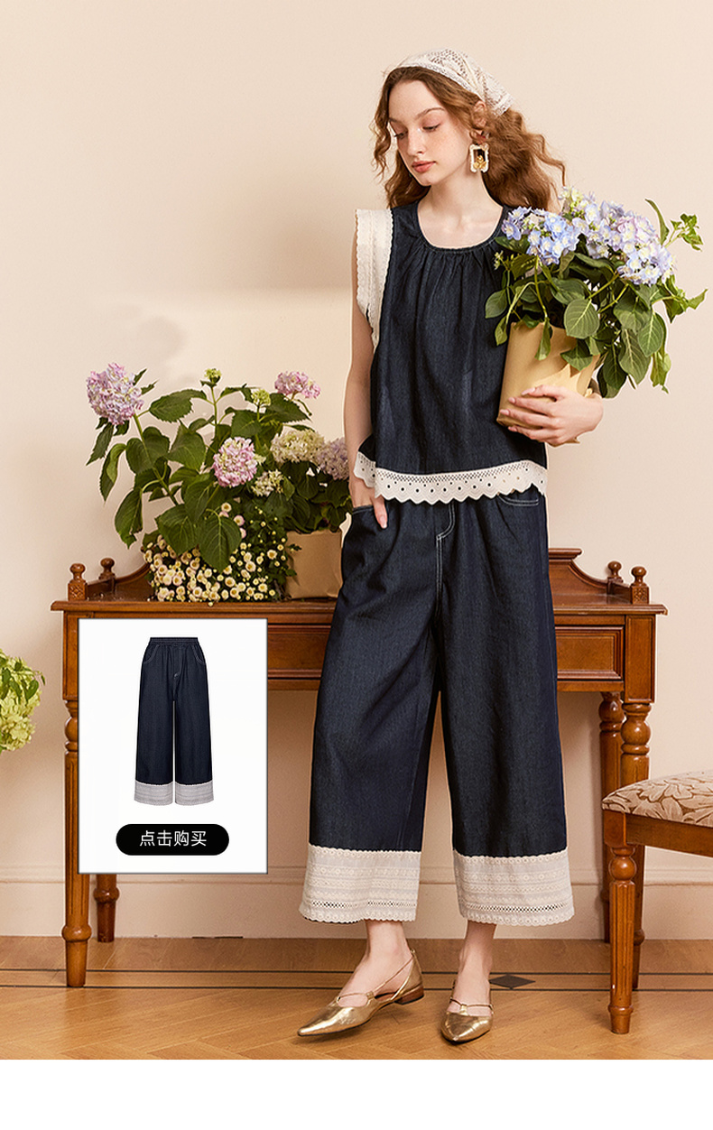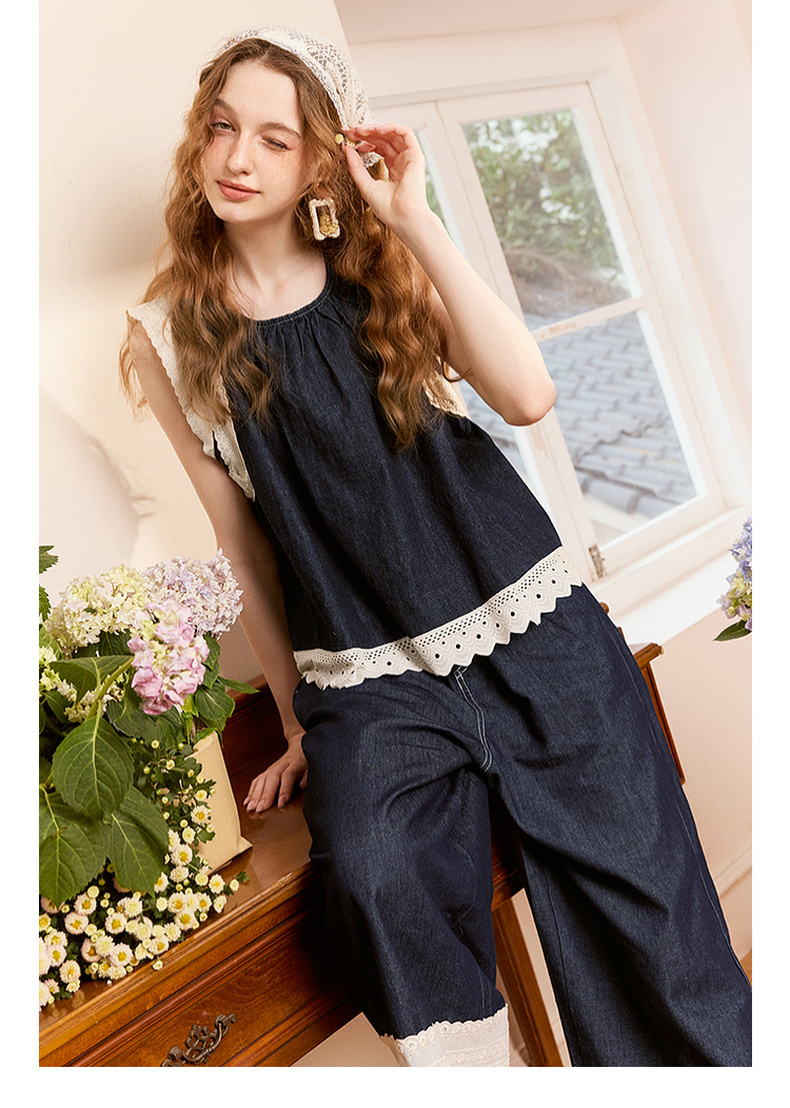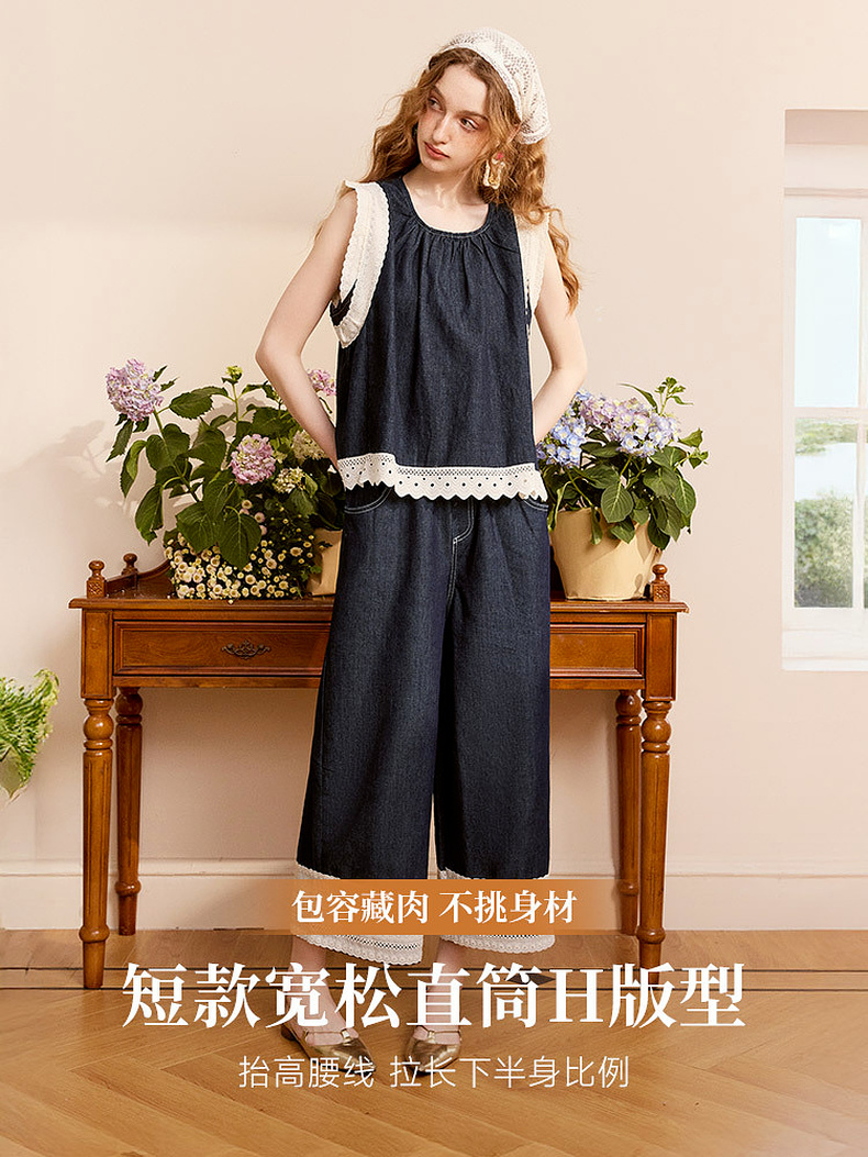 两三事 宇宙传讯 2024夏季新款复古蕾丝边拼接牛仔短款上衣背心女