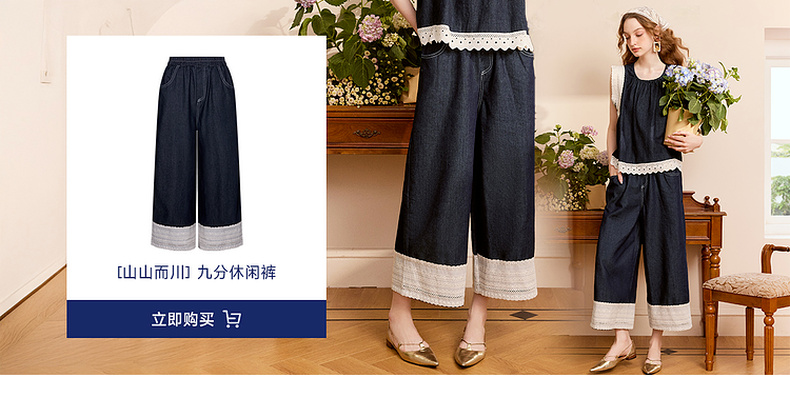 两三事 花间浅染 2025春季新款双层蕾丝拼接裤脚绣花直筒牛仔裤女