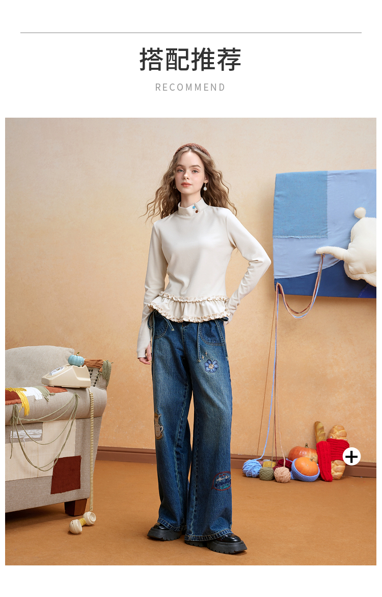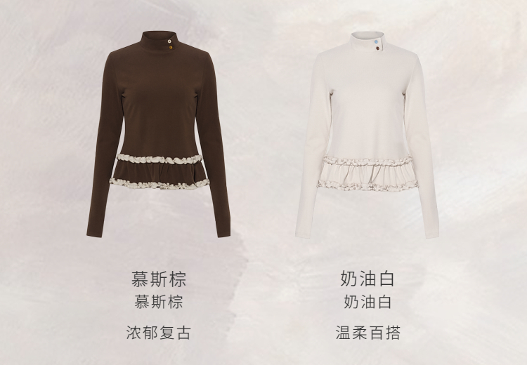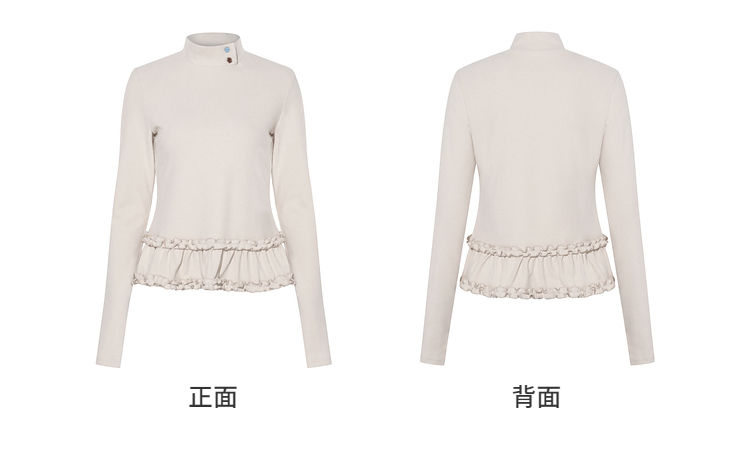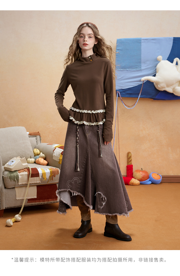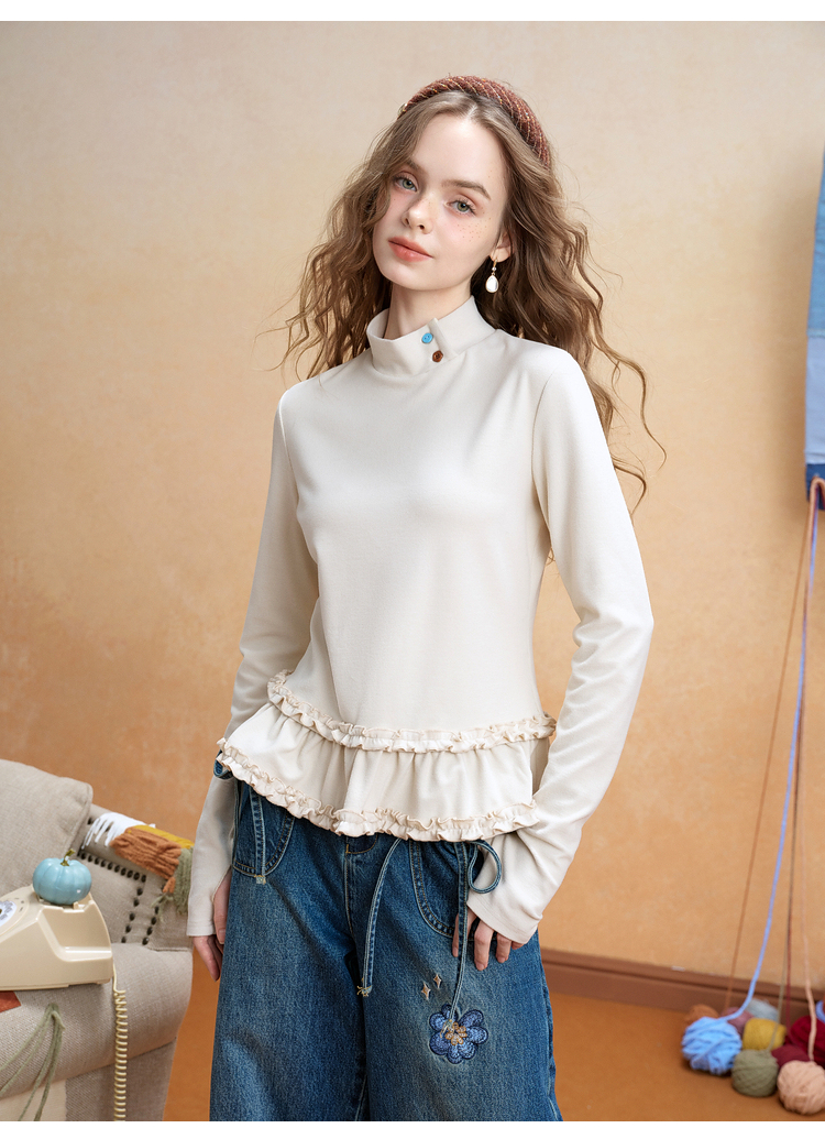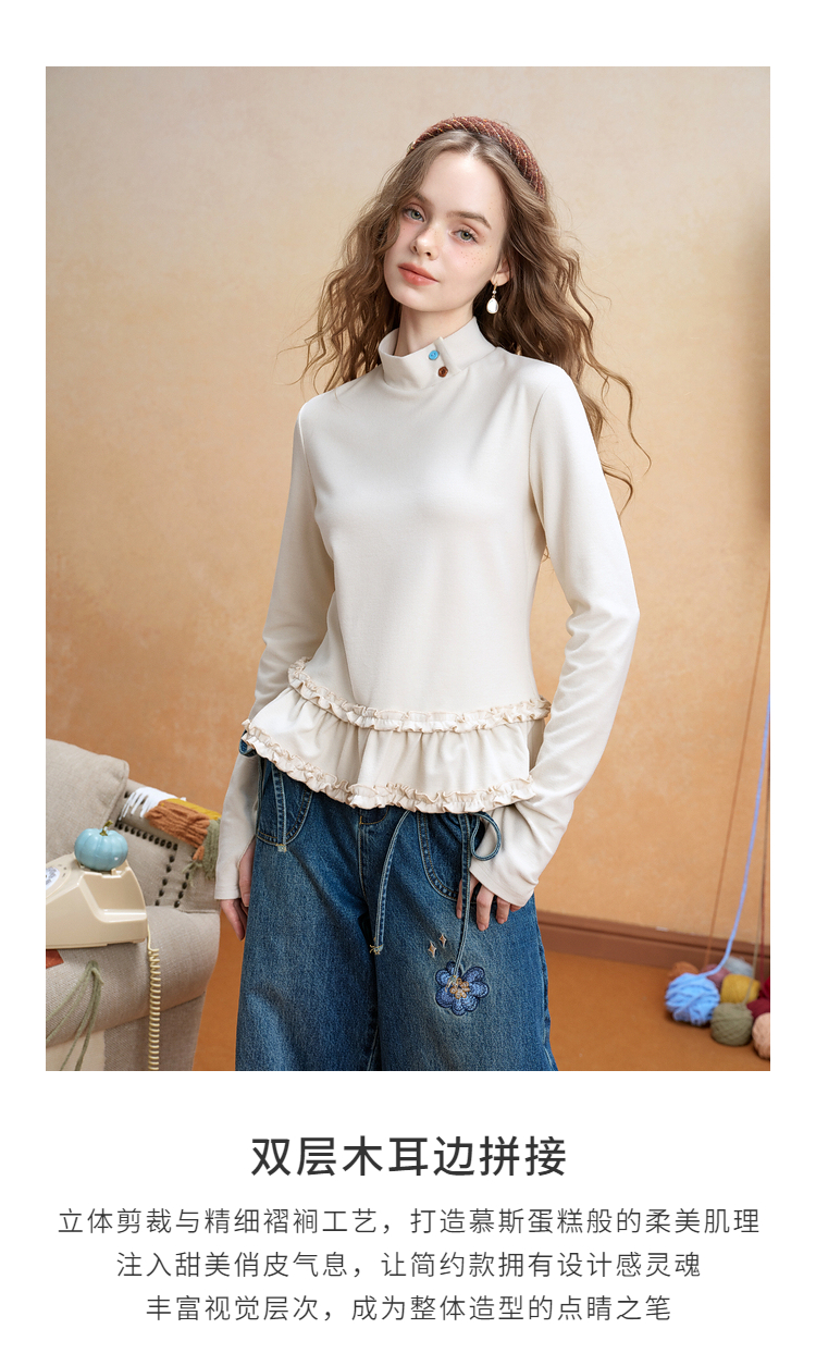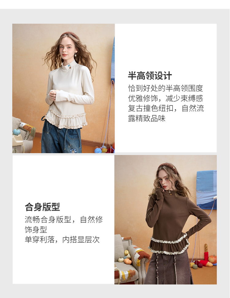 两三事温月薄影2025年冬新款百搭木耳边拼接高领打底衫女长袖t恤