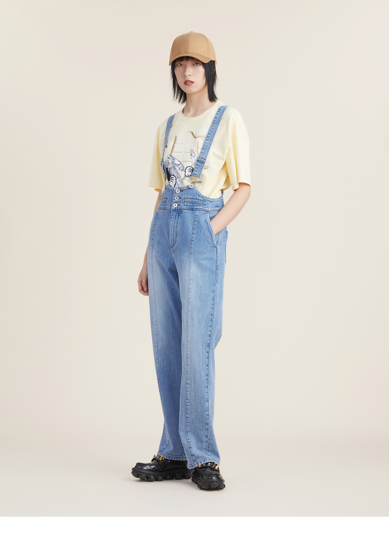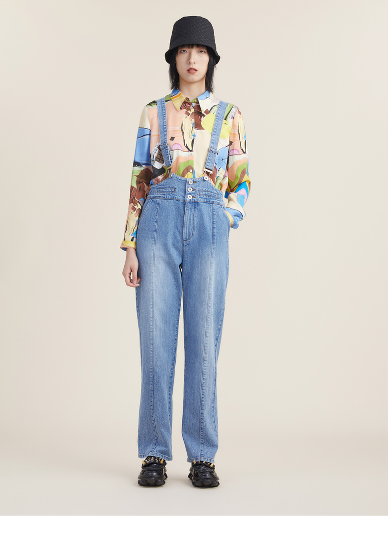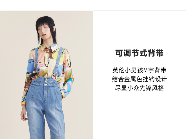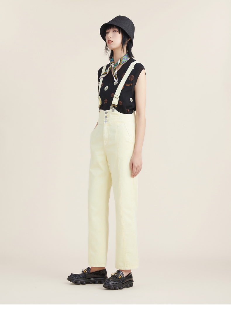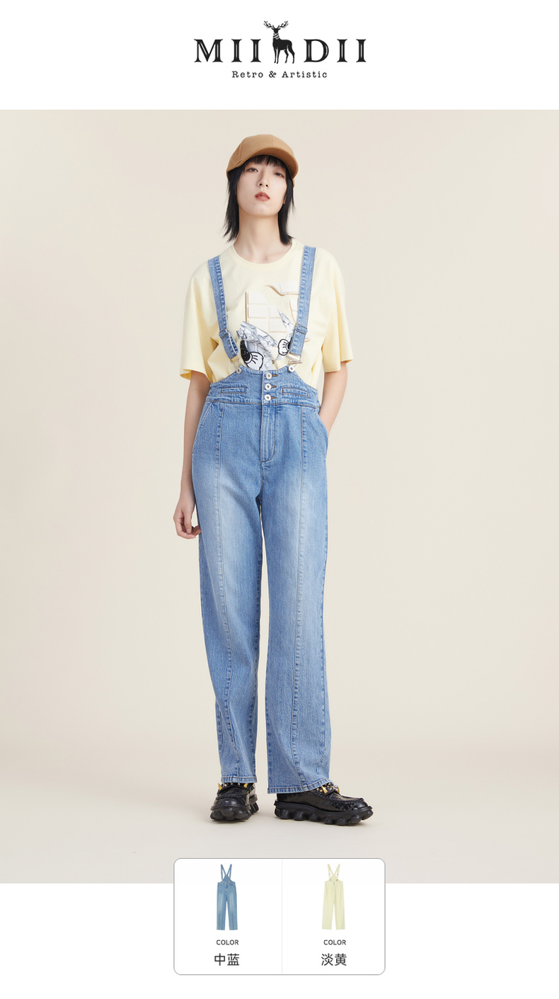 谜底2022秋新品复古洗水磨白高腰可拆卸背带牛仔裤女223MK1017