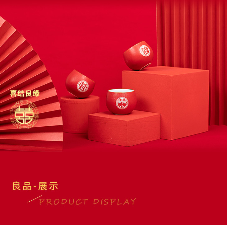 结婚大红色喜茶杯套装6只装家用陶瓷婚礼品茗杯送礼盒装敬茶杯子