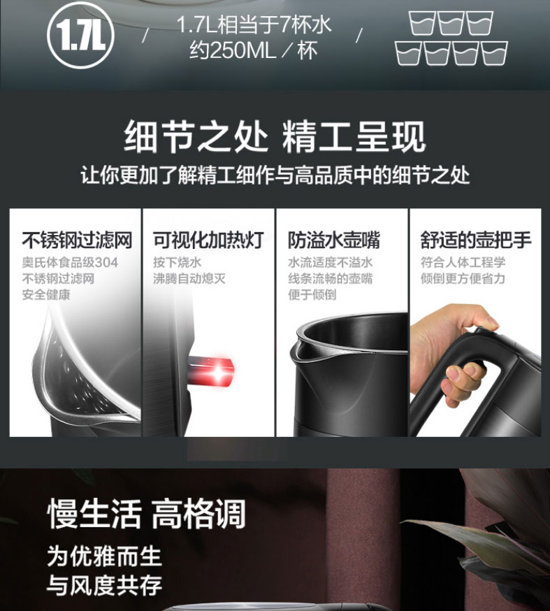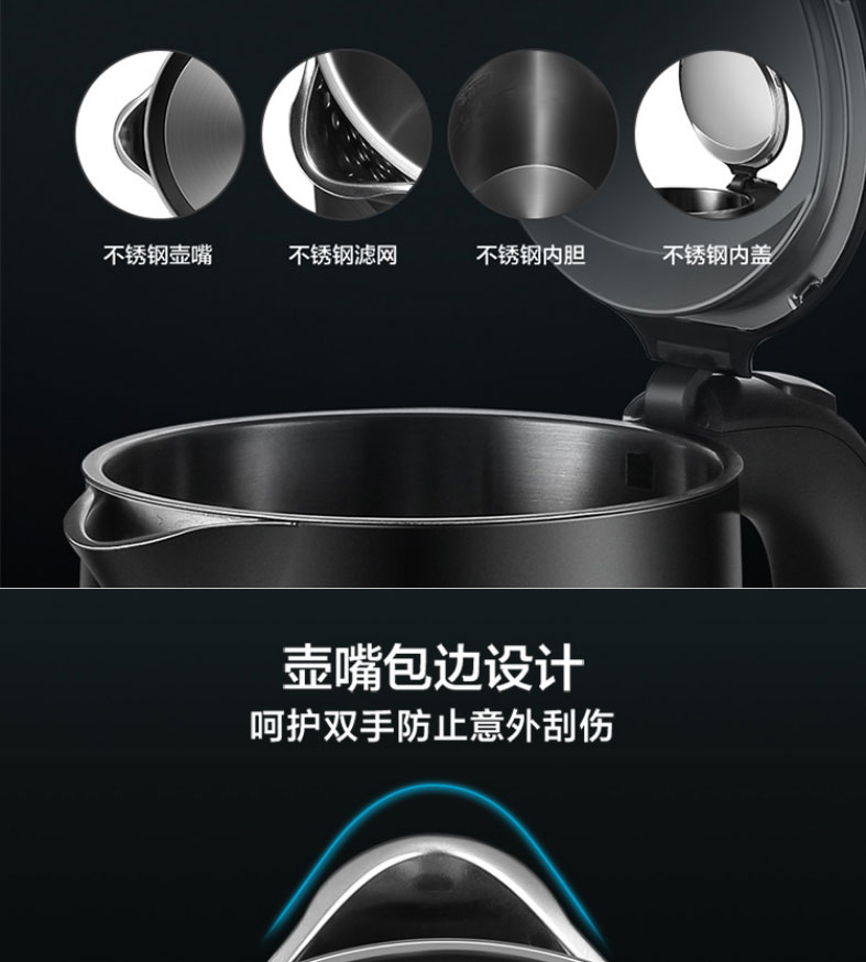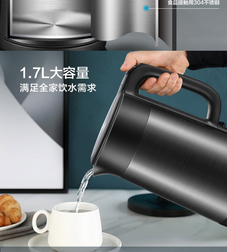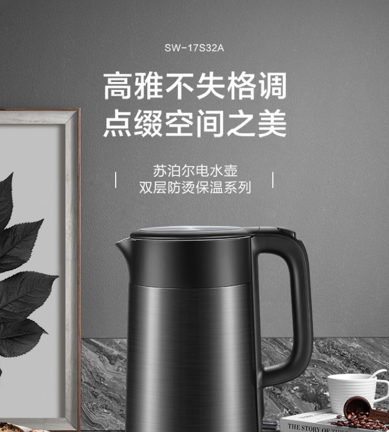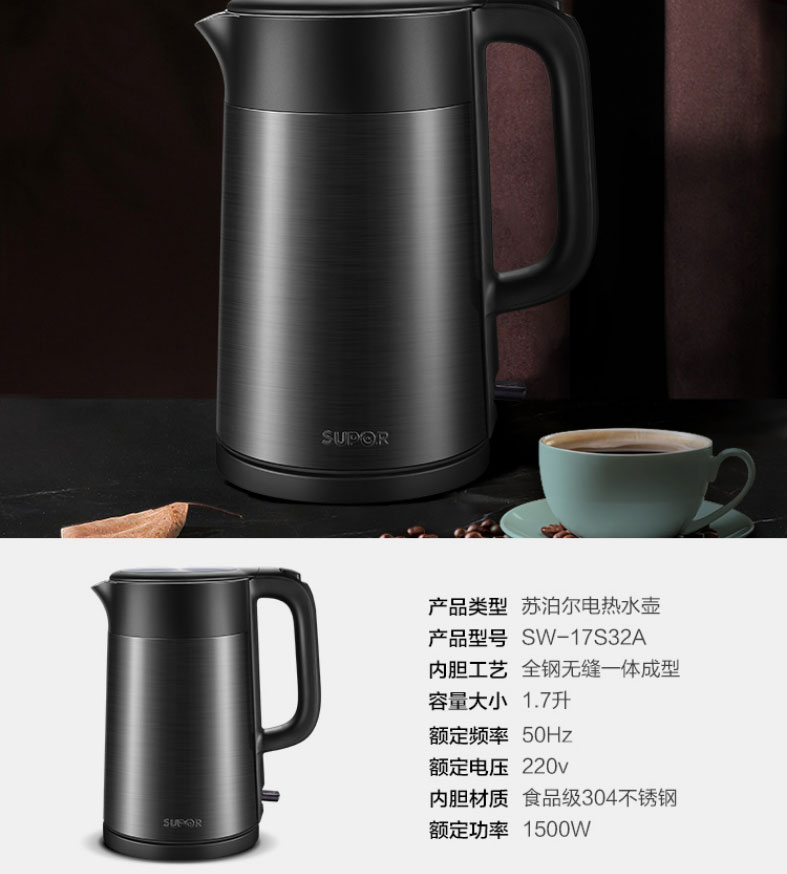 苏泊尔1.7L大容量 ZMD安心系列 酷炫双钢机身 双层无缝内胆 电水壶17S32A