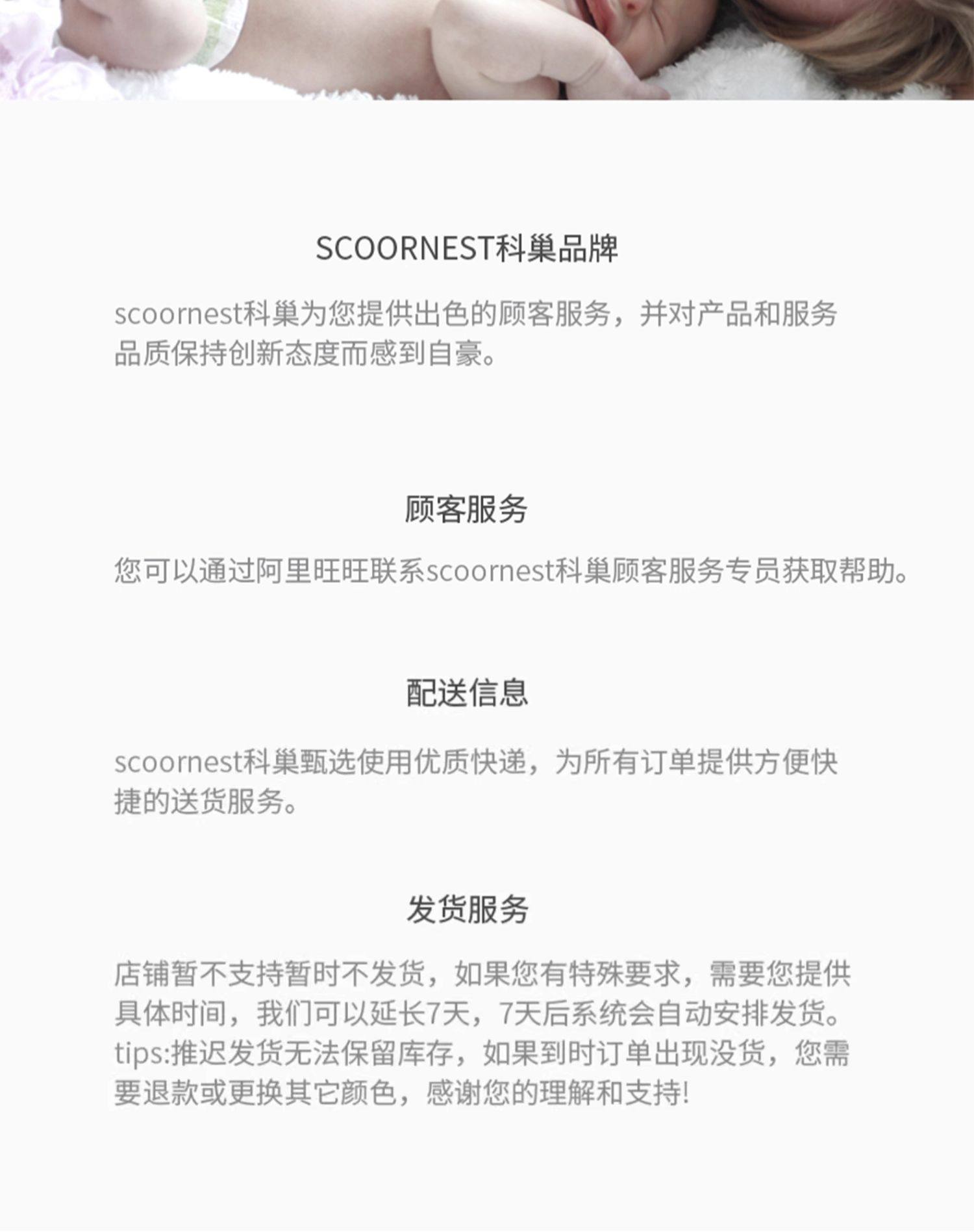 - Scoornest始终秉承给每一位宝宝送去科学的、关心的、创新的成长体验,通过提供商品和服务,使顾客形成守护、发展、巩固这种弥足珍贵的亲情的爱。