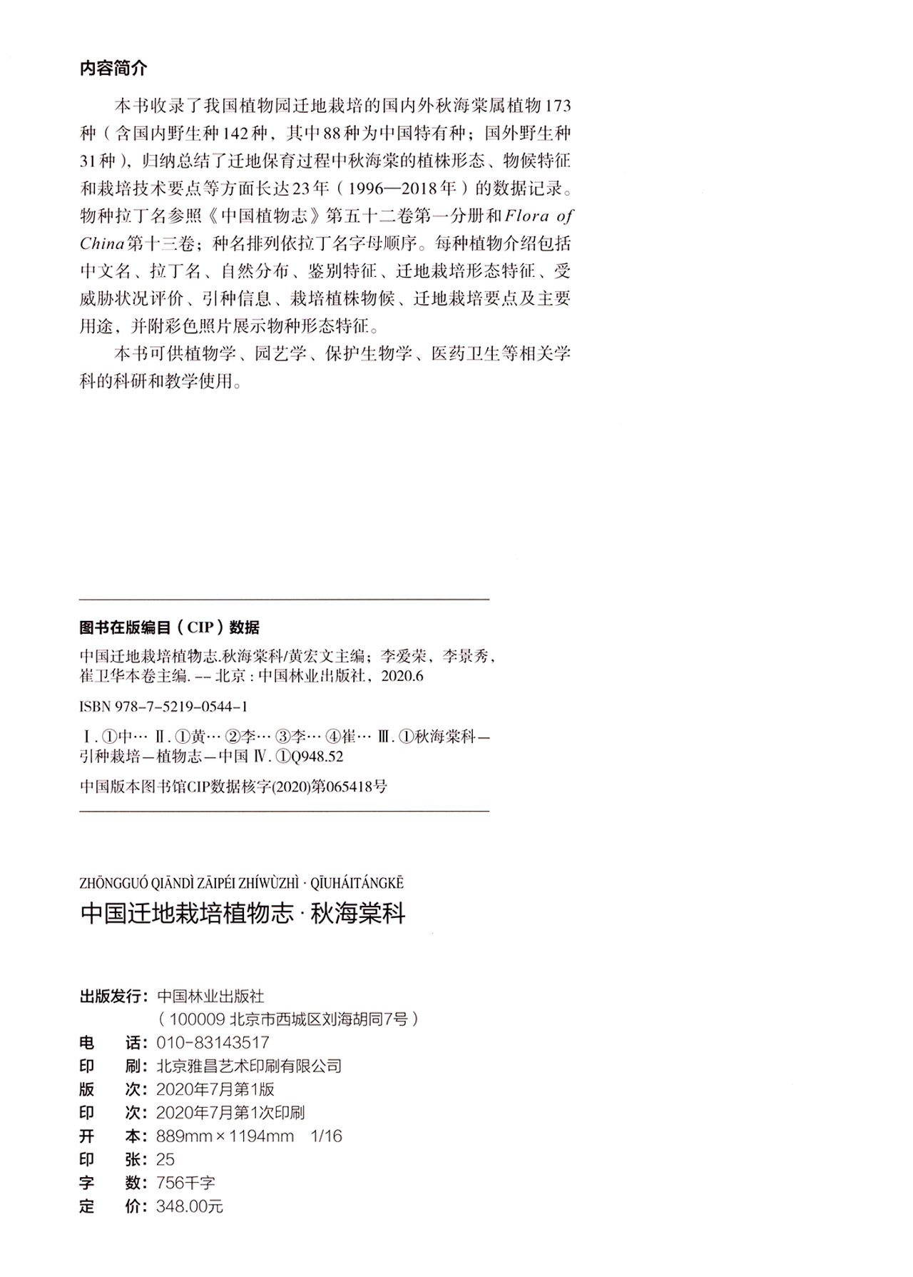 本书收录了我国植物园迁地栽培的国内外秋海棠属植物173种(含国内野生种142种,其中88种为中国特有种;国外野生种31种),归纳总结了迁地保育过程中秋海棠的植株形态、物候特征和栽培技术要点等方面长达23年(1996-2018年)的数据记录。物种拉丁名参照《中国植物志》第五十二卷第一分册和Flora of China第十三卷;种名排列依拉丁名字母顺序。每种植物介绍包括中文名、拉丁名、自然分布、鉴别特征、迁地栽培形态特征、受威胁状况评价、引种信息、栽培植株物候、迁地栽培要点及主要用途,并附彩色照片展示物种形态特征。 本书可供植物学、园艺学、保护生物学、医药卫生等相关学科的科研和教学使用。