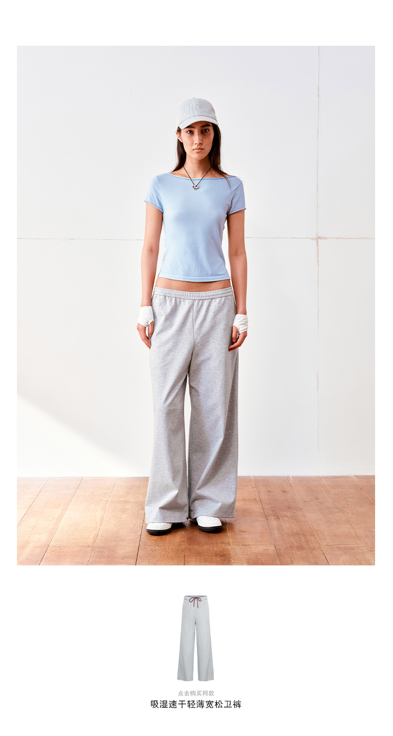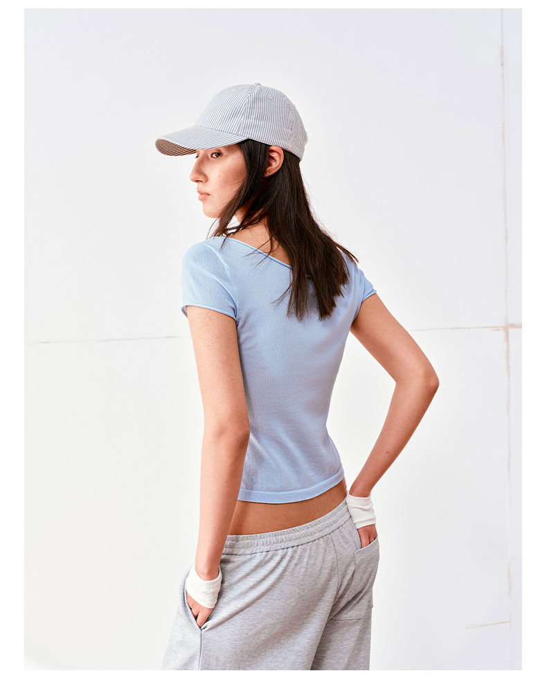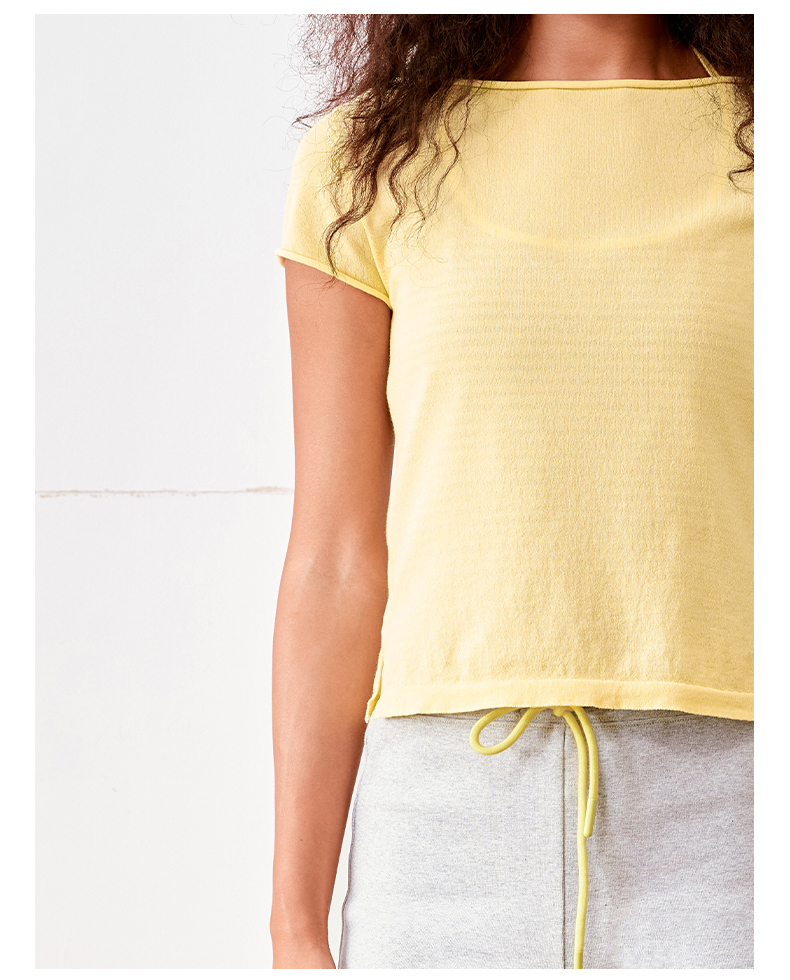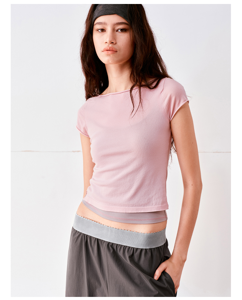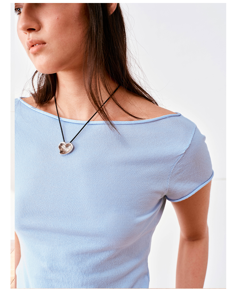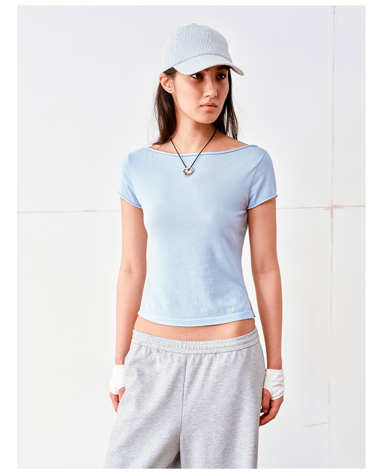 NUTH高捻长绒棉一字领针织上衣微透短袖T恤女