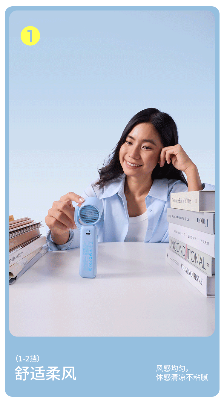 🔺3-4档:均衡强风,日常风速,通勤、办公、外出逛街、散步时用,清凉又舒适