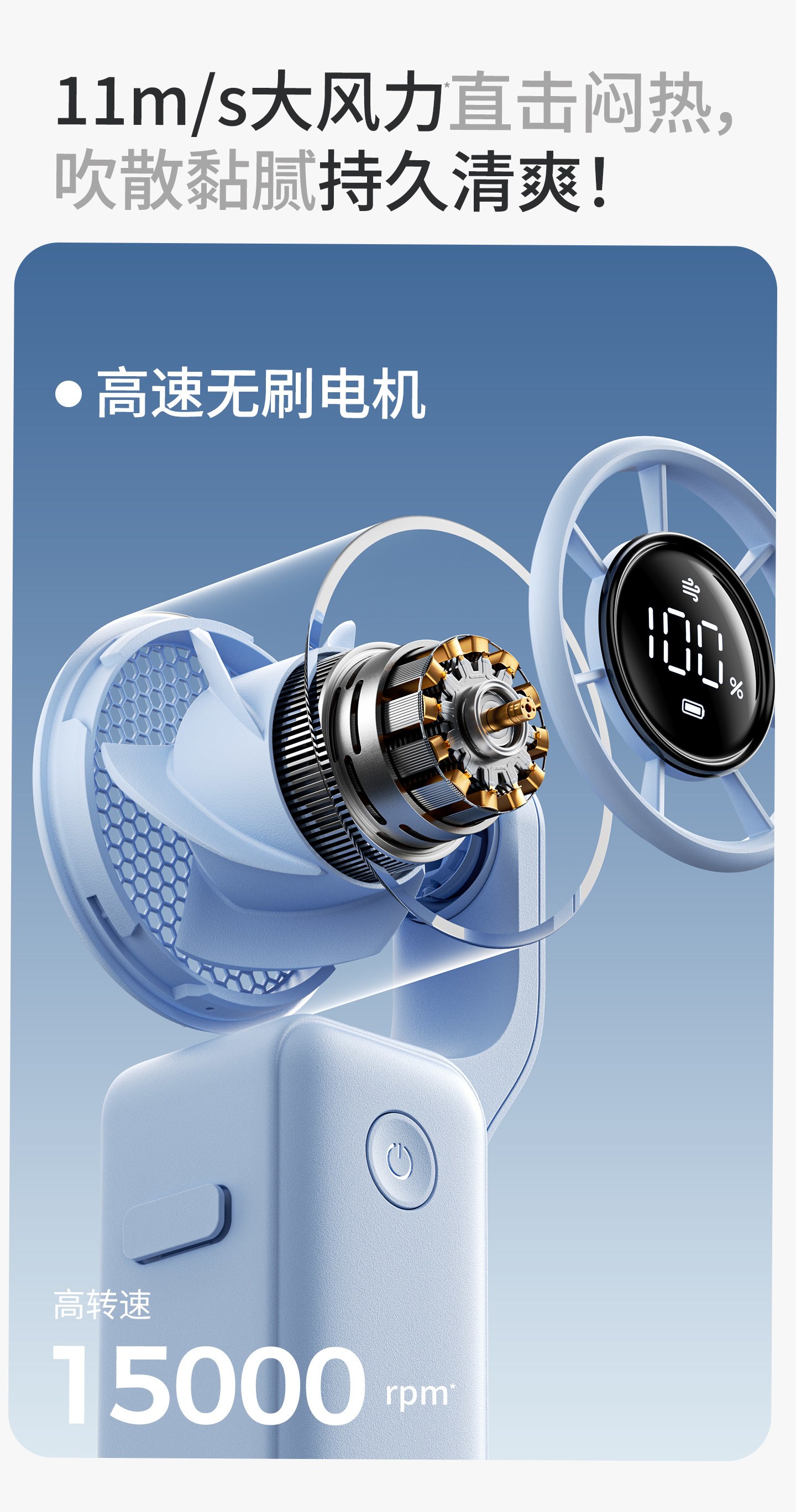 ✅ 双叶加压+高速无刷电机,强劲风力快速降温