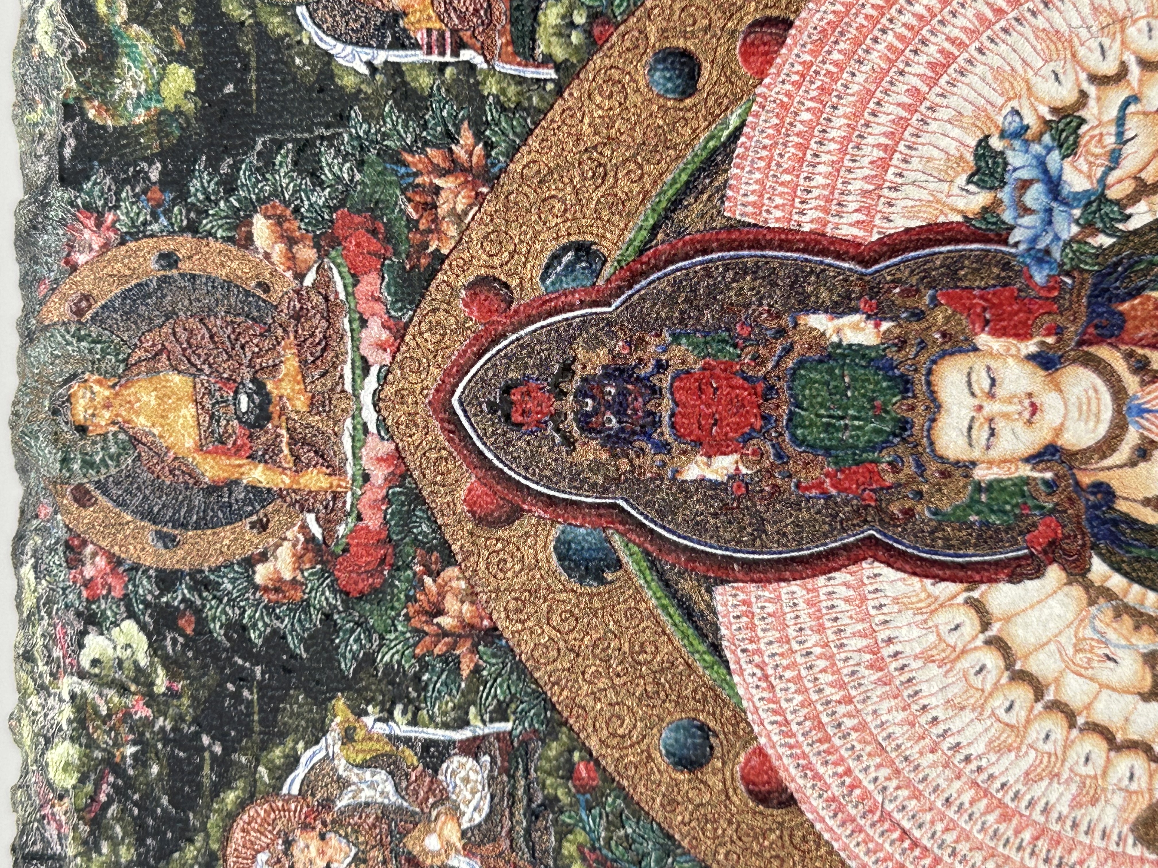 千手观音全称“千手千眼观世音菩萨”,是佛教六观音之一。千手观音是大慈悲的象征,愿众生度过各种难关、消除病痛、一生幸福安康。
