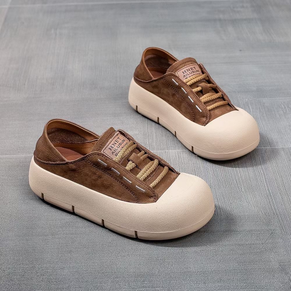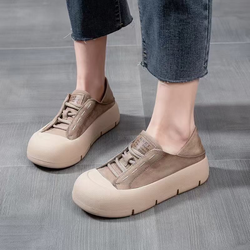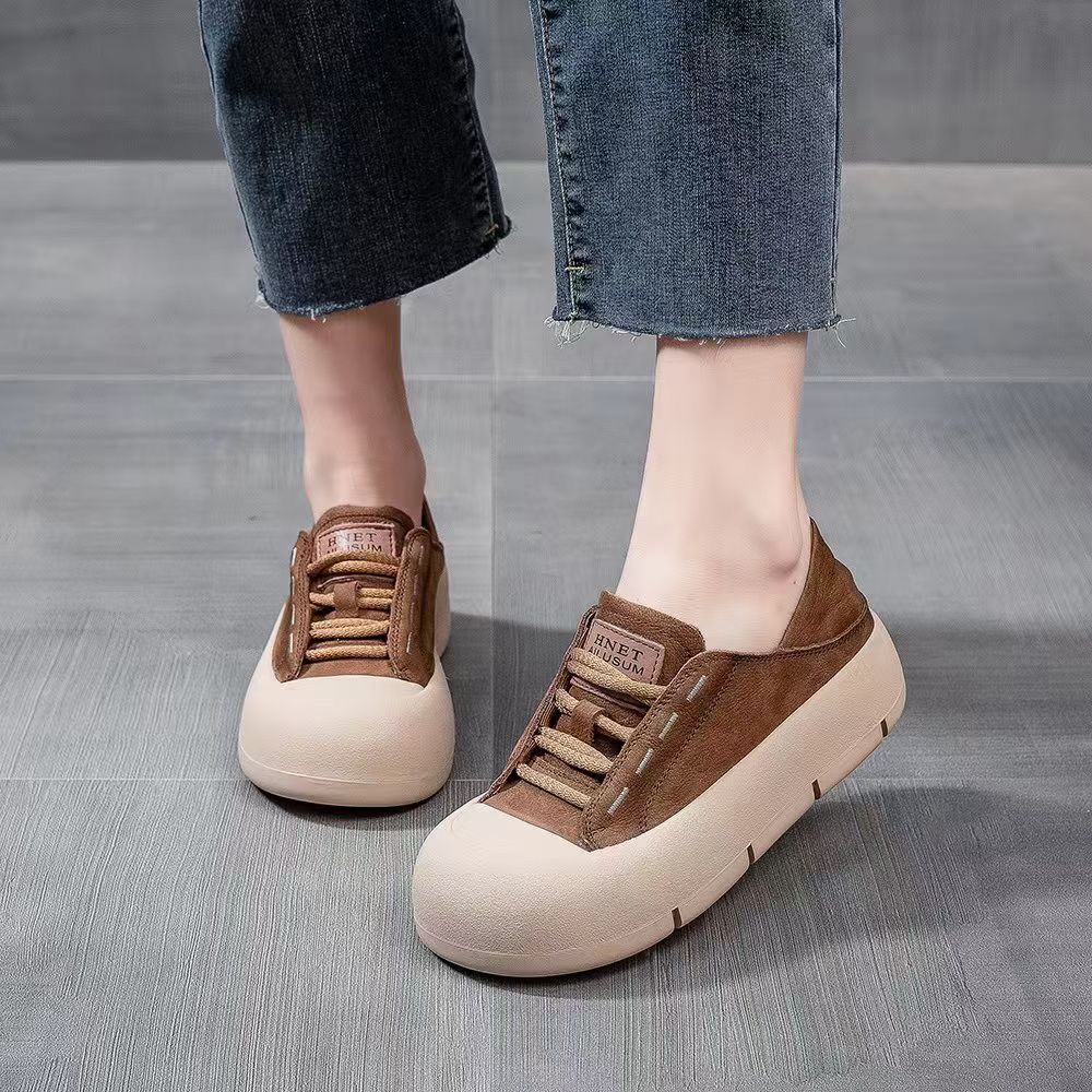 酷步奇2024复古真皮厚底松糕圆头女休闲鞋