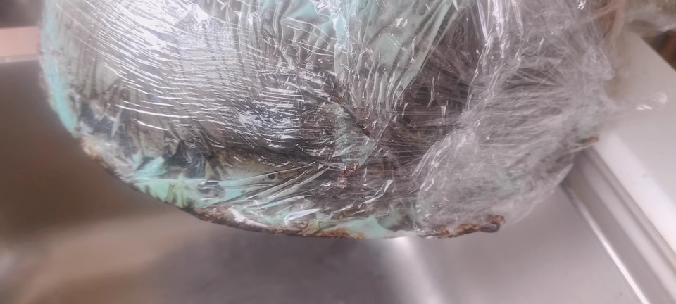 如果你家的锅hin黑hin黑,还可以在厚涂完了之后,覆盖上一层保鲜膜,不让一丢丢成分挥发掉,充分分解每一块黑斑