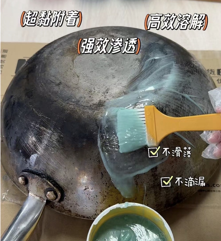 ·若锅底黑垢严重,可厚涂,涂后覆盖一层塑料膜,并延长静止时间。