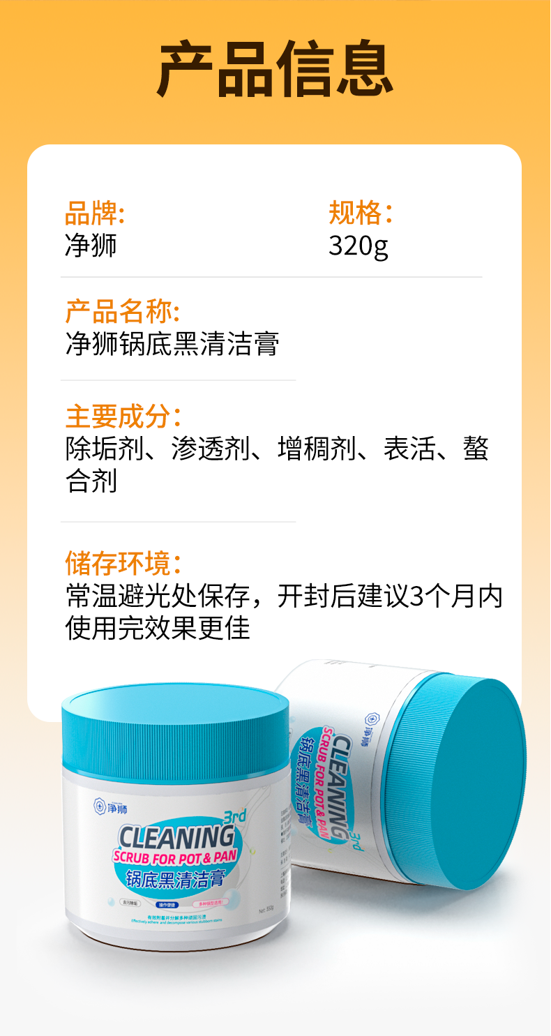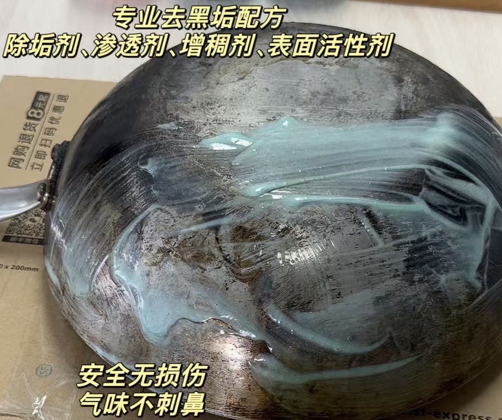 强效渗透到锅底的黑渍、焦渍、油渍,持续乳化分解污垢,