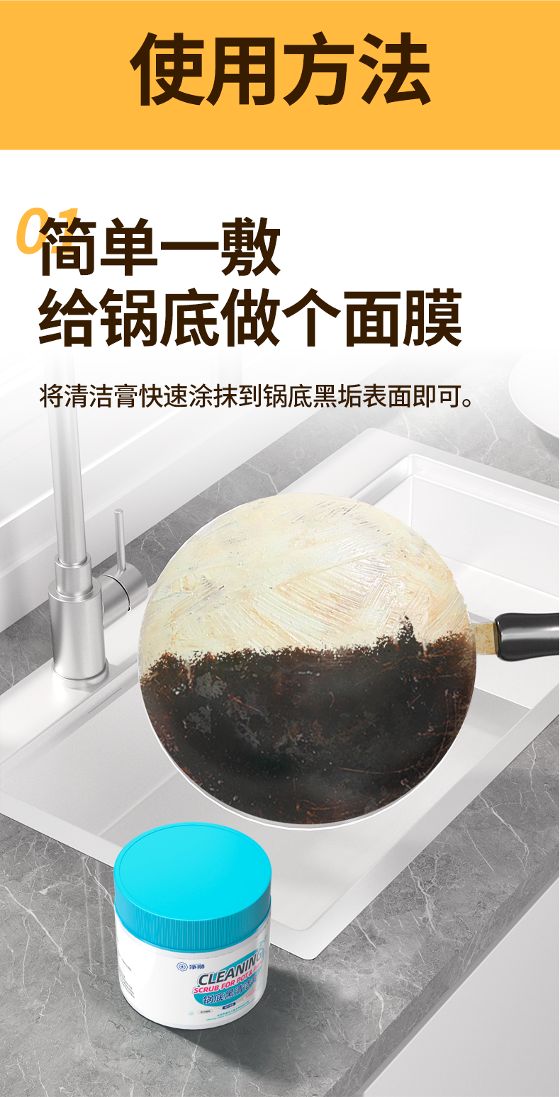 它的使用方法也超级简单,只需要在锅底黑渍的地方厚厚涂抹一层,然后静止几个小时后,用水冲洗干净就行