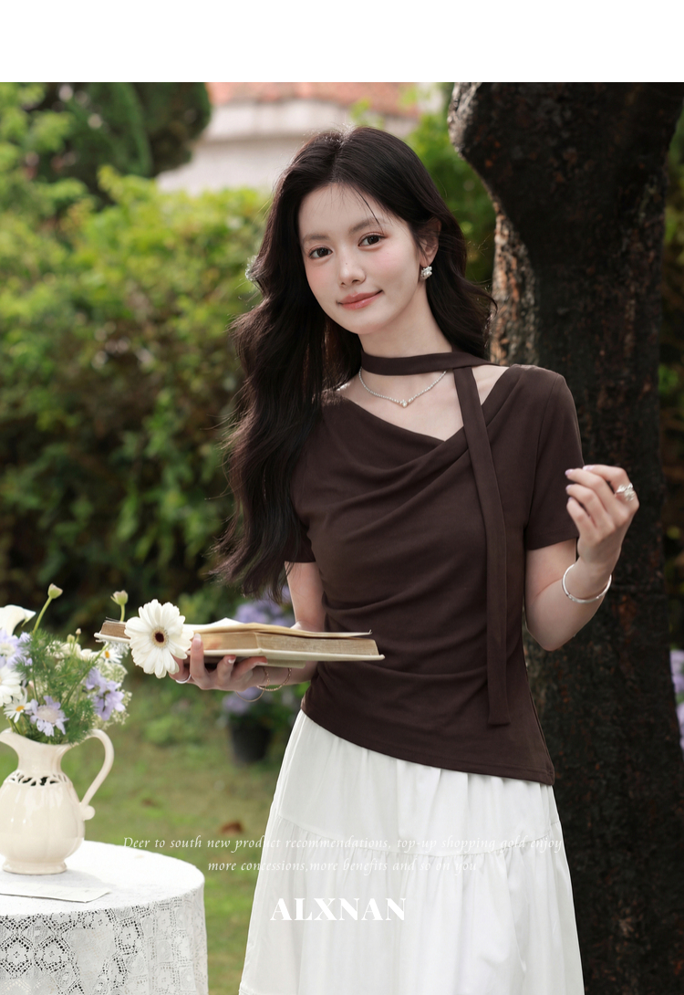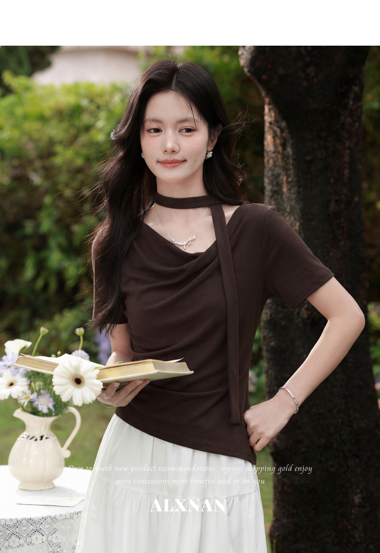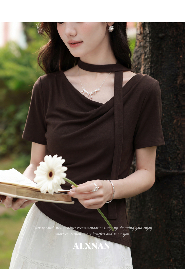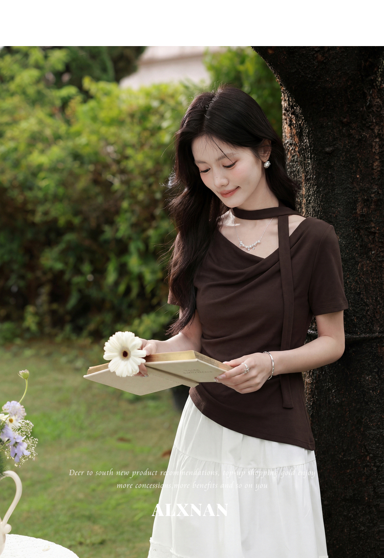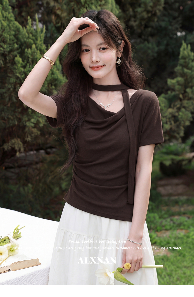鹿向南「晚风序信」设计感咖色T恤女夏新款别致抽褶显瘦短袖上衣