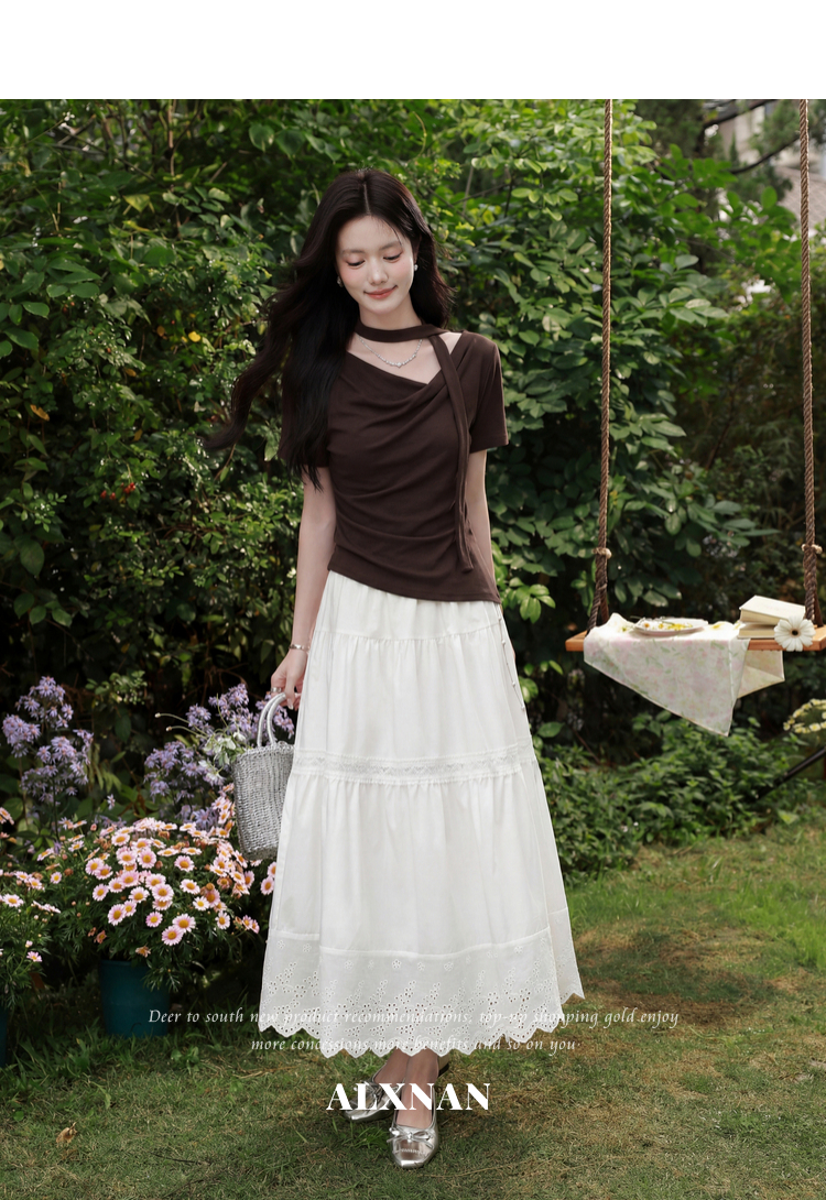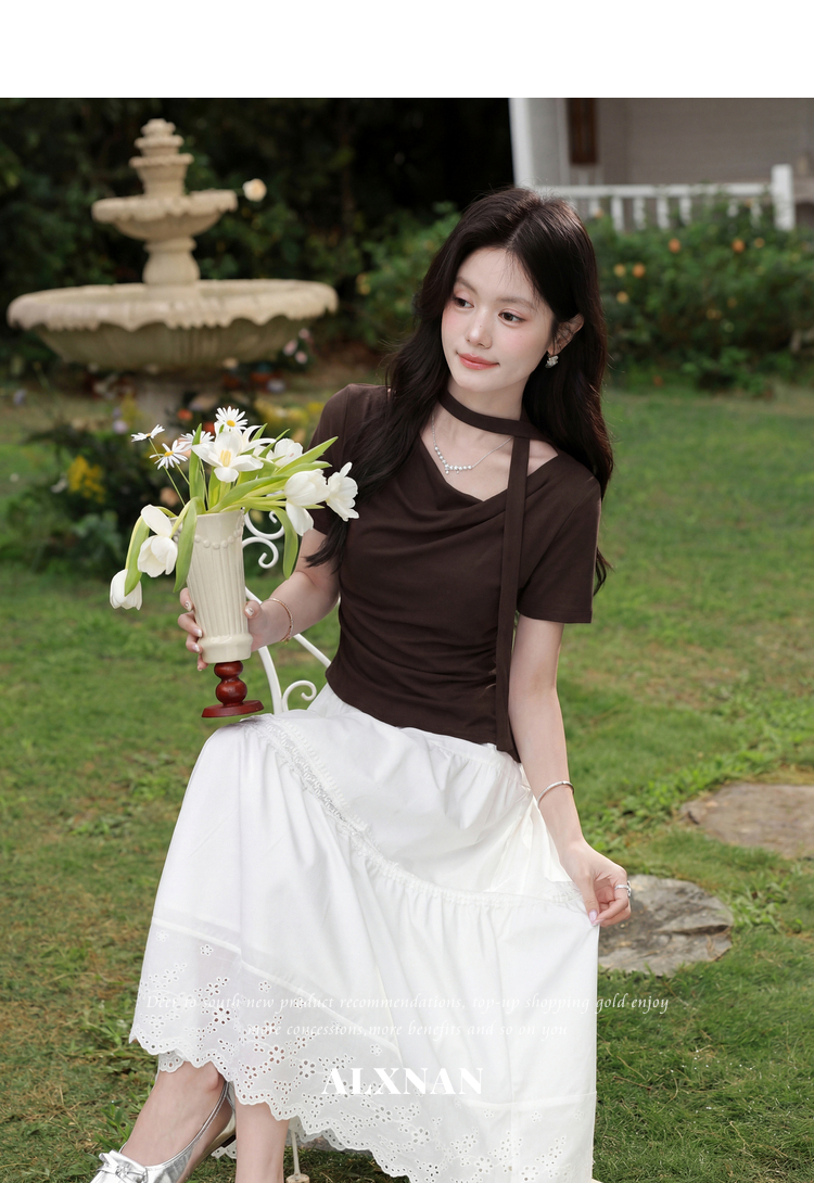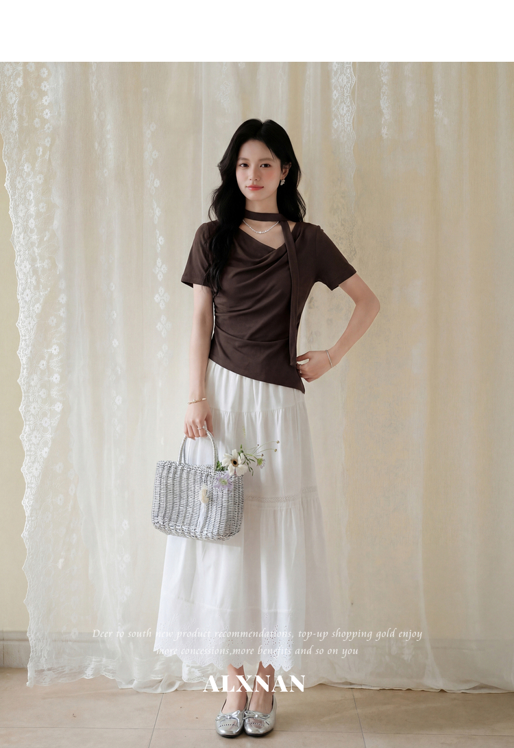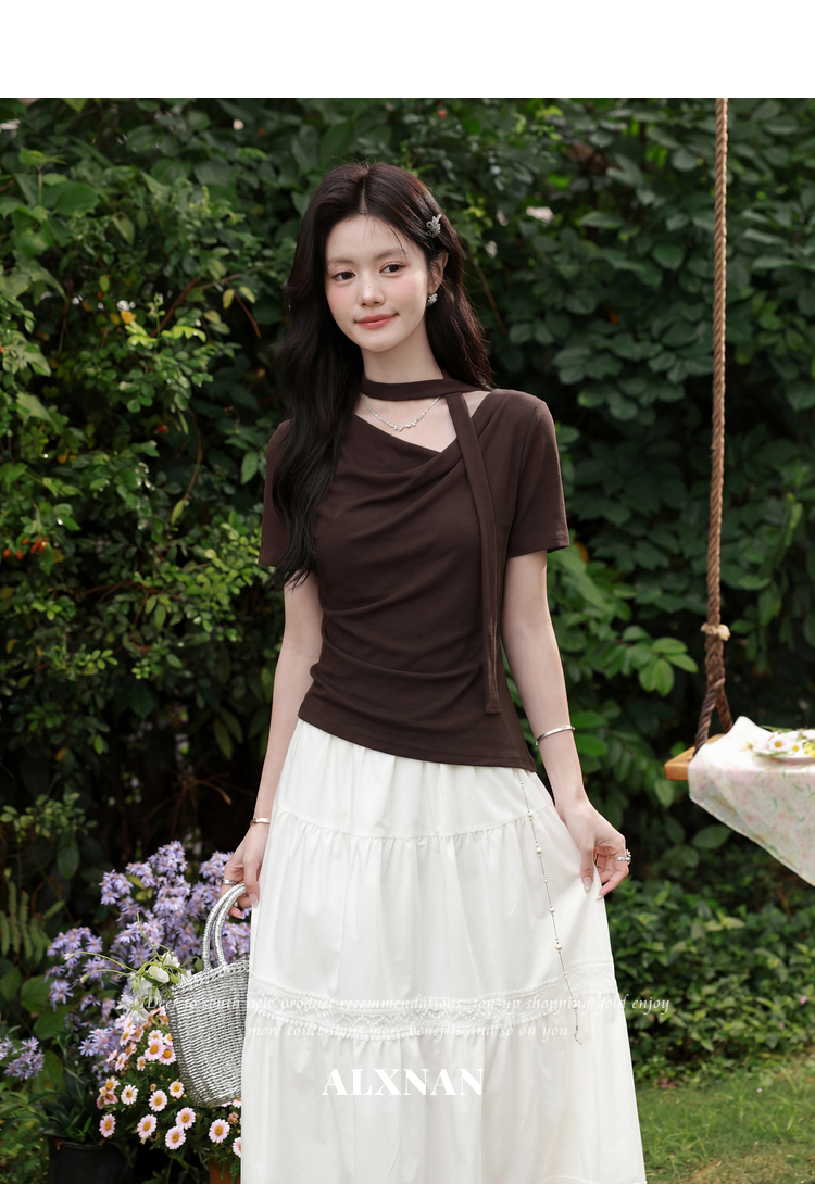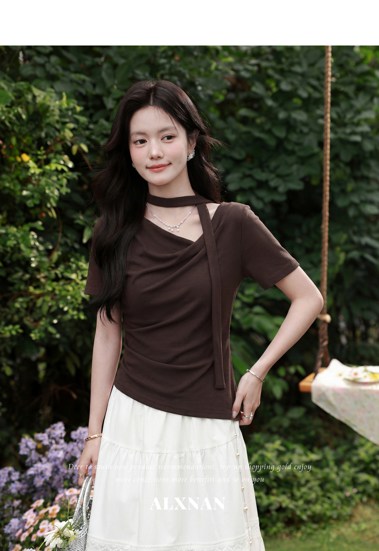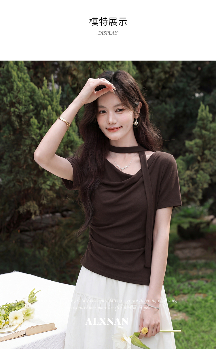 鹿向南「晚风序信」设计感咖色T恤女夏新款别致抽褶显瘦短袖上衣