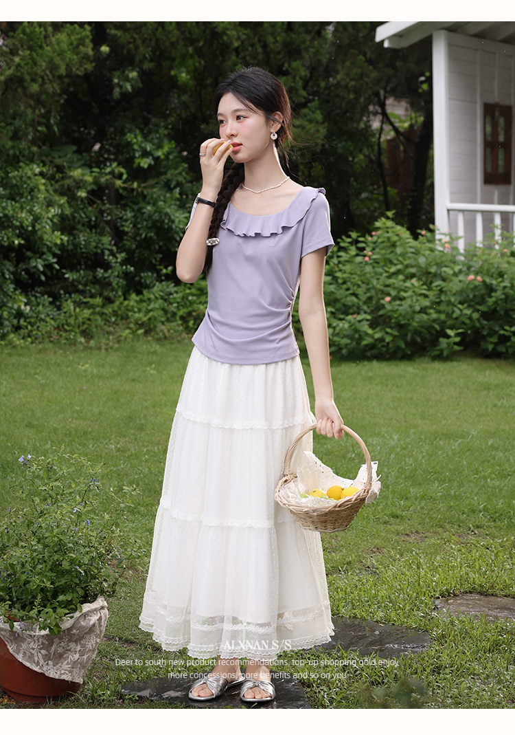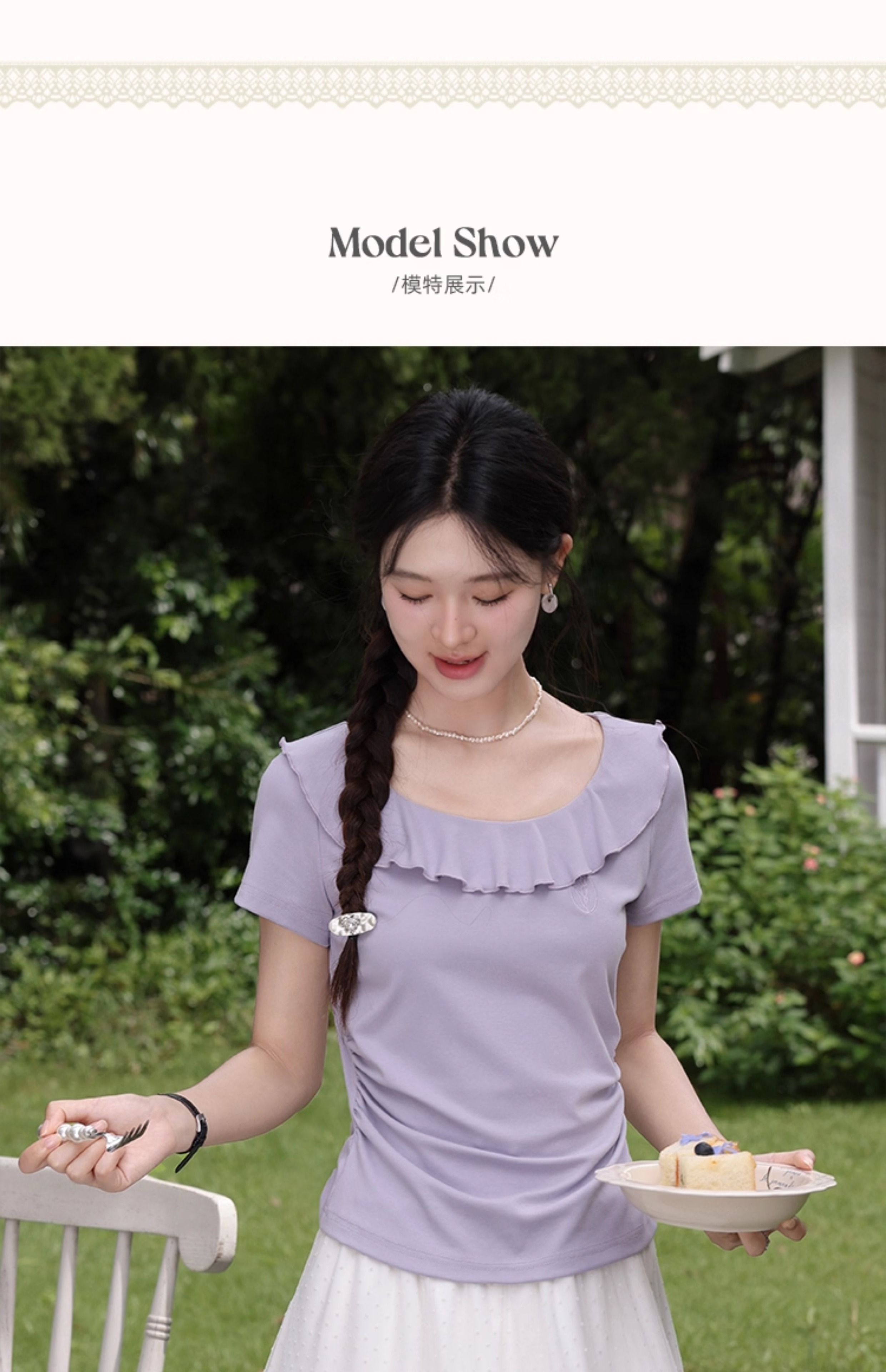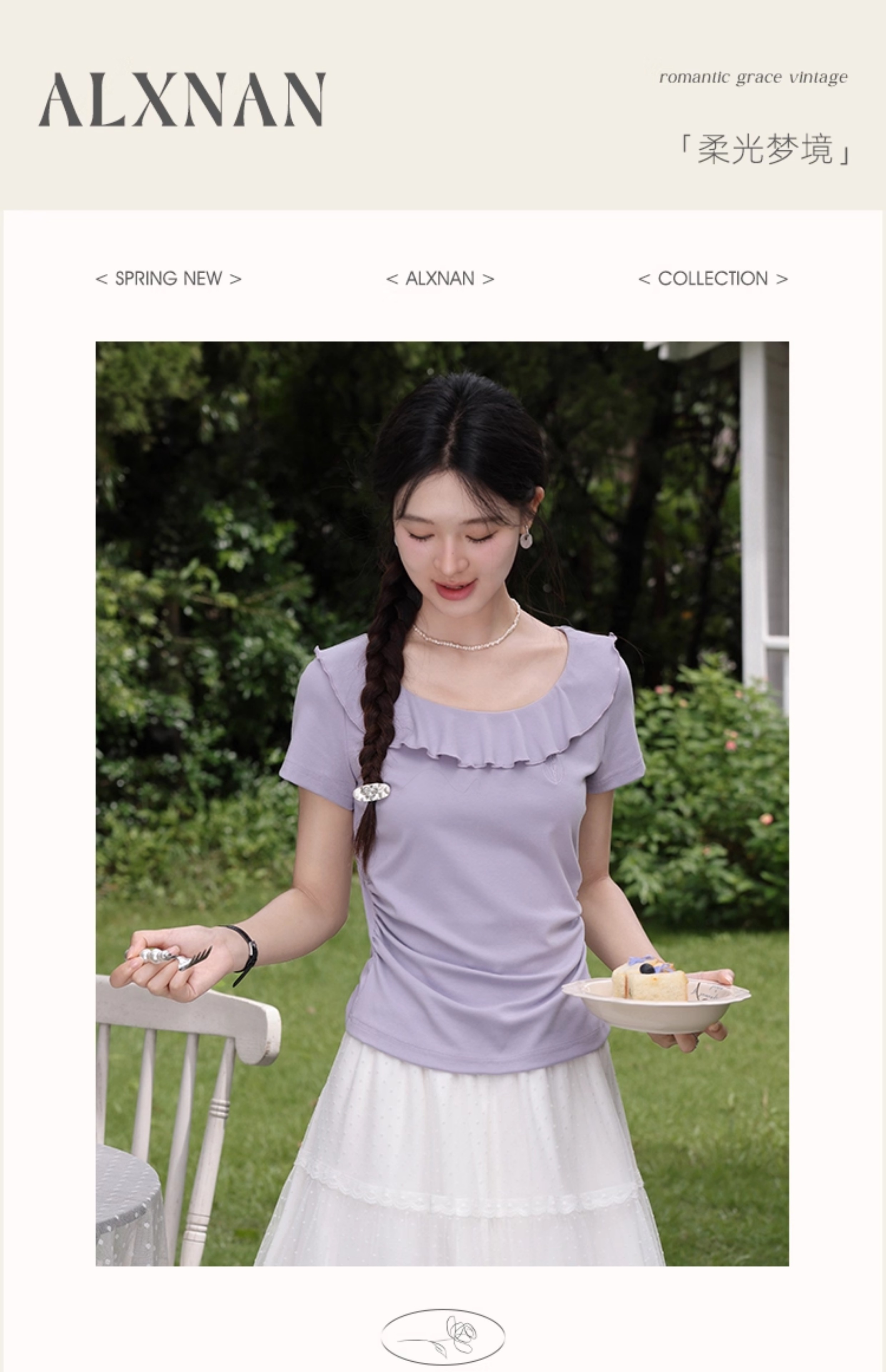 鹿向南「柔光梦境」紫色荷叶边正肩短袖T恤女夏季掐腰设计感上衣