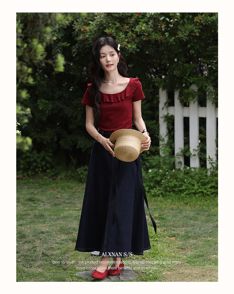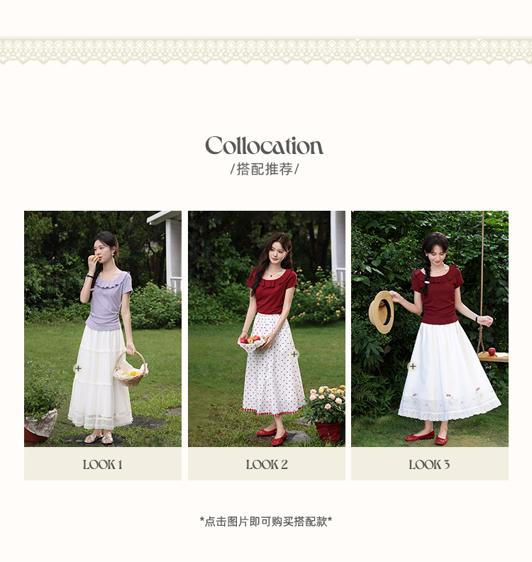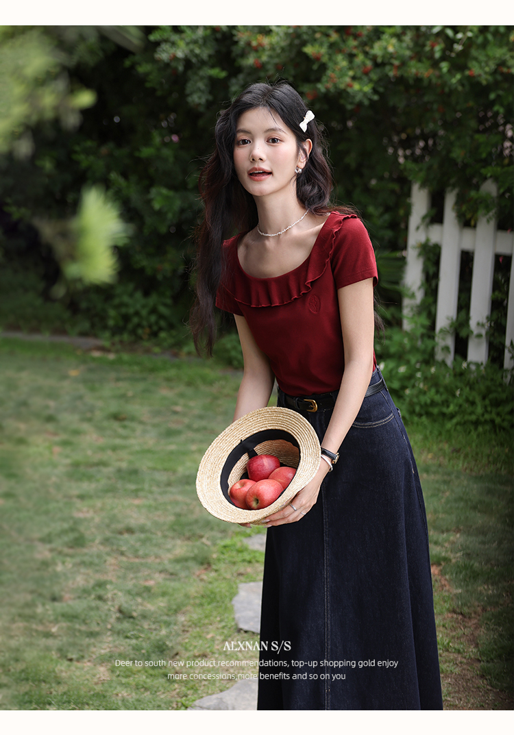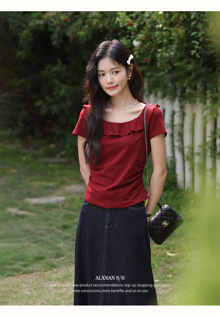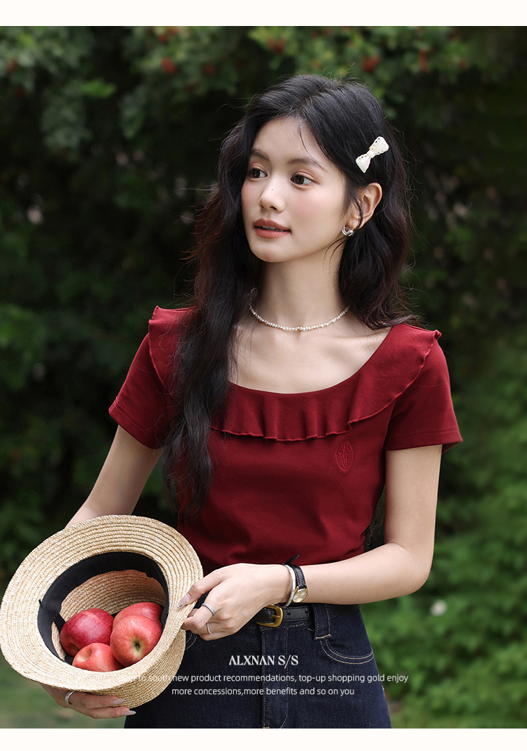 鹿向南「柔光梦境」紫色荷叶边正肩短袖T恤女夏季掐腰设计感上衣