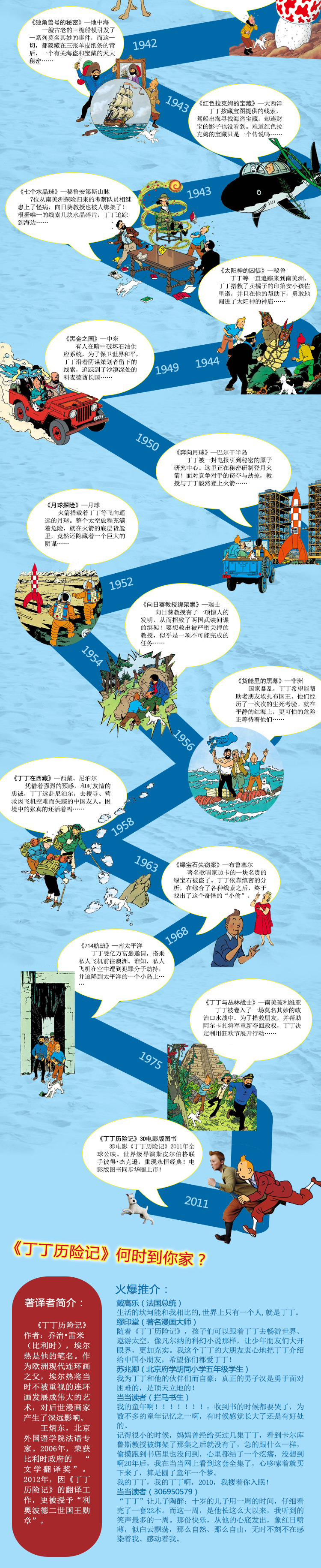 随着《丁丁历险记》,孩子们可以跟着丁丁去畅游世界、遨游太空,像凡尔纳的科幻小说那样,让少年朋友们大开眼界,更加充实。我这个丁丁的大朋友衷心地把丁丁介绍给中国小朋友,希望你们都爱丁丁!