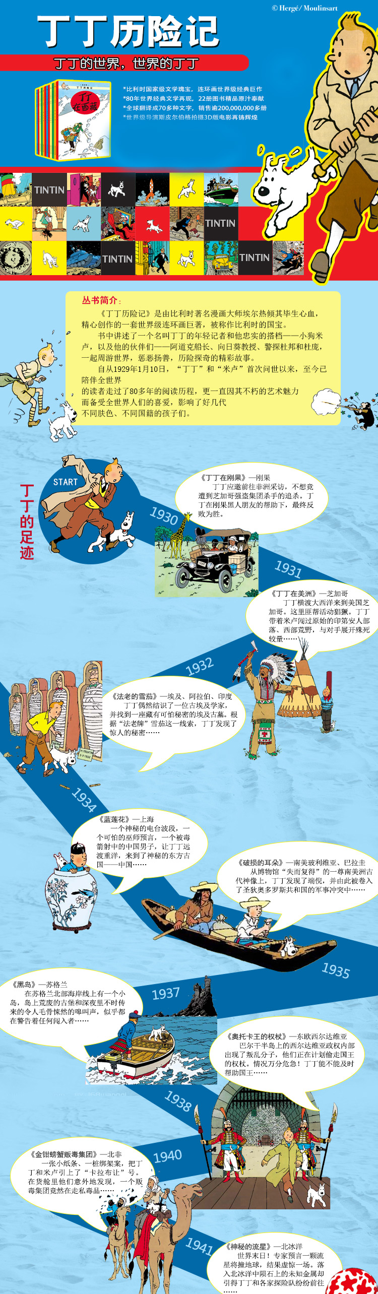 “丁丁”自问世以来,已经陪伴全世界的读者走过了80年的阅读历程,更一直因其不朽的艺术魅力而备受全世界人们的喜爱。80年来,这部作品在全球总共被翻译成了七十多种文字,销售数字超过2亿册,遍及世界各大洲。