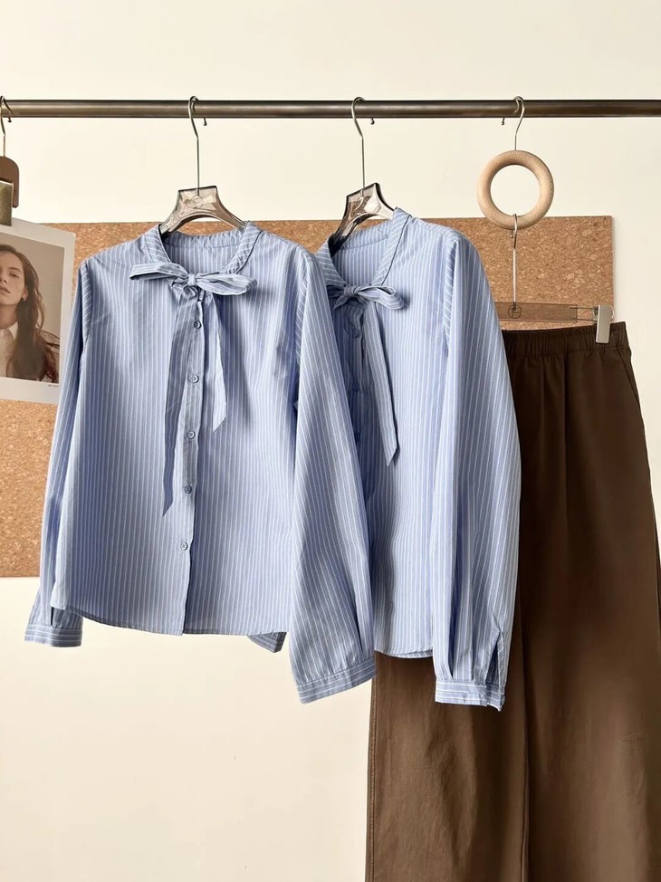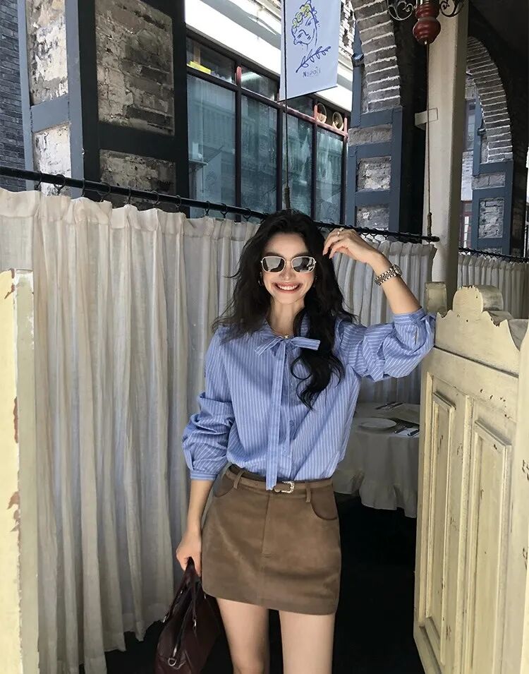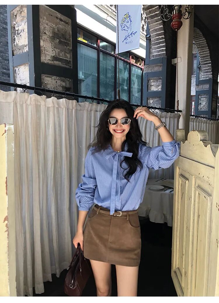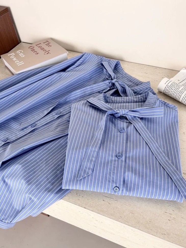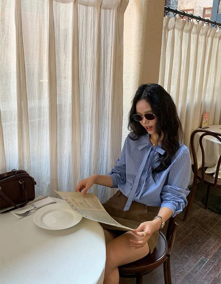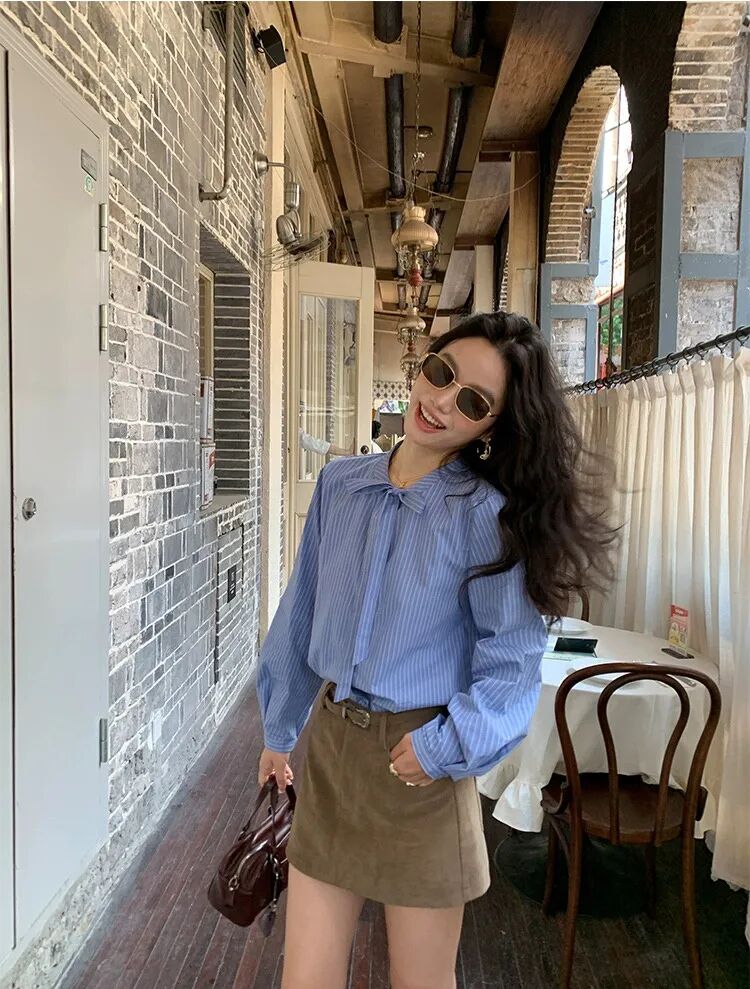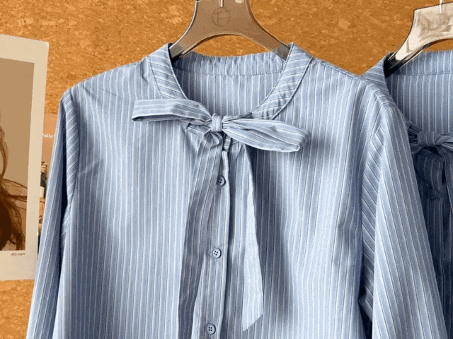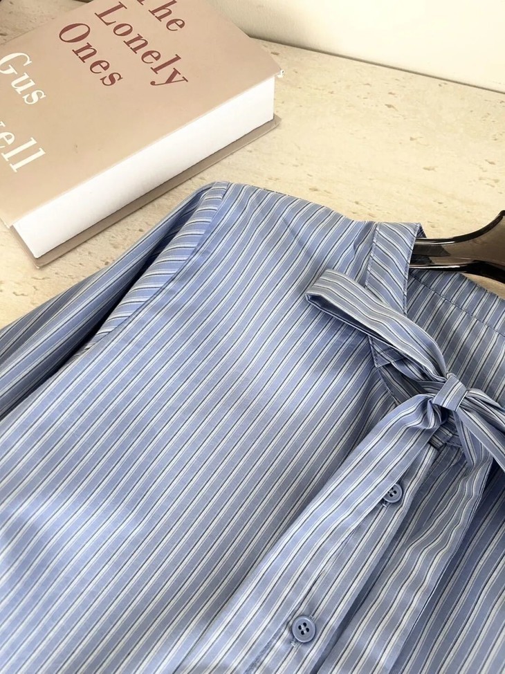 蓝色条纹蝴蝶结绑带衬衫,清新又显白,自带一种静谧的文艺感【3-5天发货】