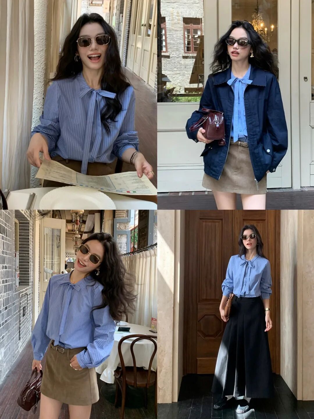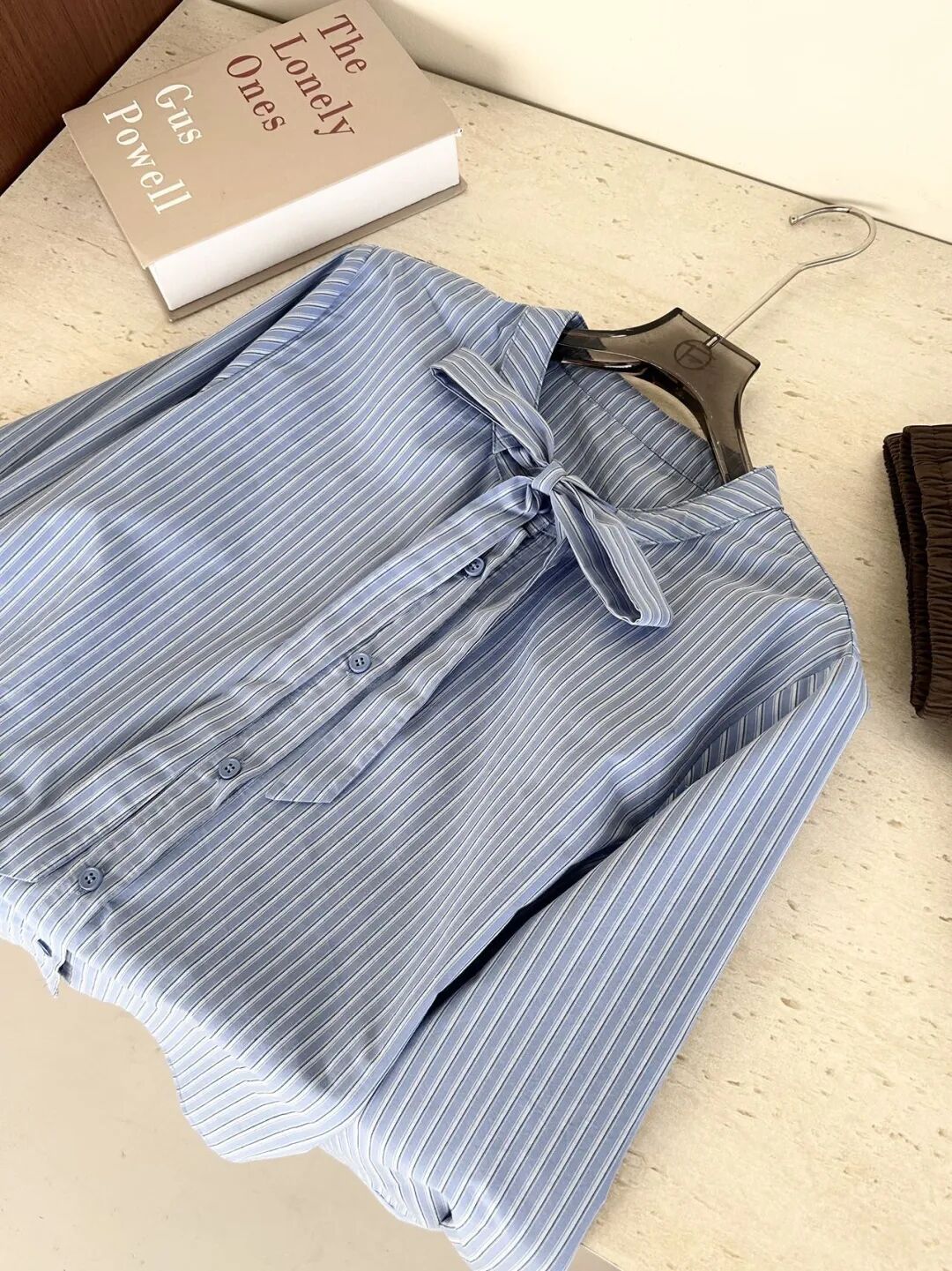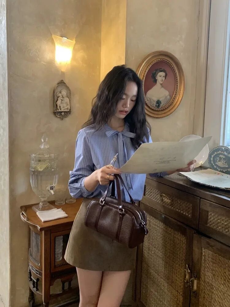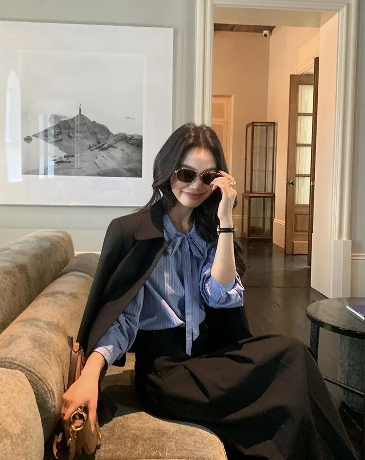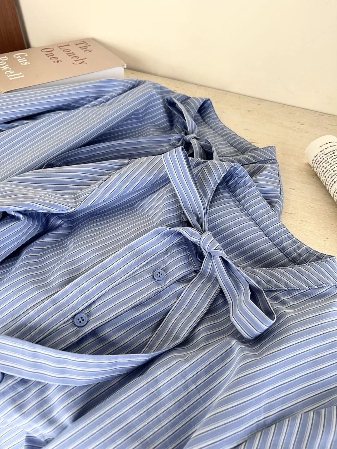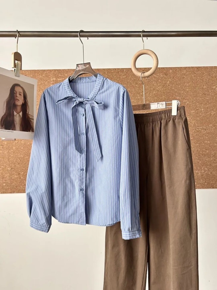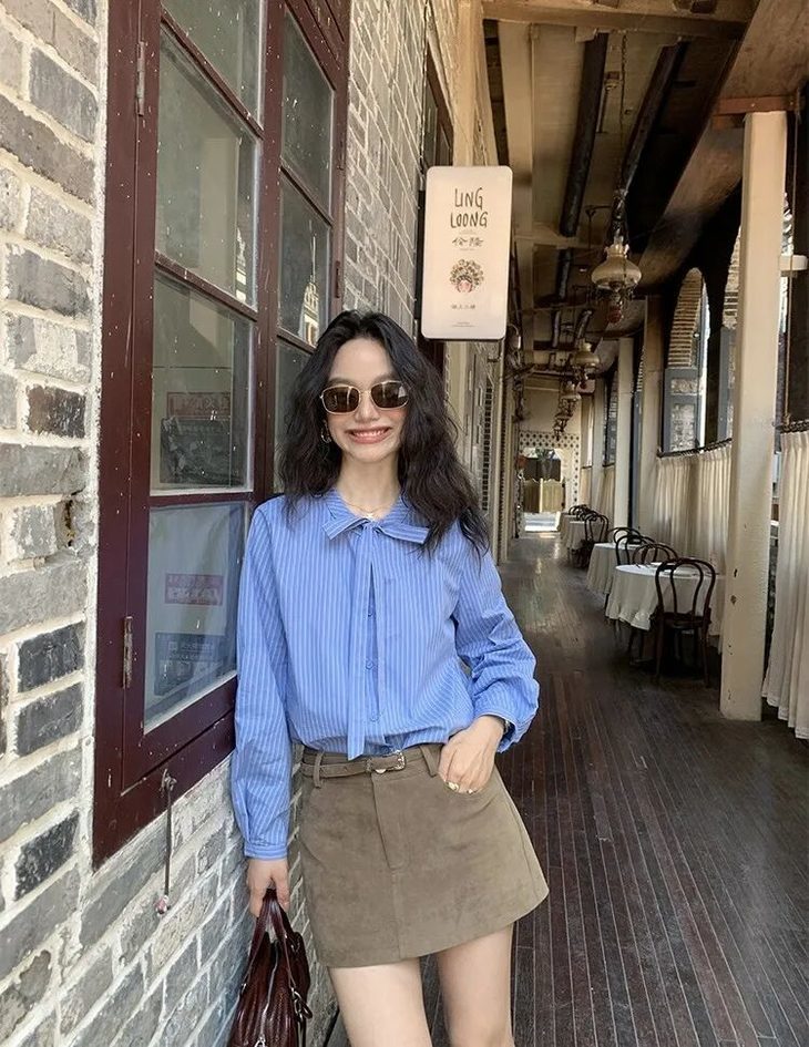 蓝色条纹蝴蝶结绑带衬衫,清新又显白,自带一种静谧的文艺感【3-5天发货】