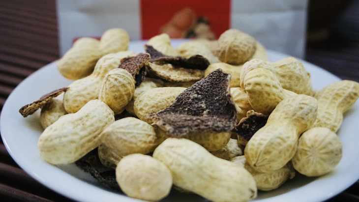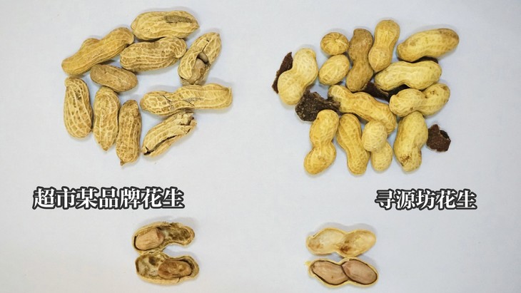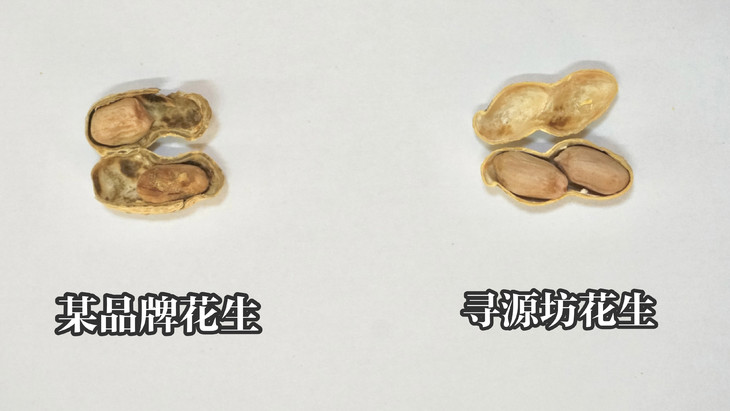 对比超市某品牌花生外壳 看起来略微暗淡, 果仁炒制过火颜色较深, 果仁大小不均匀, 😱甚至霉变。 ⚠️小贴士:温馨提示 坚果类产品采用不新鲜的原料 以及保存不当下会产生大量的黄曲霉素, 所以我们在选购和保存 花生类食品和制品同时, 要极其注意! 精选陈皮花生, 有着极高的食品安全品质要求, 严格杜绝原料不好霉变花生。