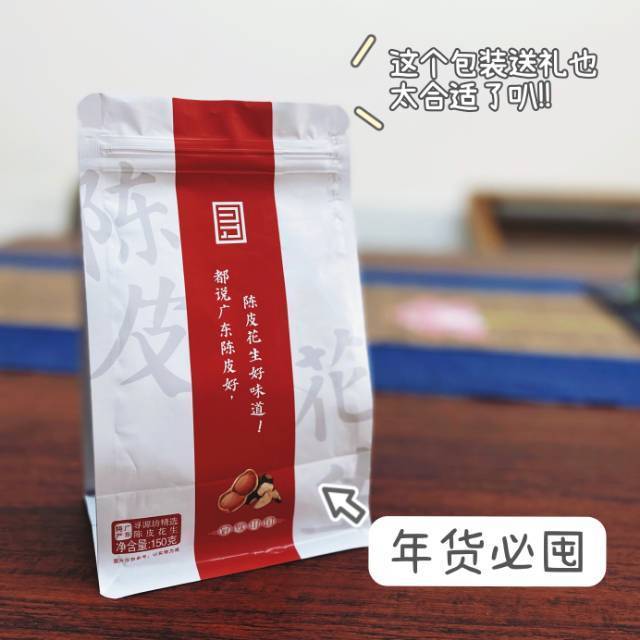 陈皮花生包装介绍 这款包装,白和红简约的配色, 将中国红搭配出一种高级感❤️, 也显得更大方更得体, 并有新年的喜庆之意! 逢年过节串门最适合🎁送它。 在保存方面, 我们选用镀铝材质的包装, 人性化的密封条设置👍, 更好地保存和保护花生的品质, 小容量包装, 不仅更符合每次食用量, 而且也可以有效地杜绝 食物放太久变质和浪费的问题。 😋平时自己食用, 或者过年的时候用来待客, 寻源坊陈皮花生都是极好的选择。