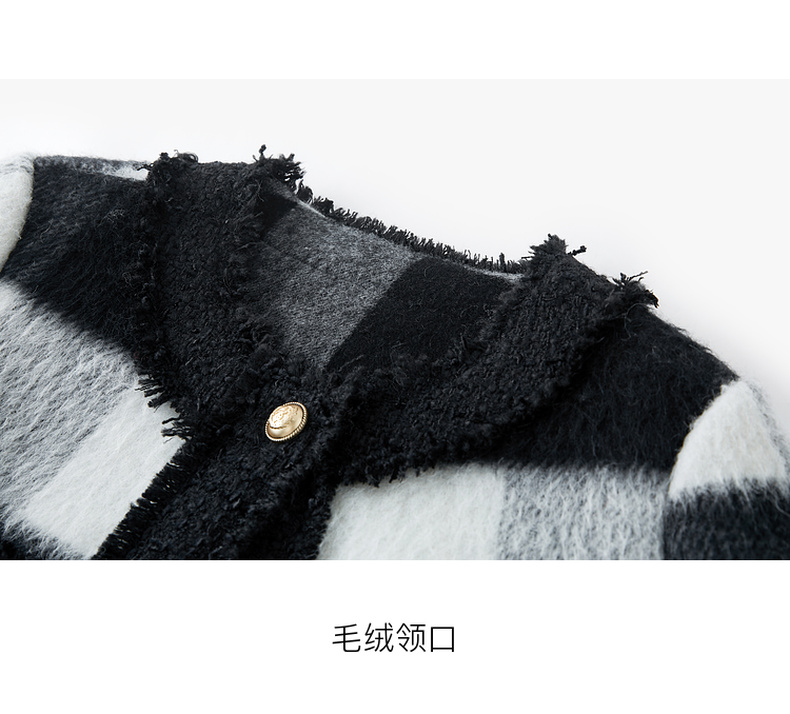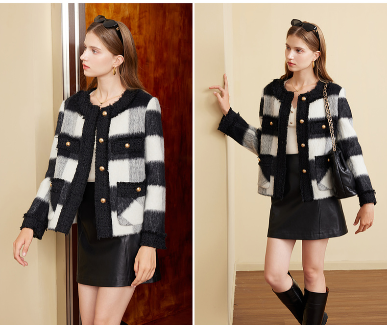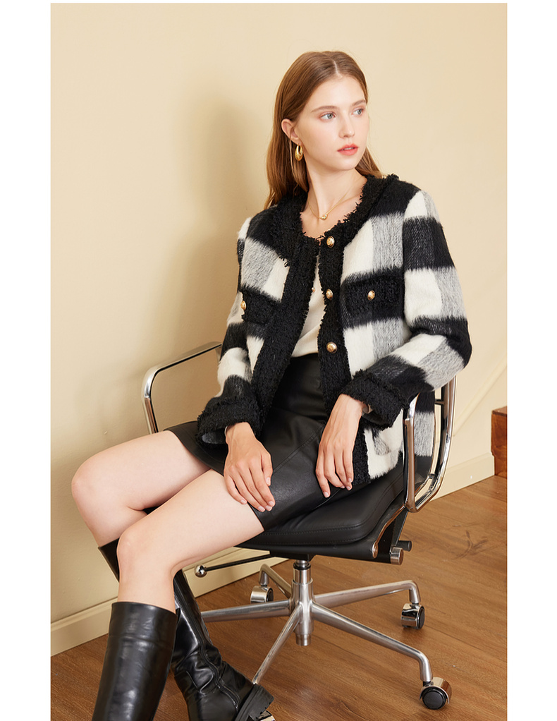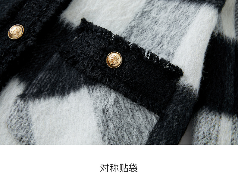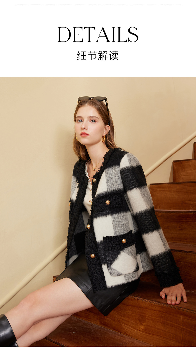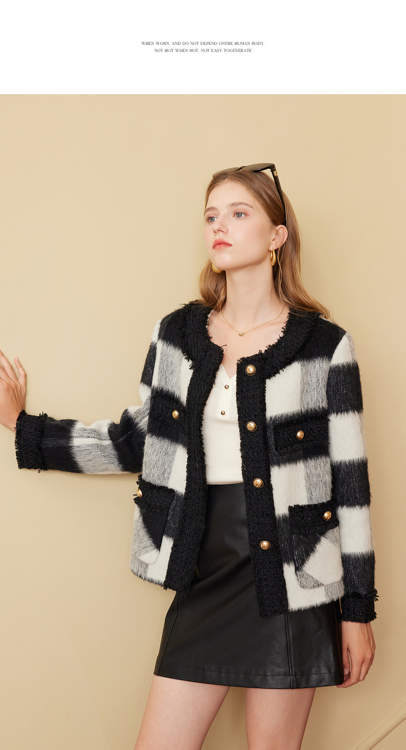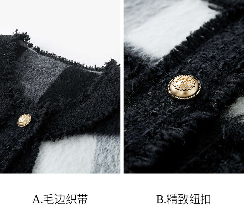 三彩2024冬季新款格纹双面呢大衣短款香风毛边圆领毛呢外套优雅女M