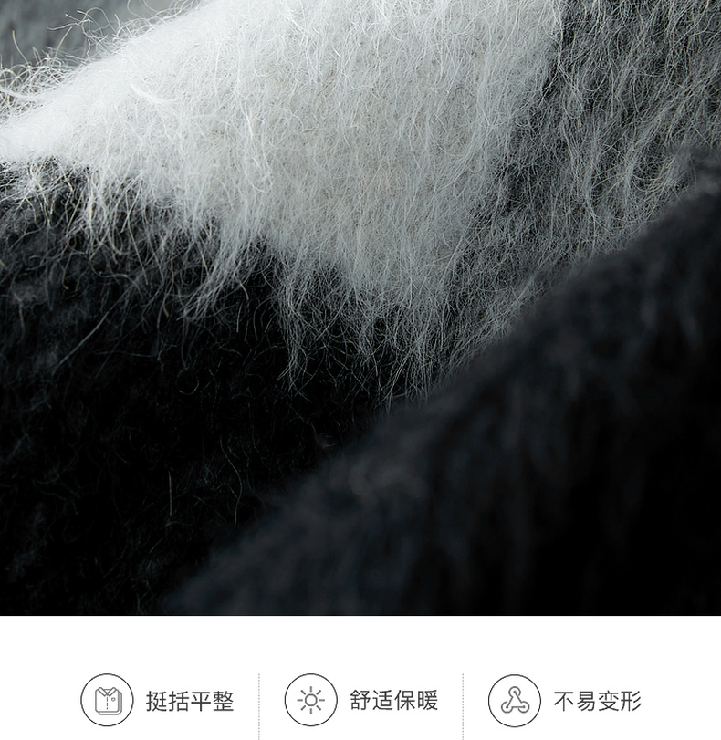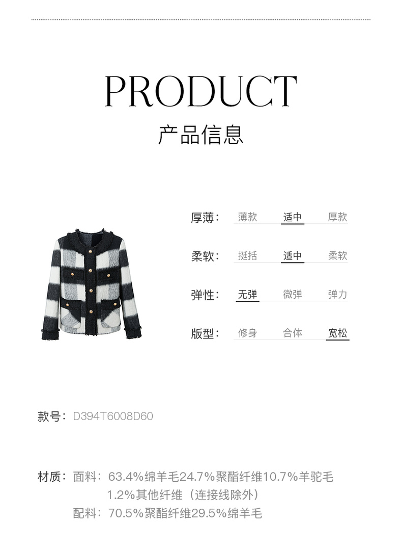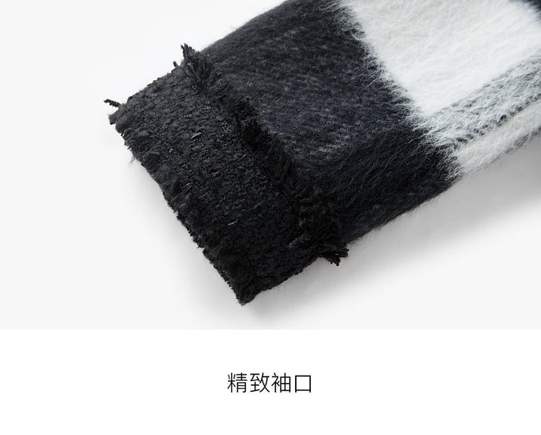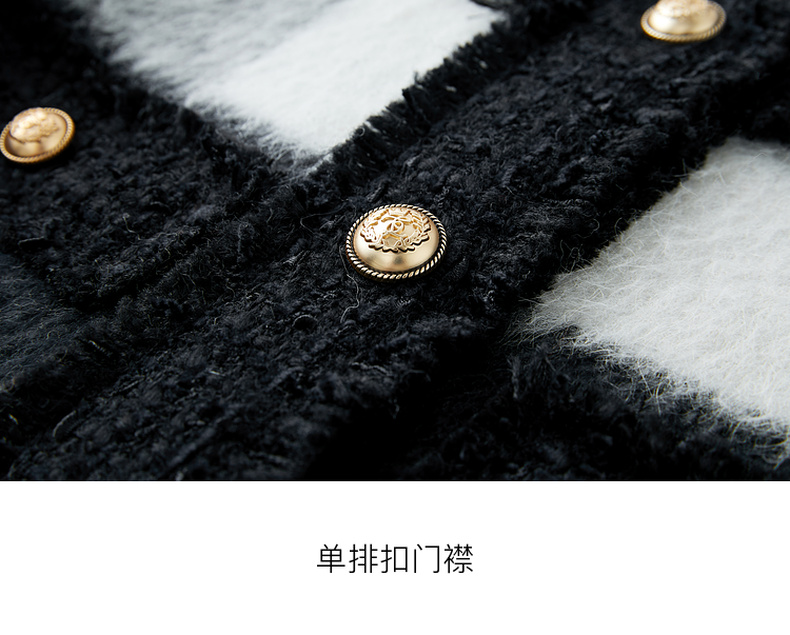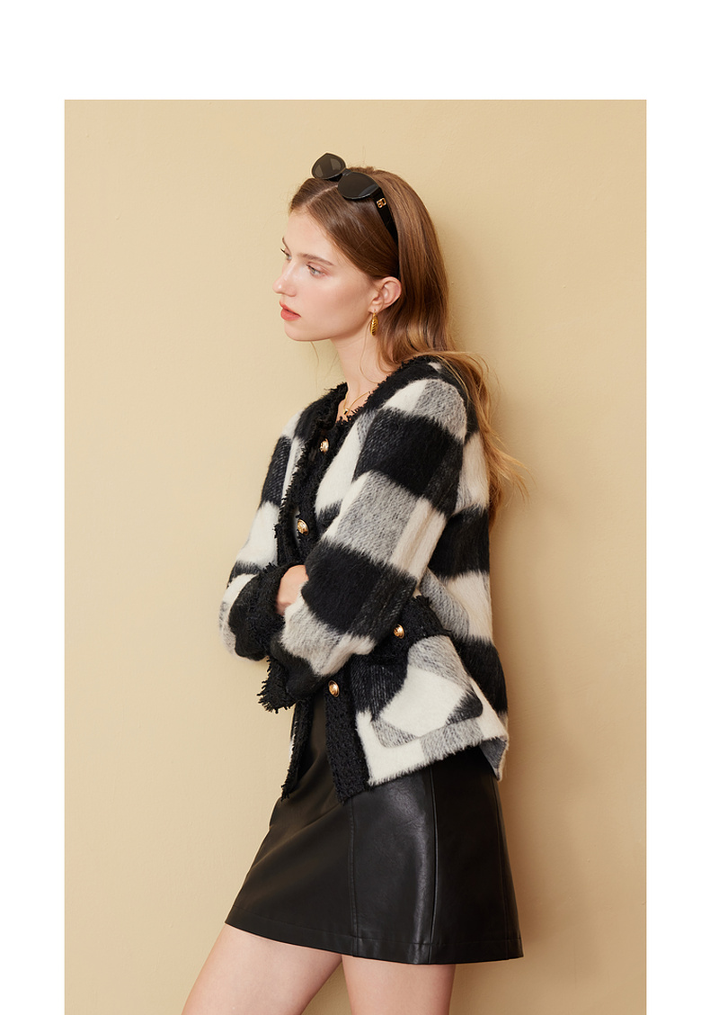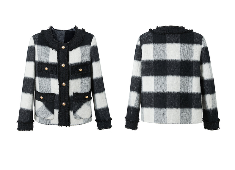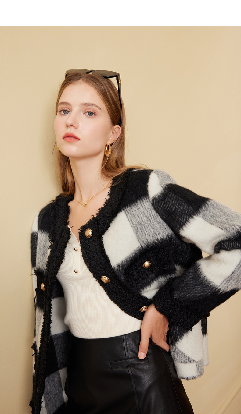 三彩2024冬季新款格纹双面呢大衣短款香风毛边圆领毛呢外套优雅女M