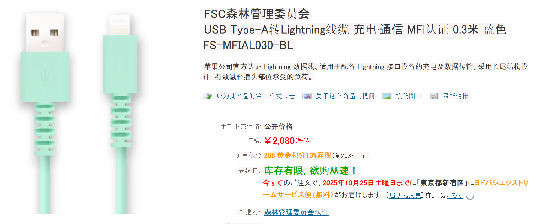 日本 FSC 苹果MFI认证 2.4A USB转lighting数据线 FS-MFIAL030 (0.3米)