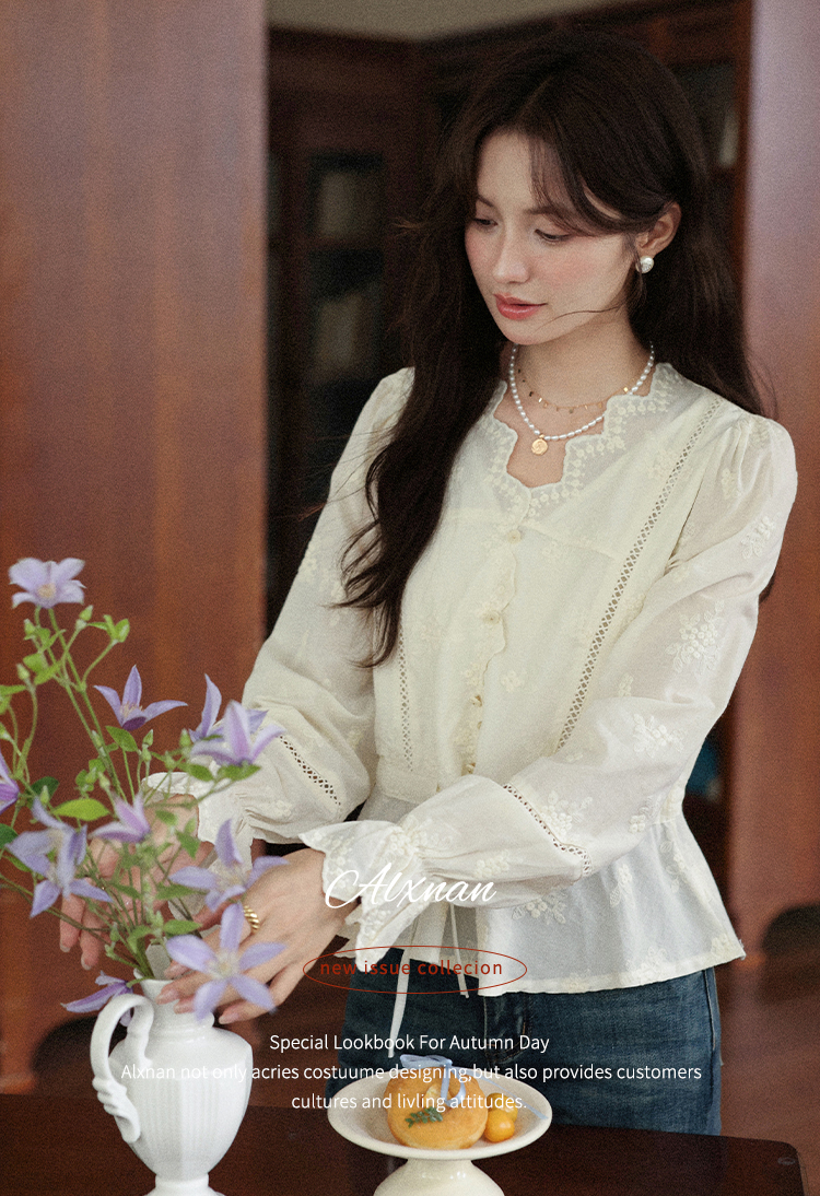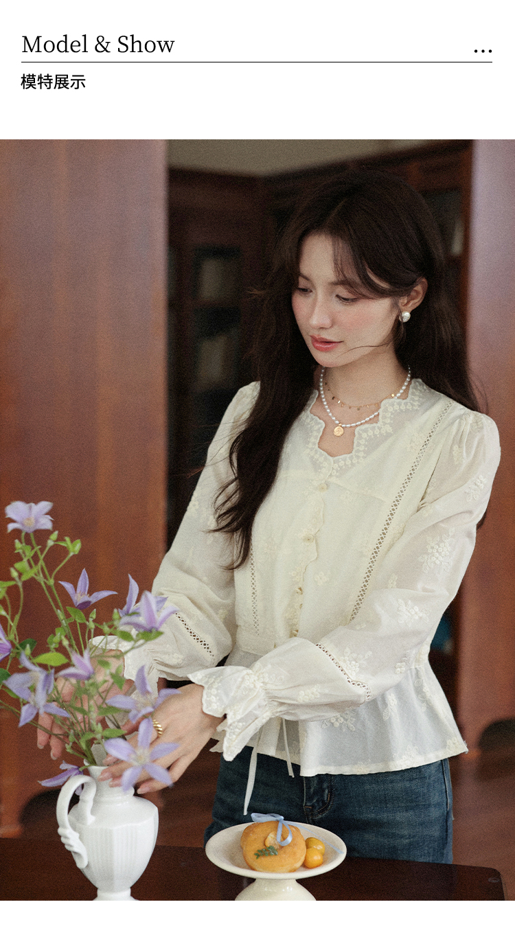 【6折秒杀】鹿向南「洛可可蕾」设计感杏色刺绣荷叶边V领衬衫长袖上衣女初秋