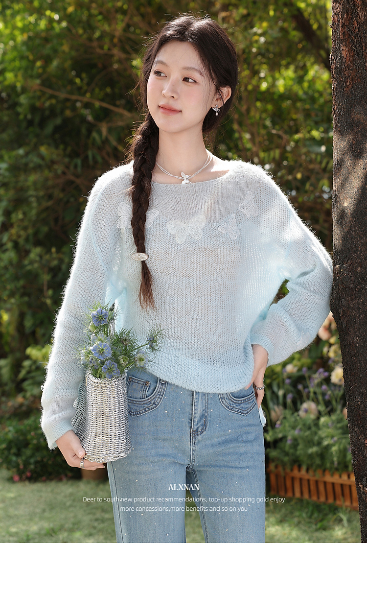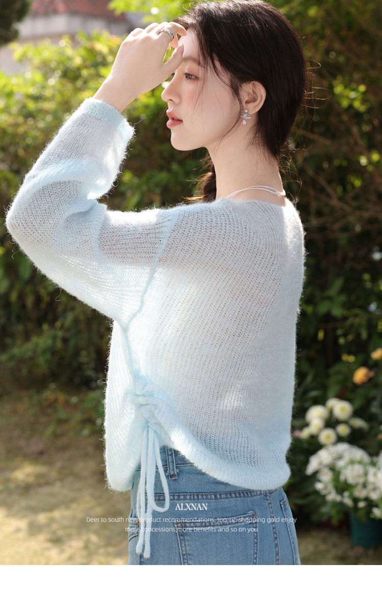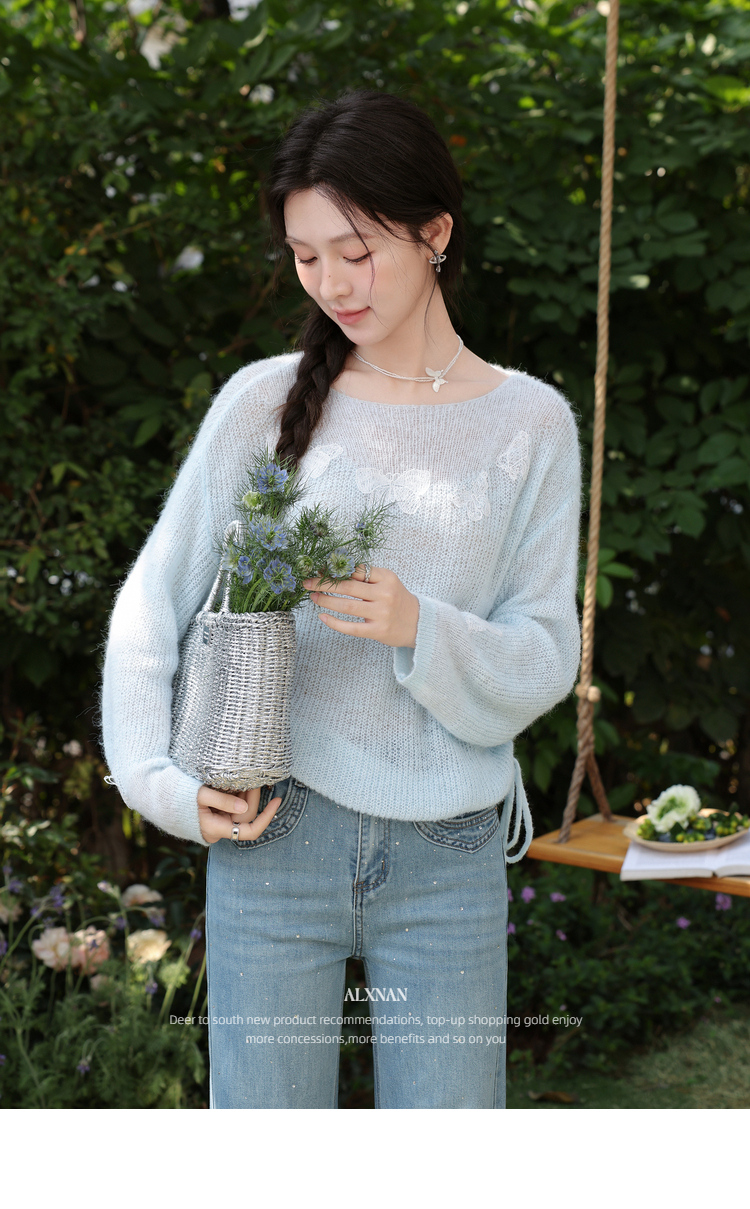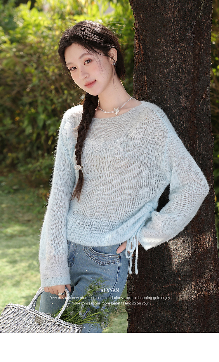 鹿向南「南庄梦蝶」慵懒风蓝色针织衫抽绳女春收腰显瘦蝴蝶上衣