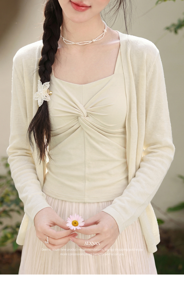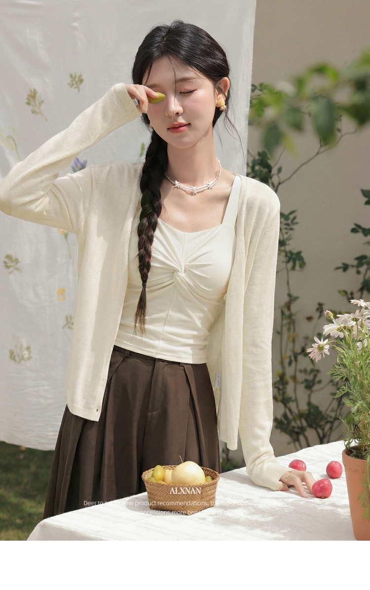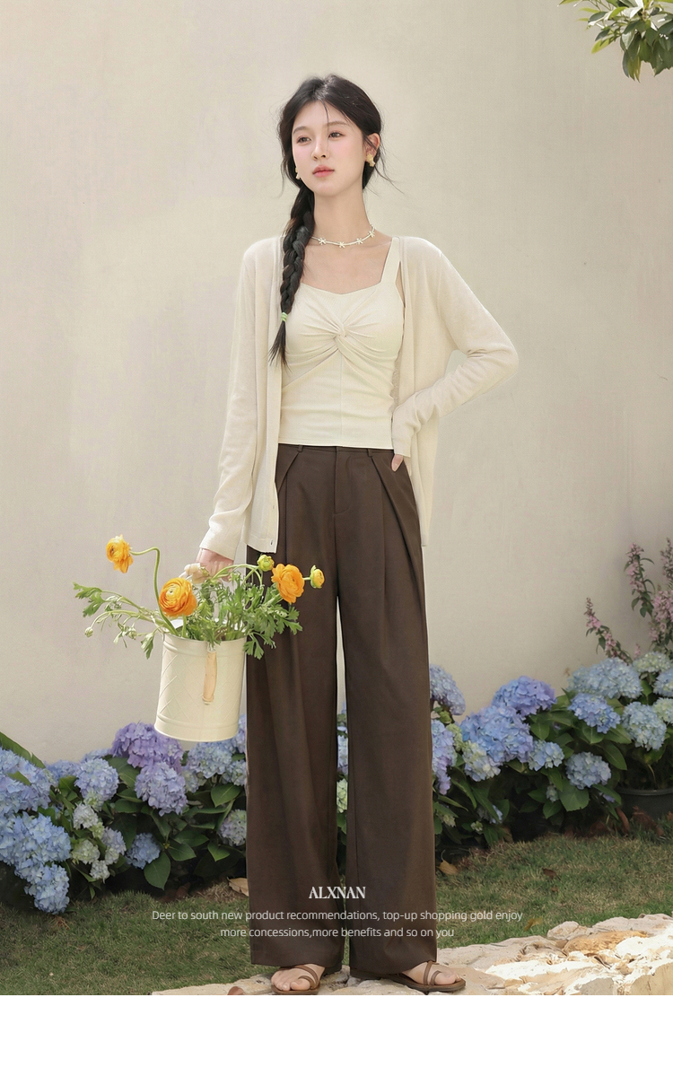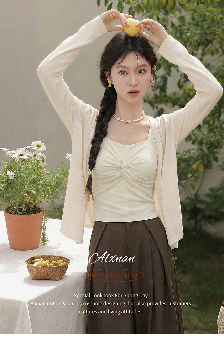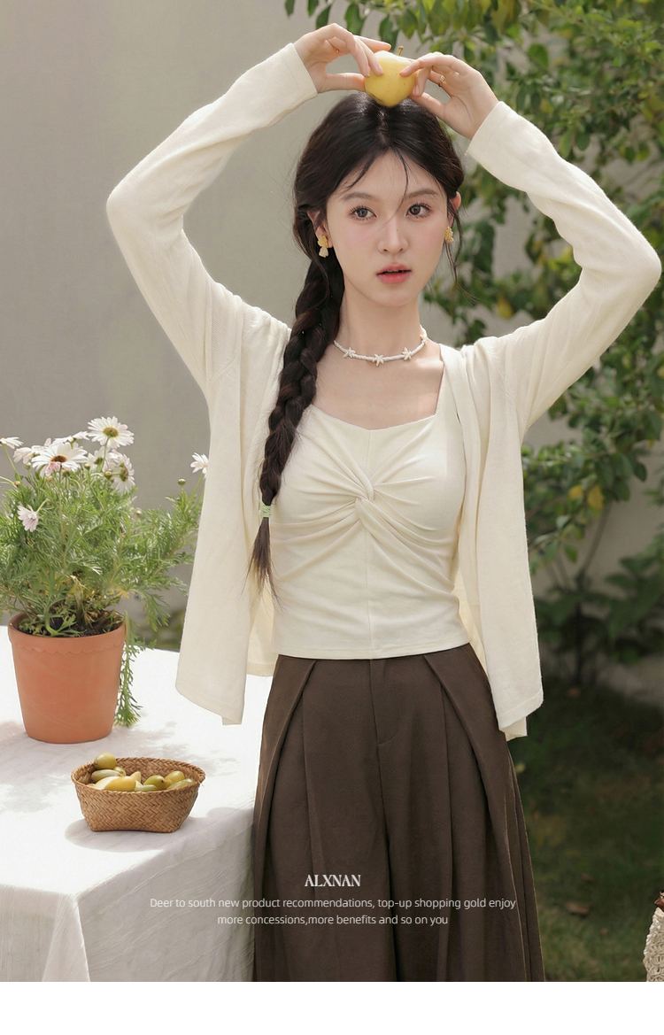 鹿向南「云柔春序」杏色针织开衫女春新款短款无袖背心休闲裤套装