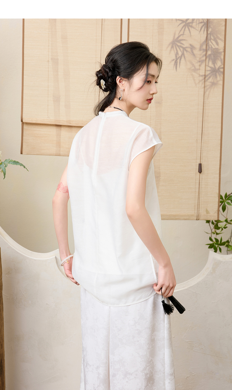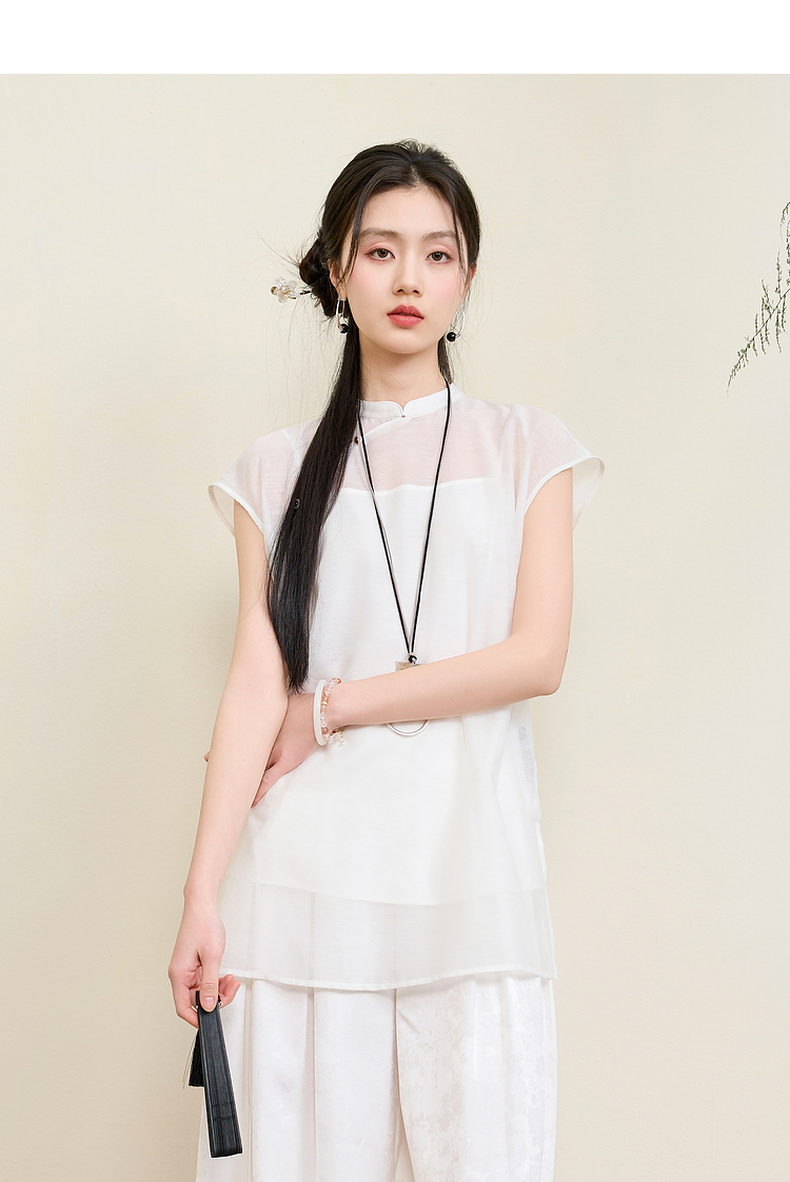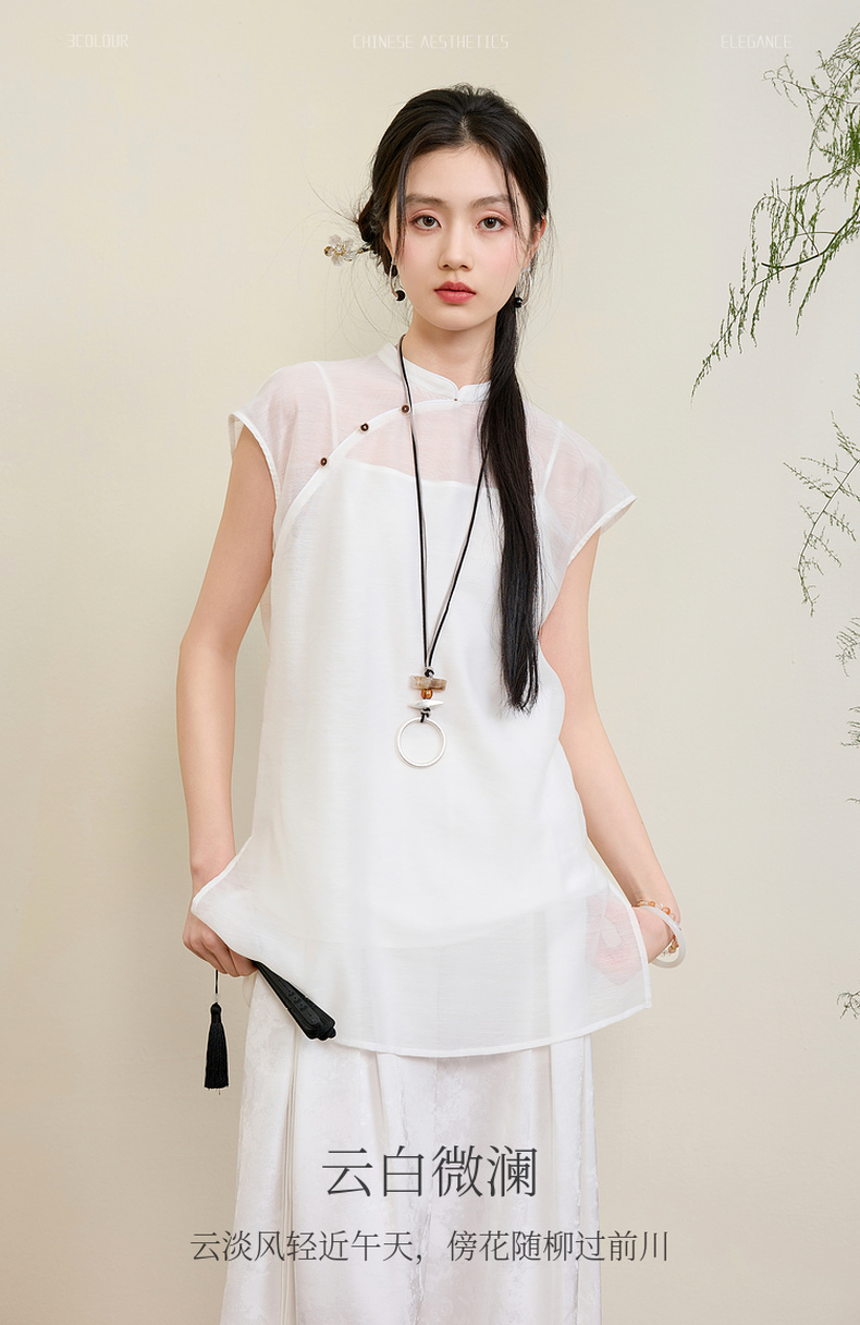 三彩【云白微澜】2025夏季新款新中式立领衬衫吊带两件套宽松C