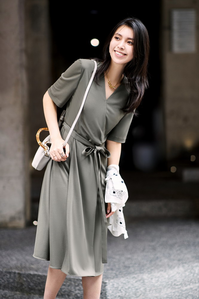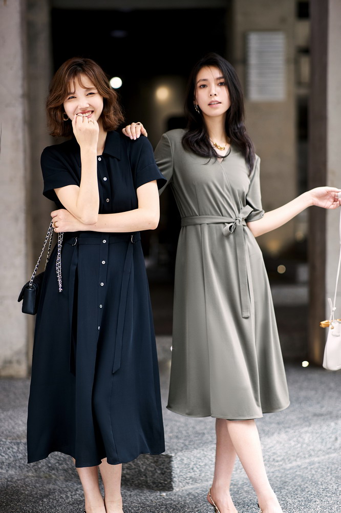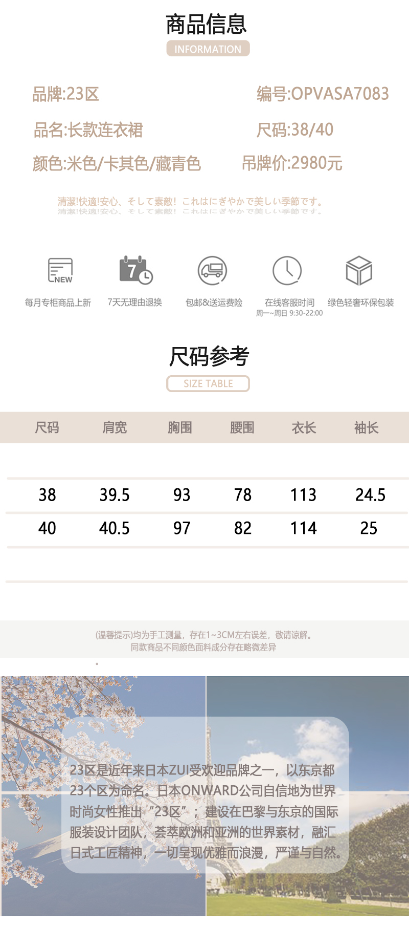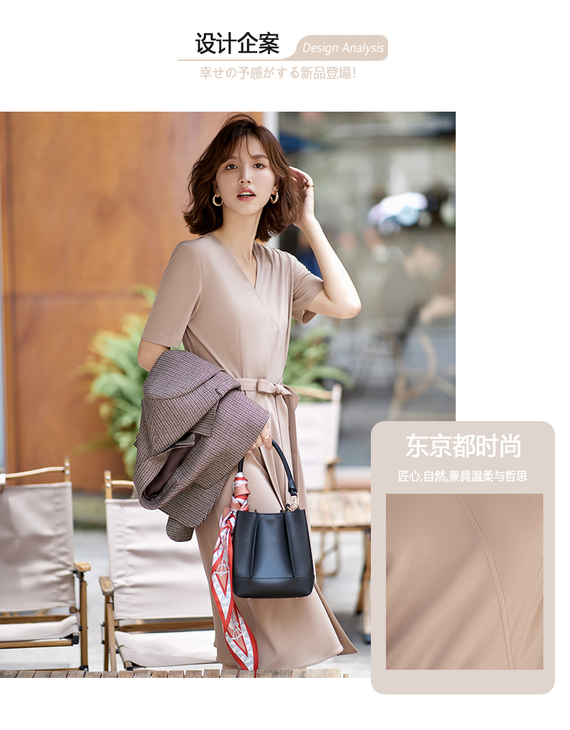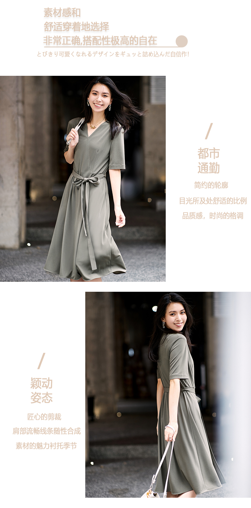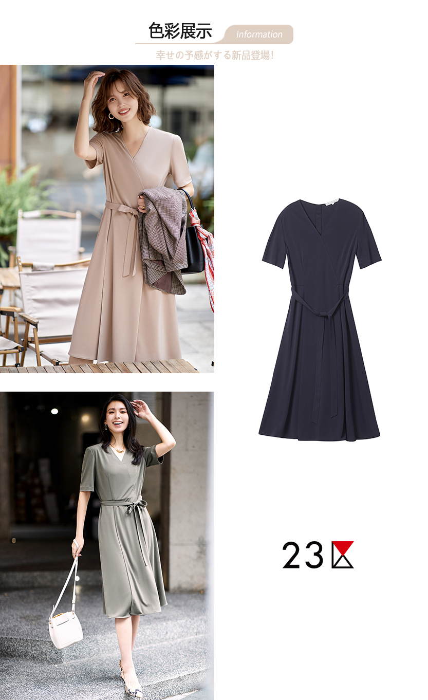 23区日系春夏季通勤修身混纺V领短袖连衣裙可系带连身裙商场同款