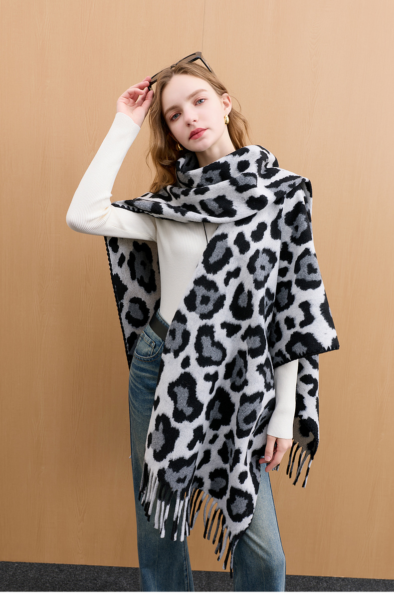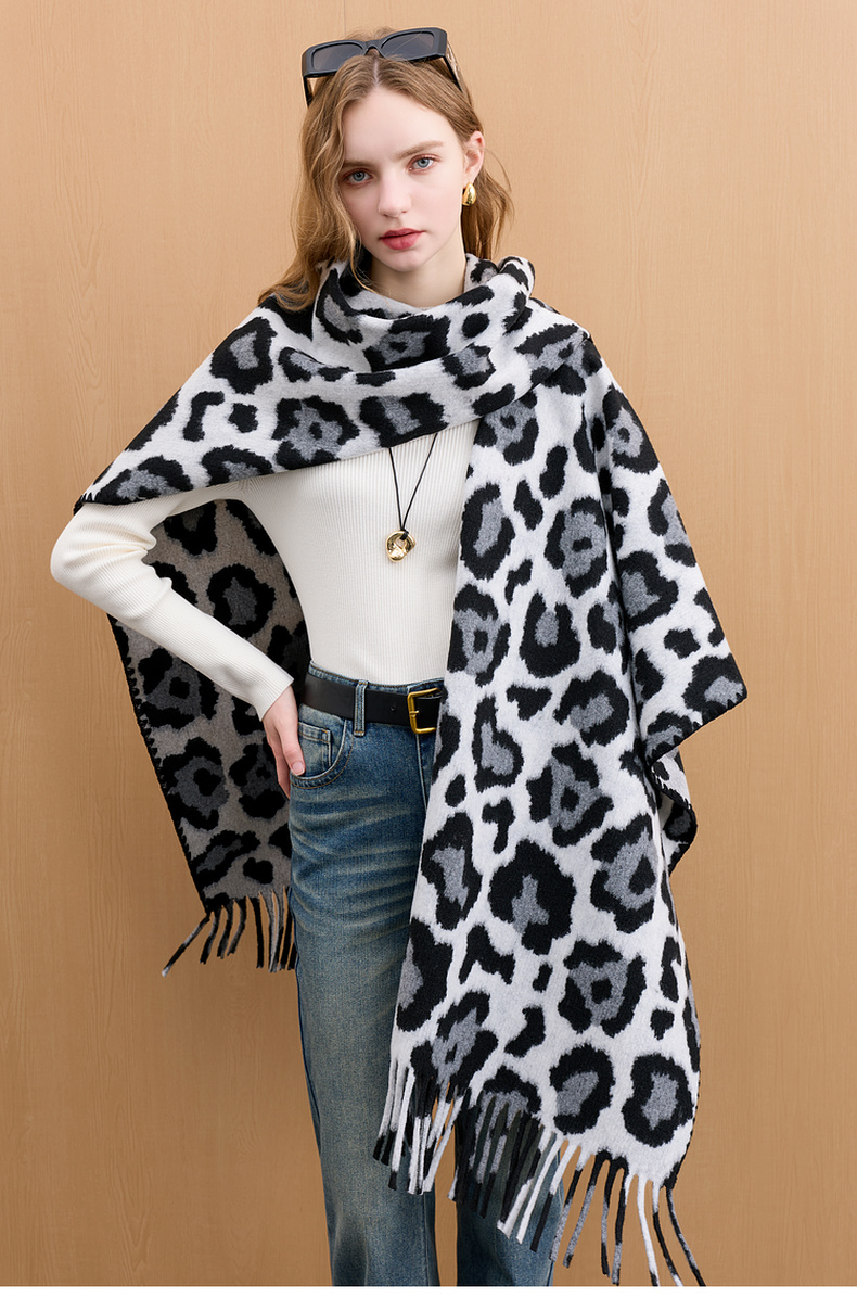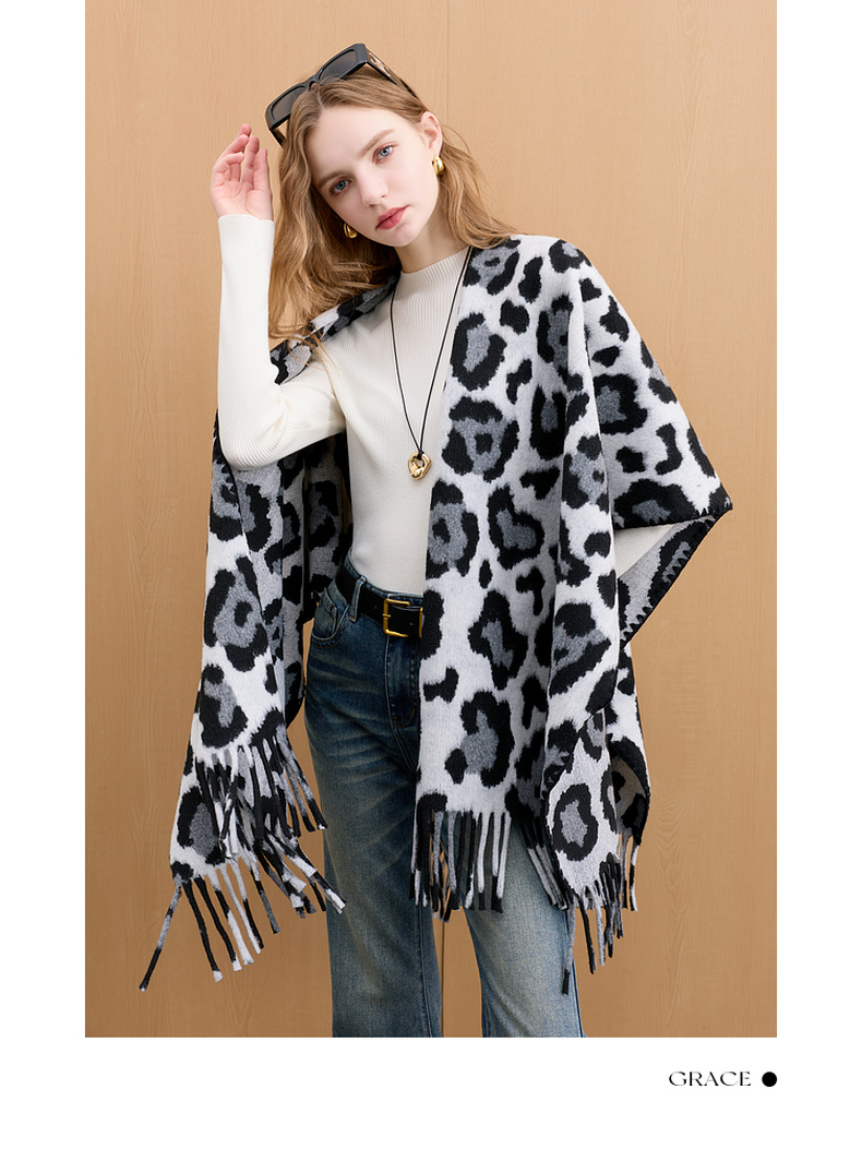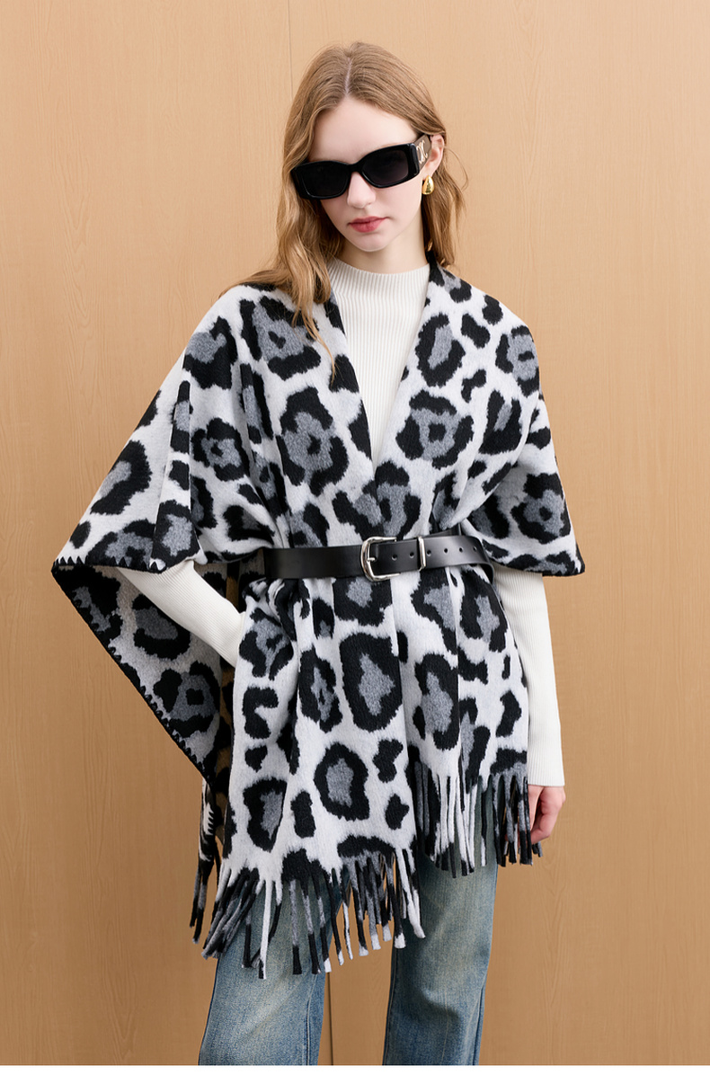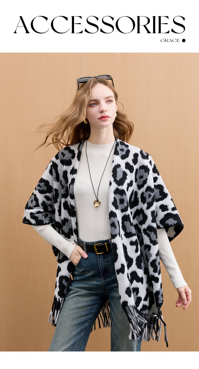 三彩2025新款经典时髦外搭披肩保暖流苏复古豹纹出片百搭