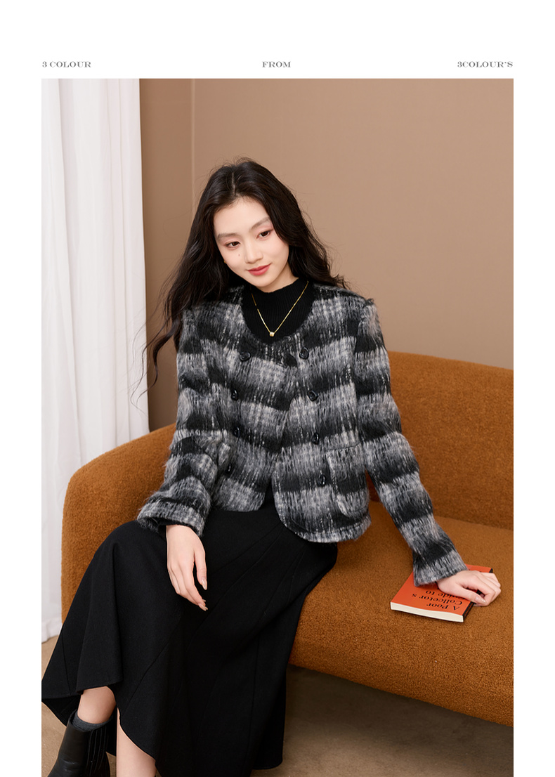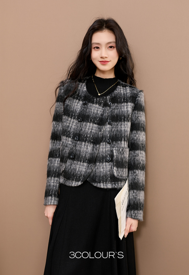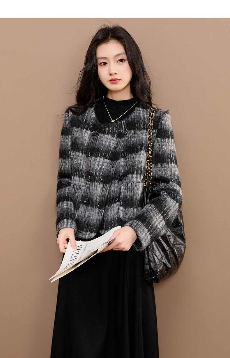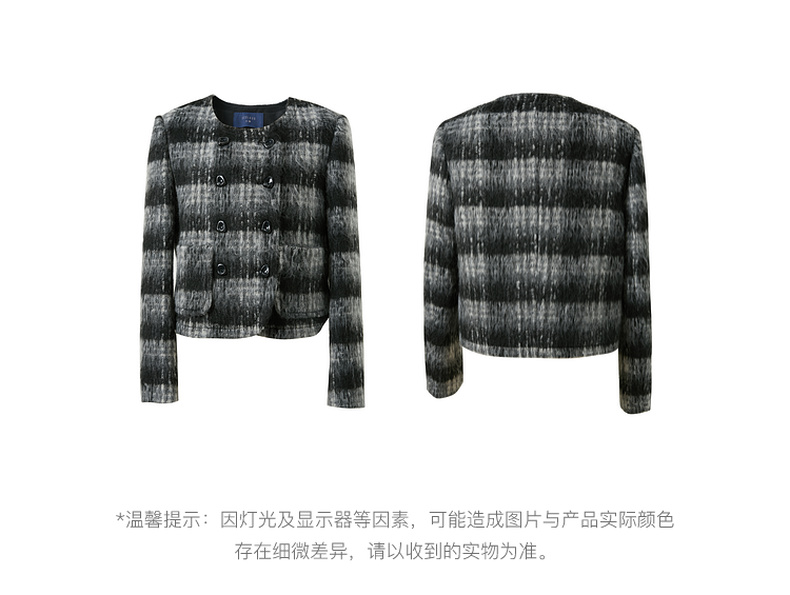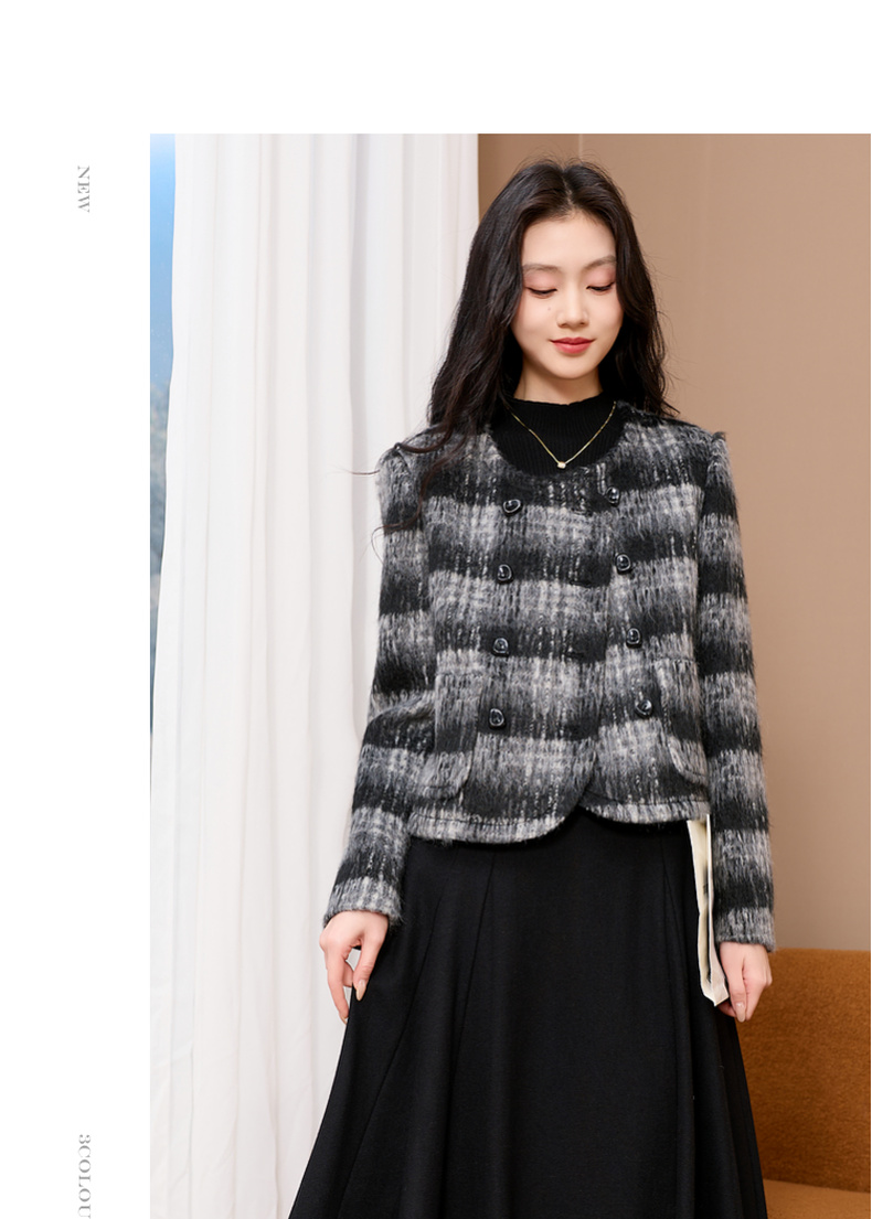 三彩2025冬季新款格纹毛呢外套复古轻奢双排扣短款宽松大衣S