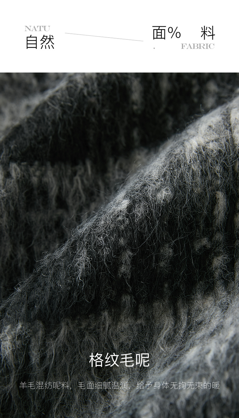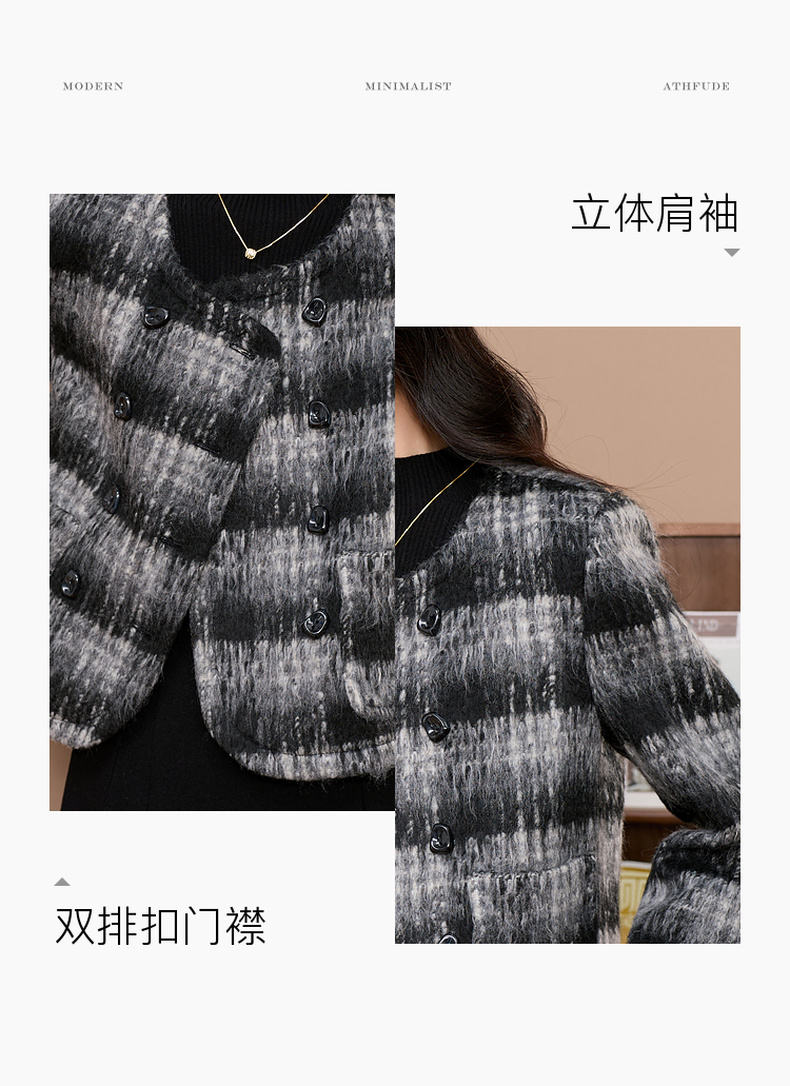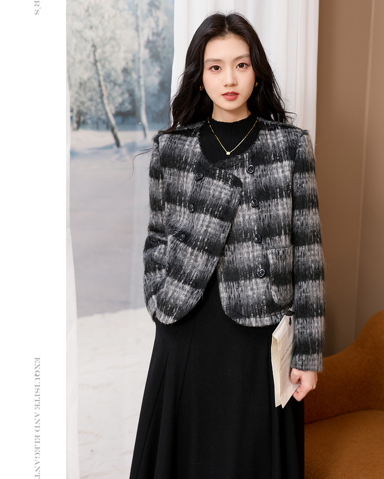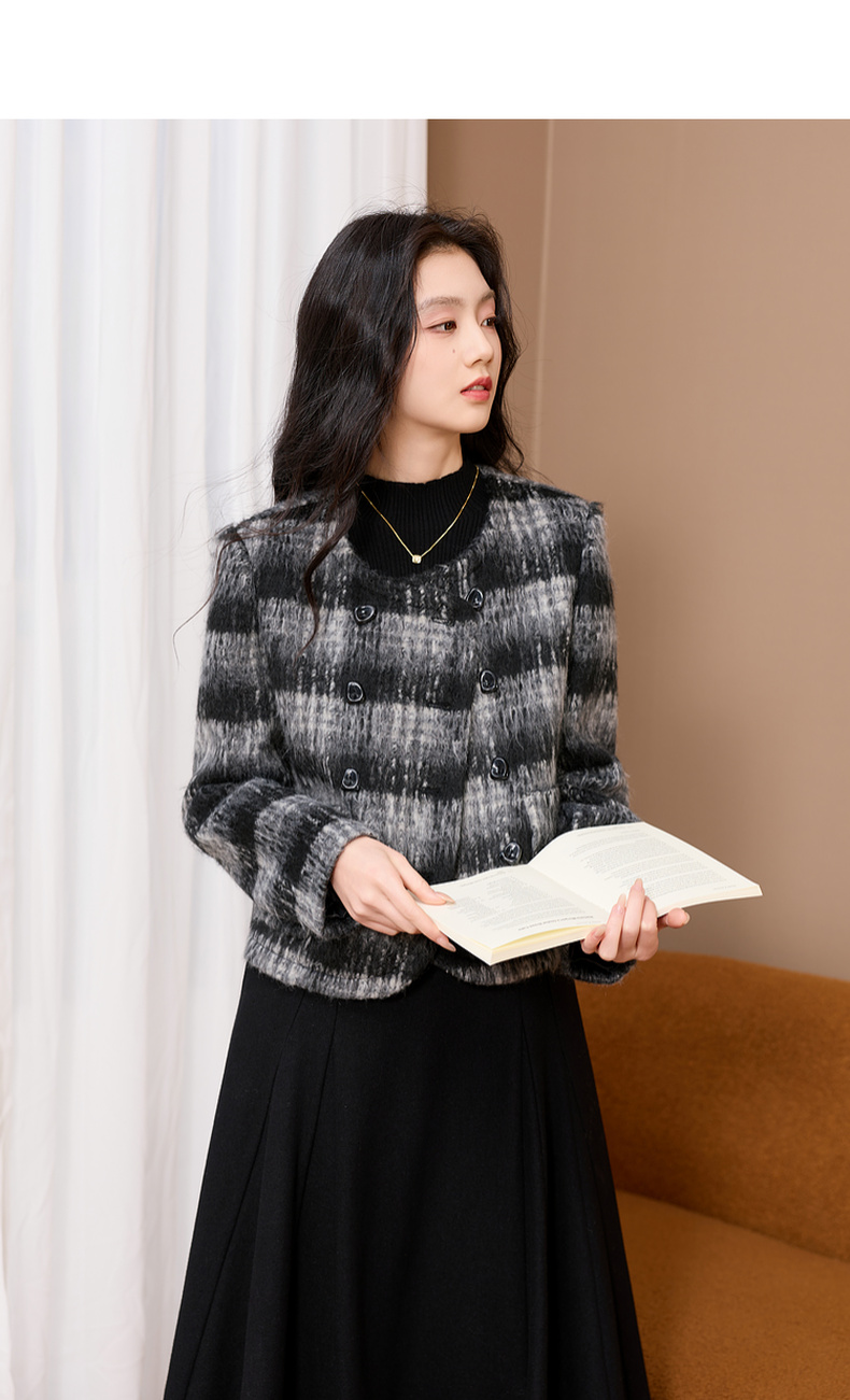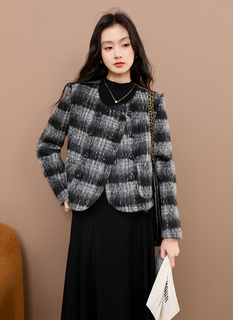 三彩2025冬季新款格纹毛呢外套复古轻奢双排扣短款宽松大衣S