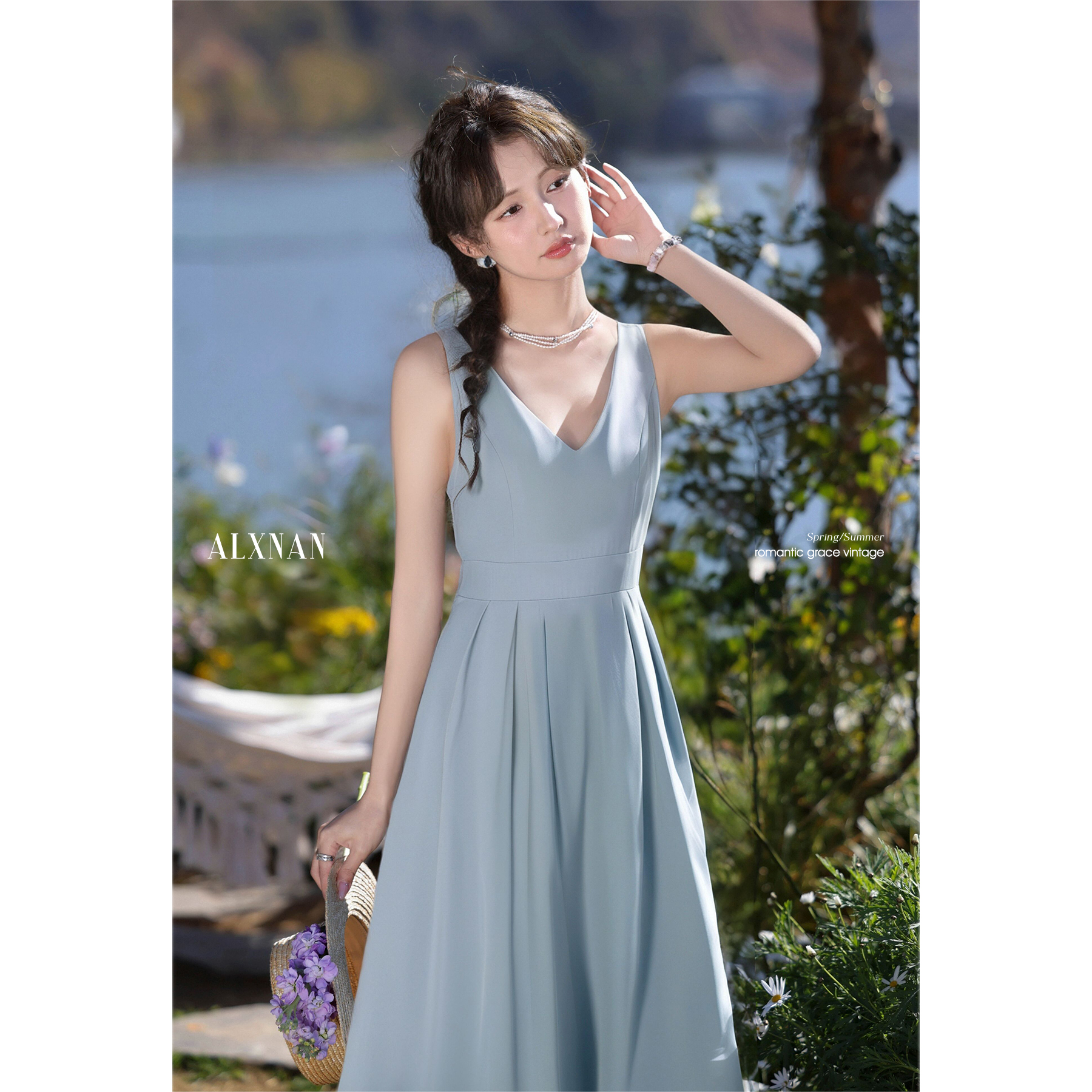 【65折秒杀】鹿向南「月栖树梢」蓝色连衣裙2025年新款夏季时尚吊带裙女士QYM002452