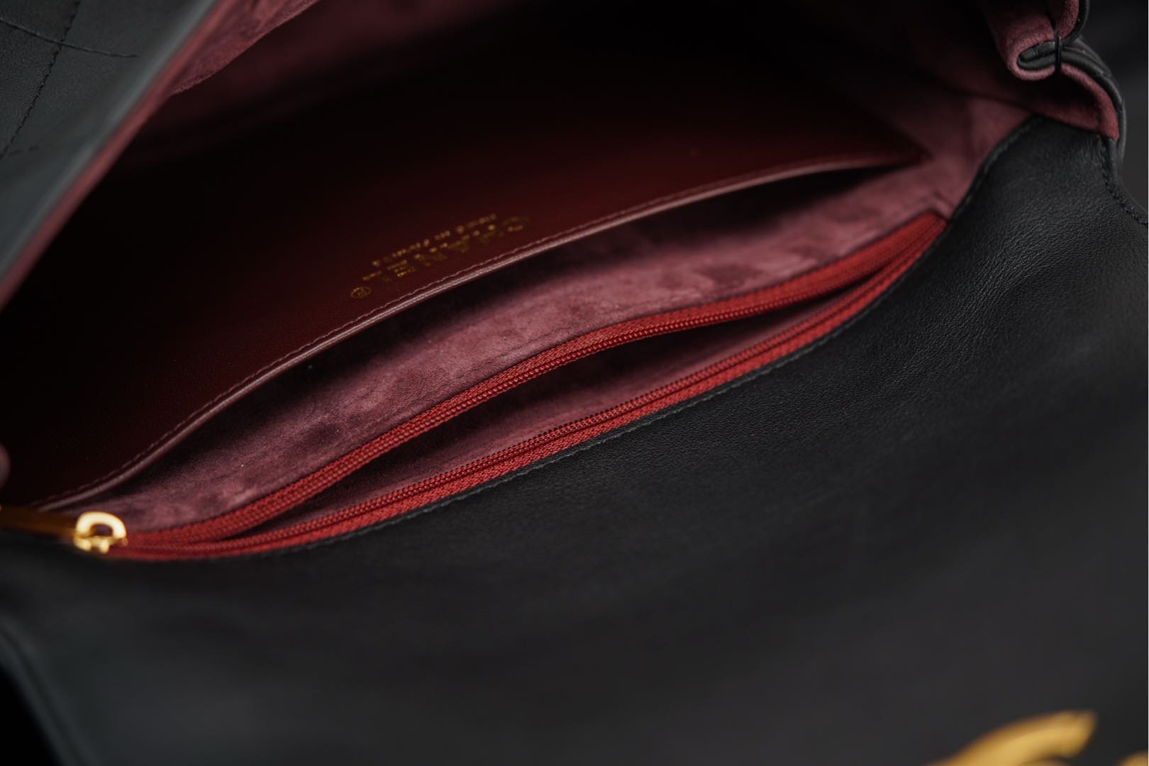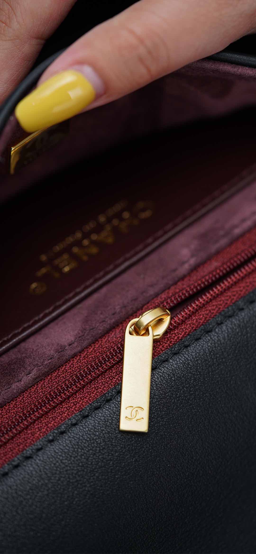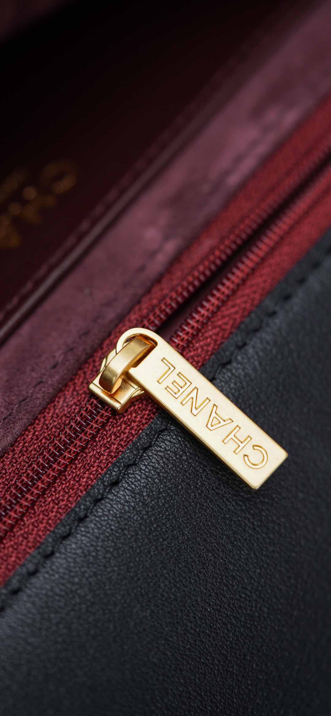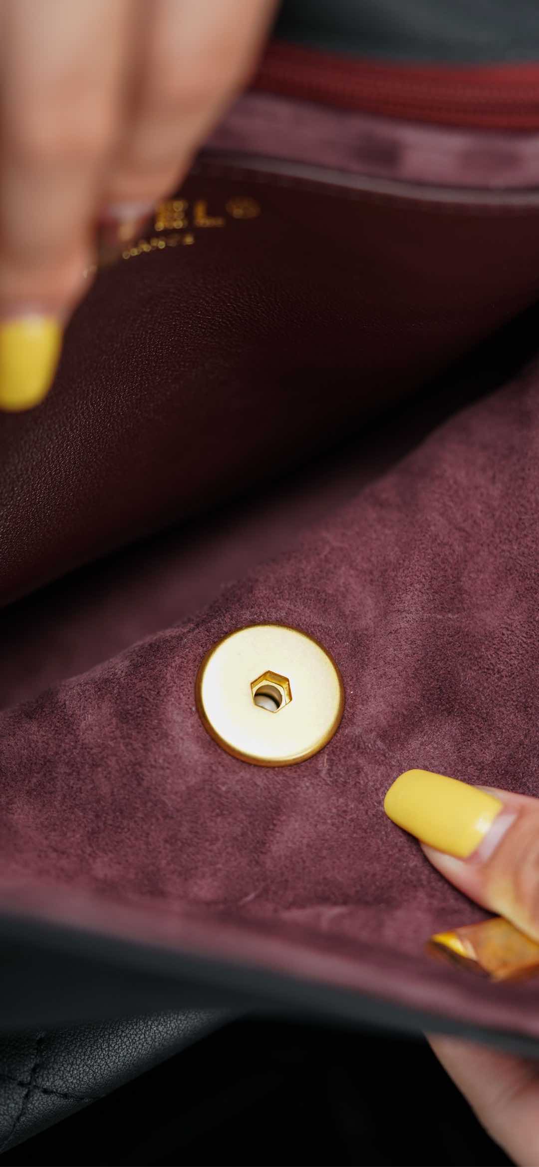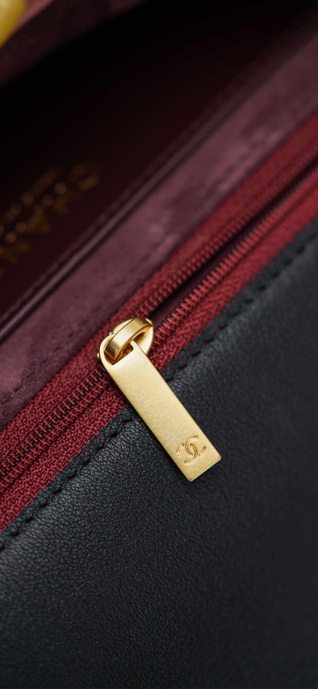 内里细节鉴赏🔍 经典红黑配色,营造出一种沉稳大气的高级感♥️、麂皮内里丝绒般的质感、优雅又精致✨ 自带拉链隔层、内扣采用外圆内六角螺丝 与zp同步数据!霉感十足的拉牌细节~