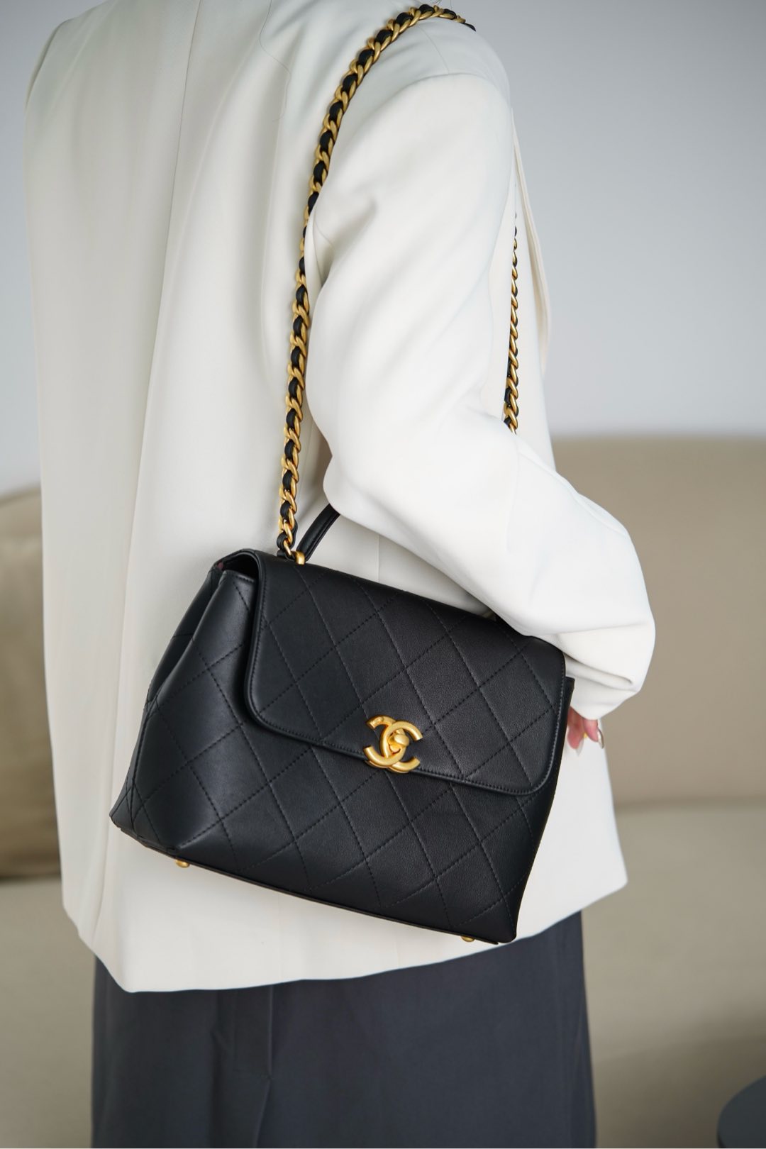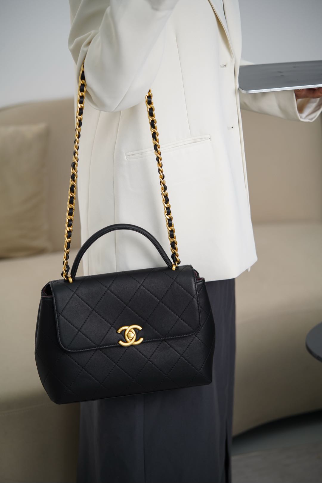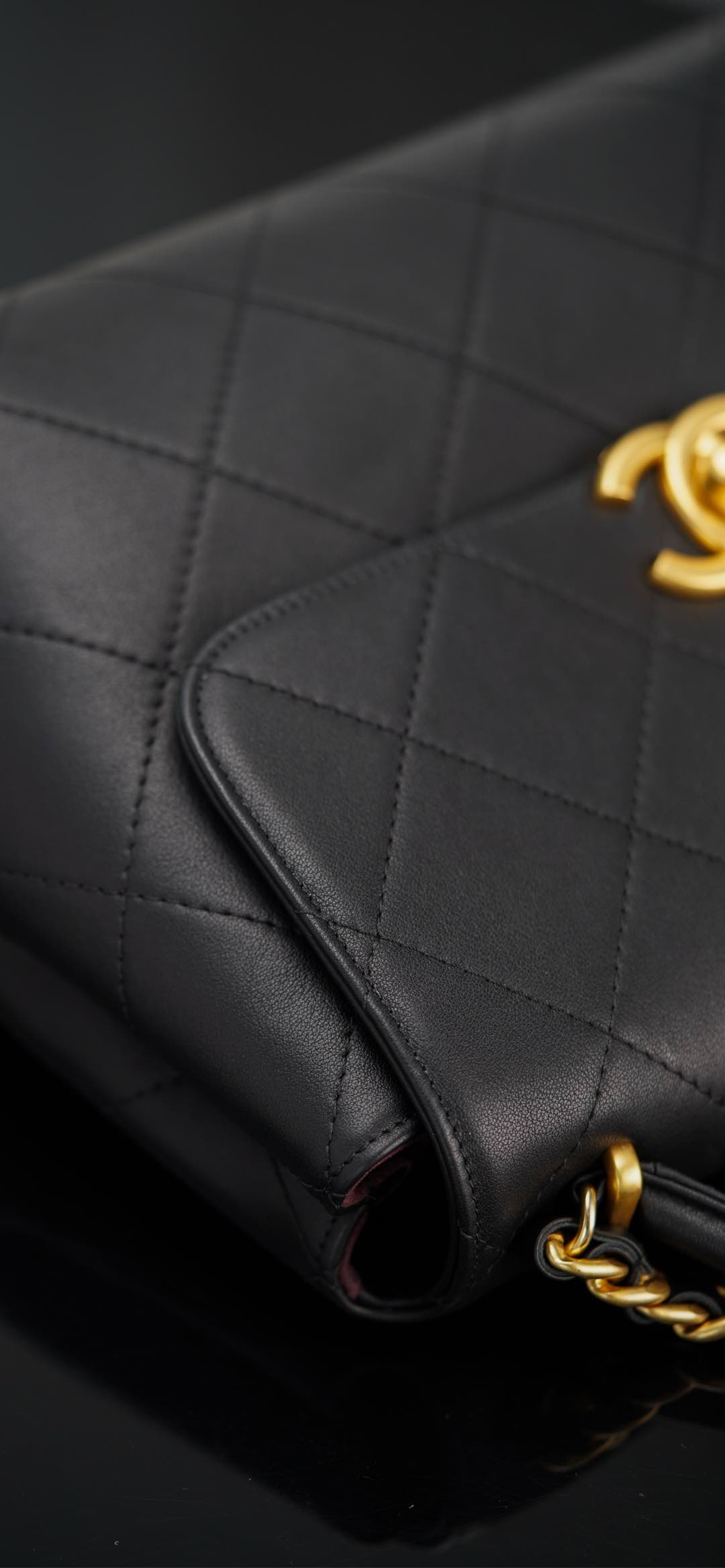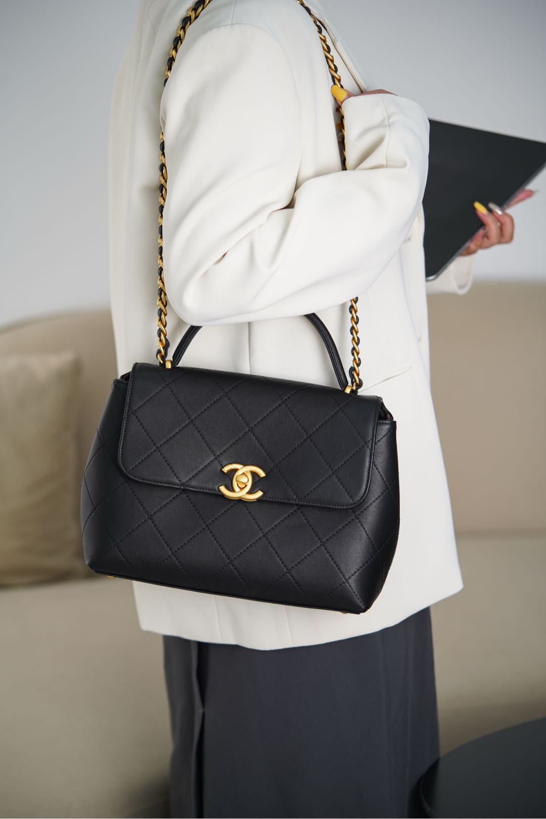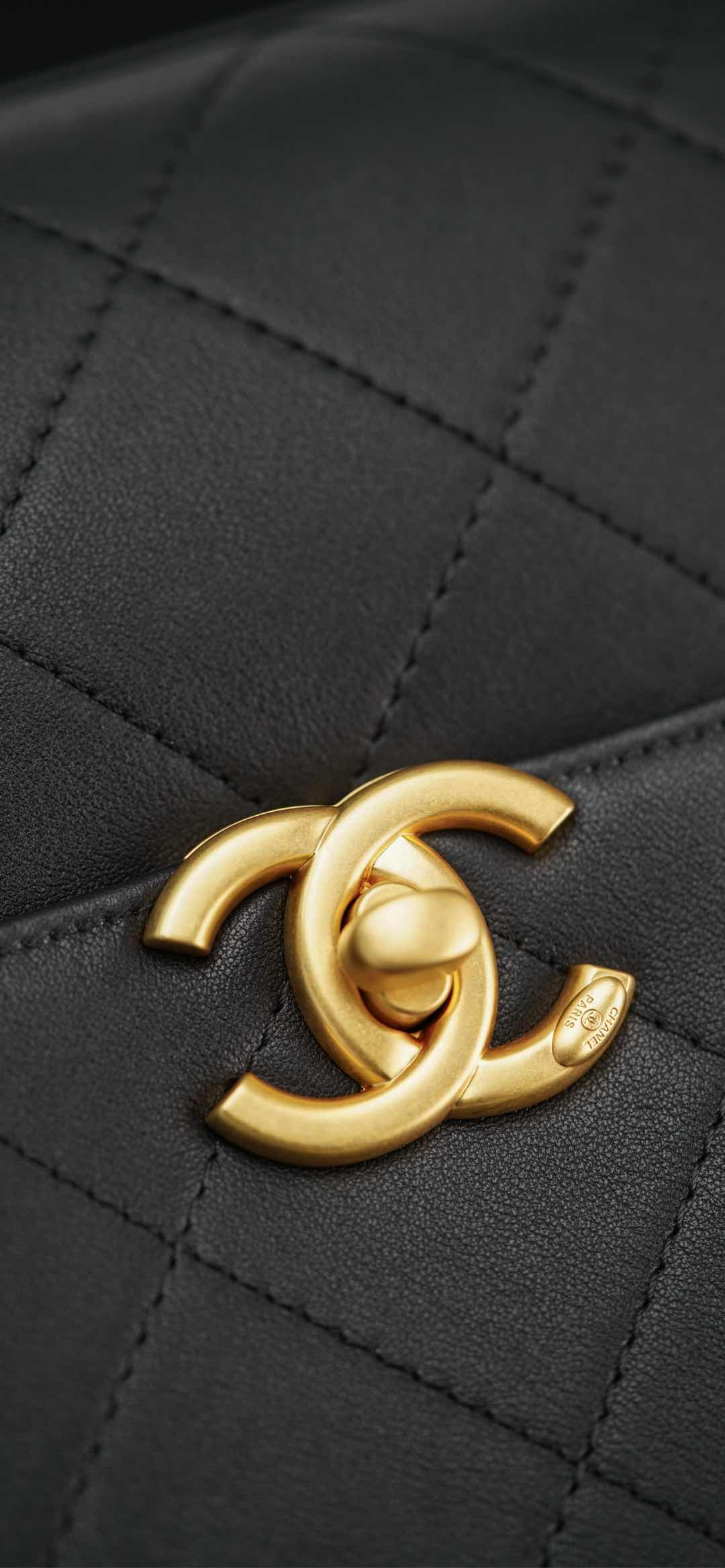 𝐂𝐡𝐚𝐧𝐞𝐥 𝟐𝟓𝐬 手提口盖包 黑金🖤大号 气场全开、很适合职场人士的黑金公文包💼;可见容量非常感人🤩!大大的菱格搭配砂金双𝐂扣、复古感十足;会衬托的整个人非常干练利落! 手拎很🆒、单肩又很随性大方、有点学院风的即视感~ 采用小牛皮🐂耐用好打理👏🏻 大包爱好者、实用主义必入! 尺寸:𝟐𝟎.𝟓𝐱𝟐𝟖𝐱𝟗.𝟓𝐜𝐦 材质:小牛皮与金属