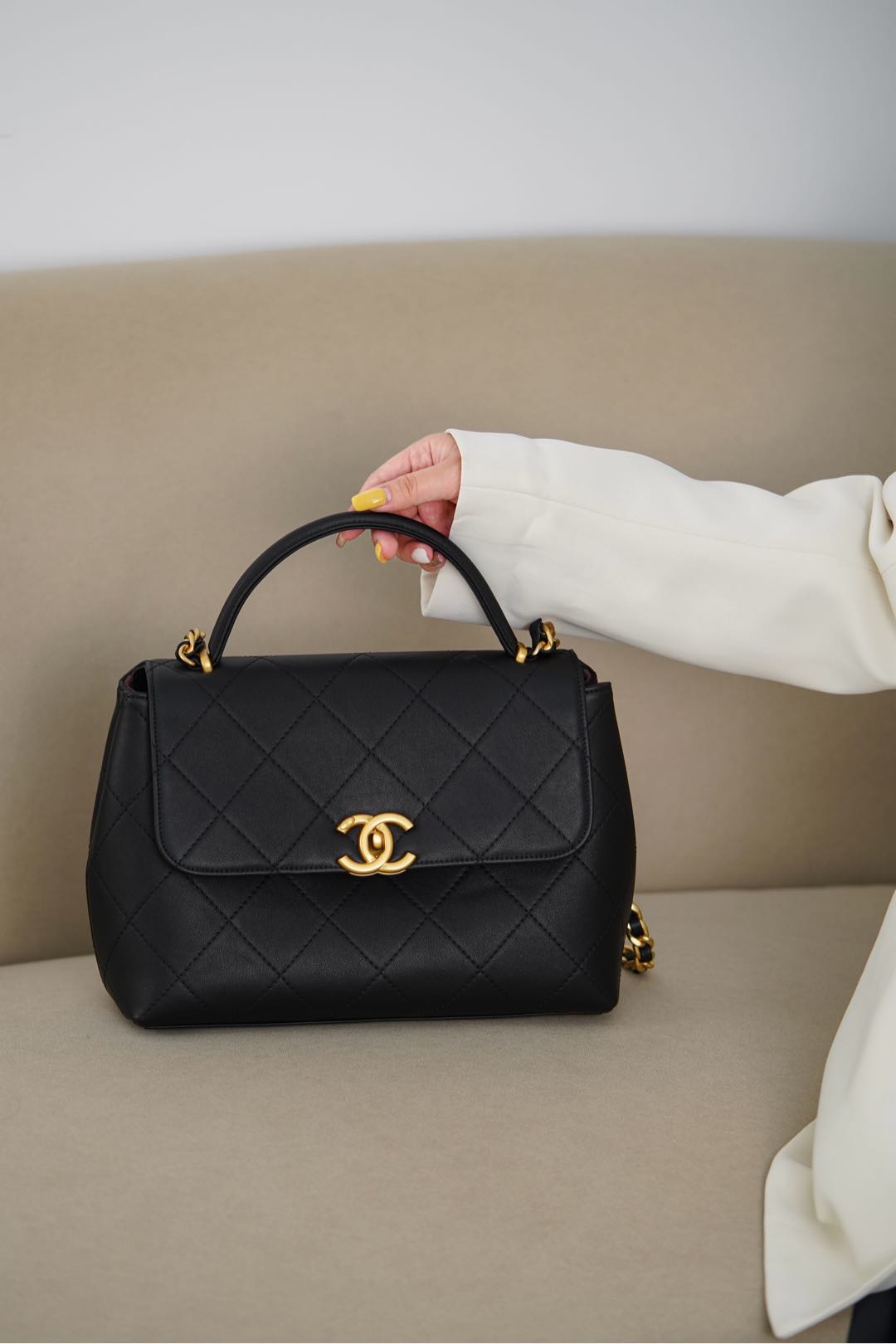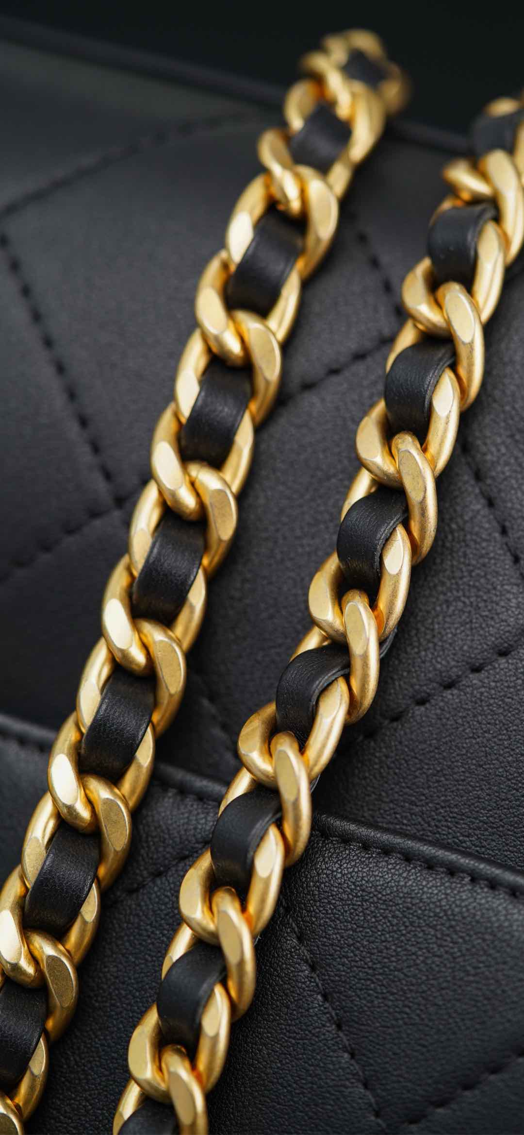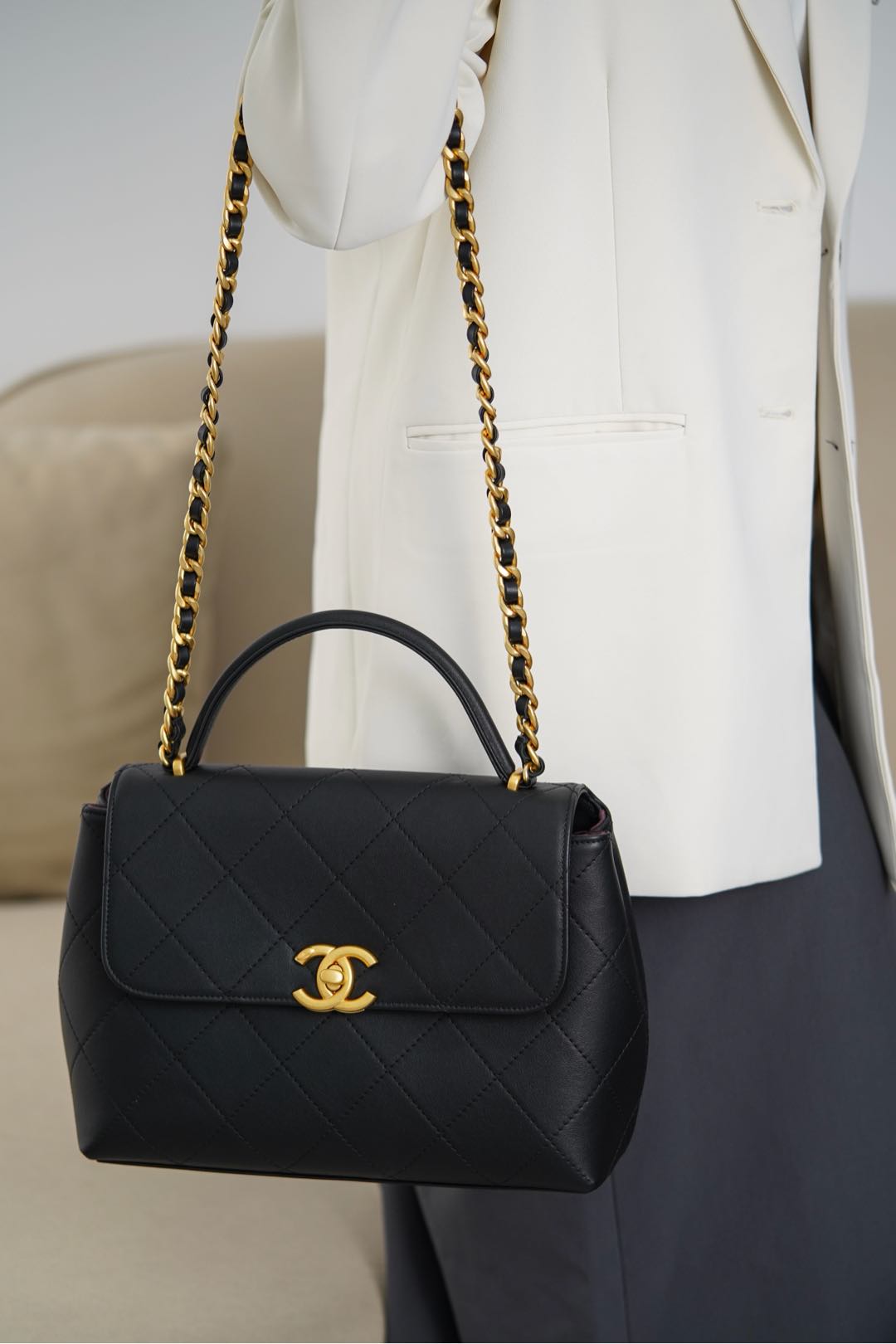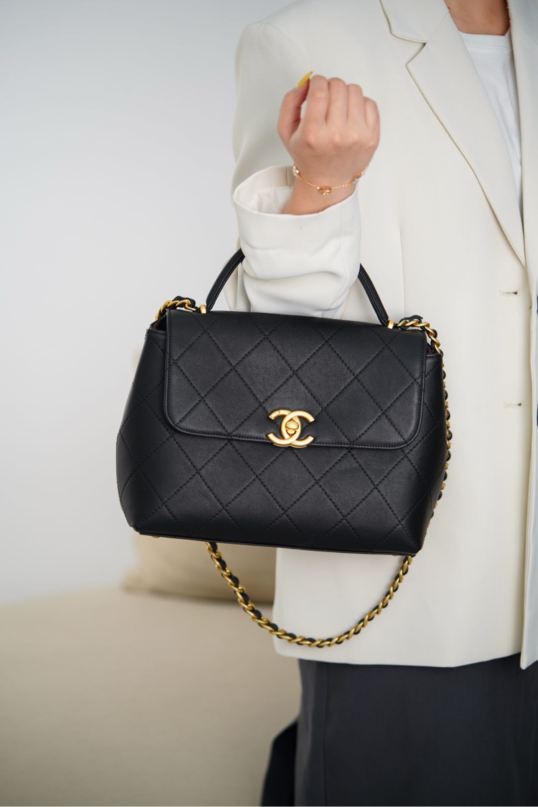 𝐂𝐡𝐚𝐧𝐞𝐥 𝟐𝟓𝐬 手提口盖包 黑金🖤大号 气场全开、很适合职场人士的黑金公文包💼;可见容量非常感人🤩!大大的菱格搭配砂金双𝐂扣、复古感十足;会衬托的整个人非常干练利落! 手拎很🆒、单肩又很随性大方、有点学院风的即视感~ 采用小牛皮🐂耐用好打理👏🏻 大包爱好者、实用主义必入! 尺寸:𝟐𝟎.𝟓𝐱𝟐𝟖𝐱𝟗.𝟓𝐜𝐦 材质:小牛皮与金属