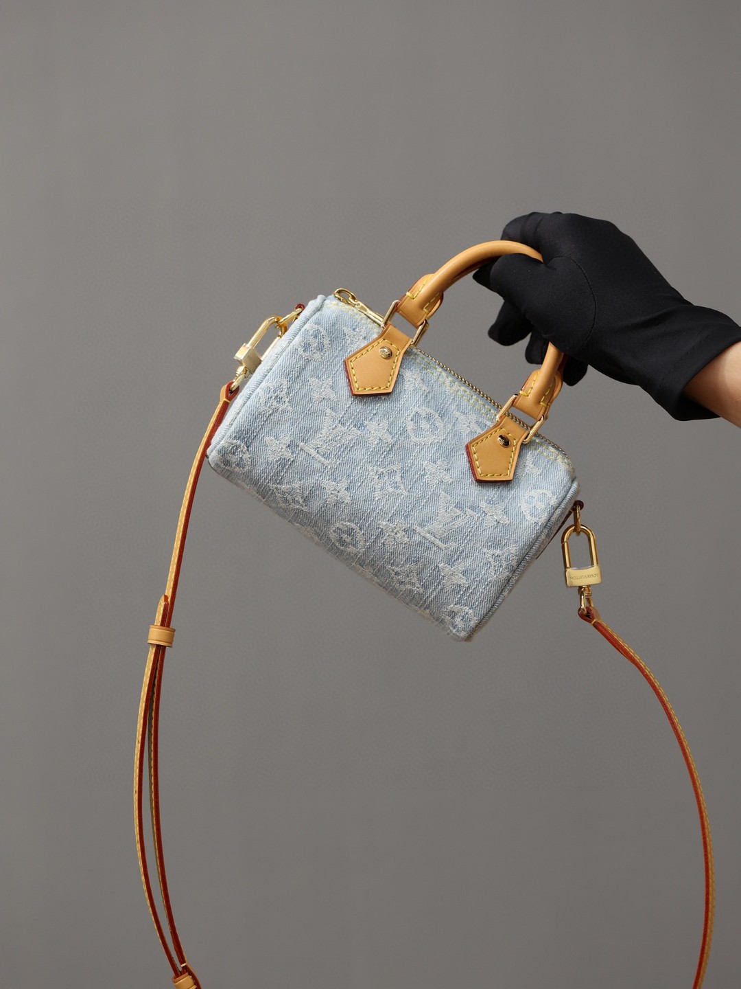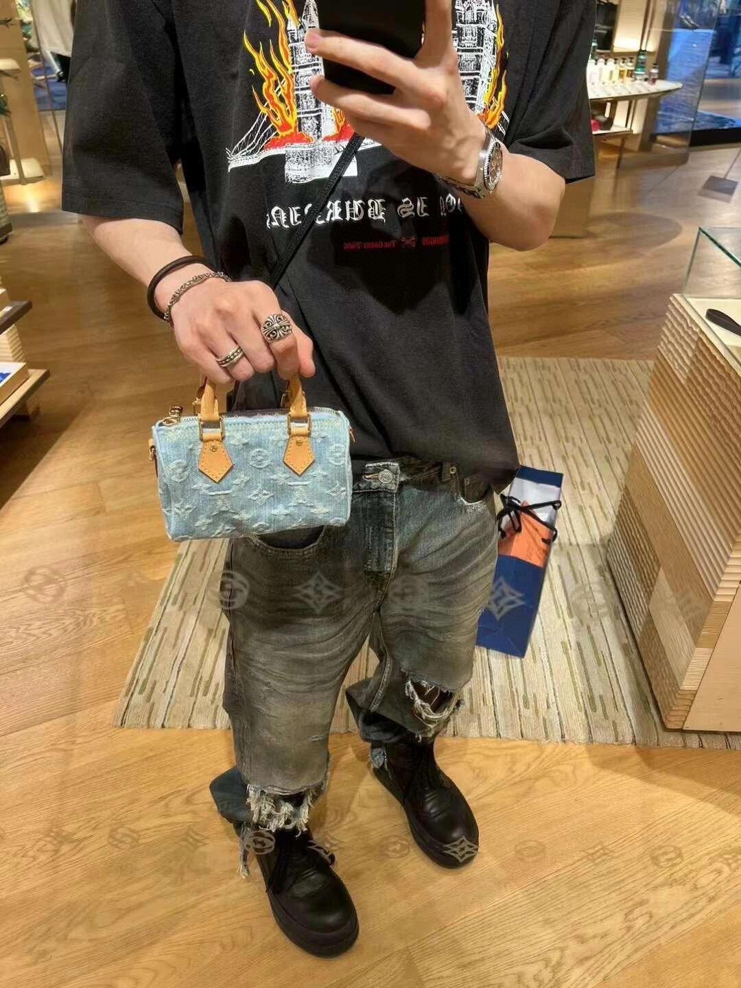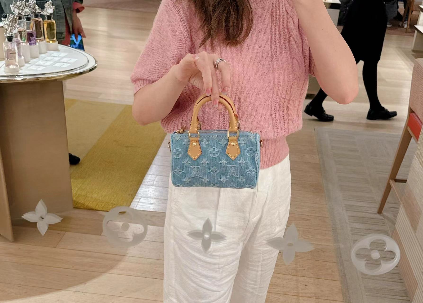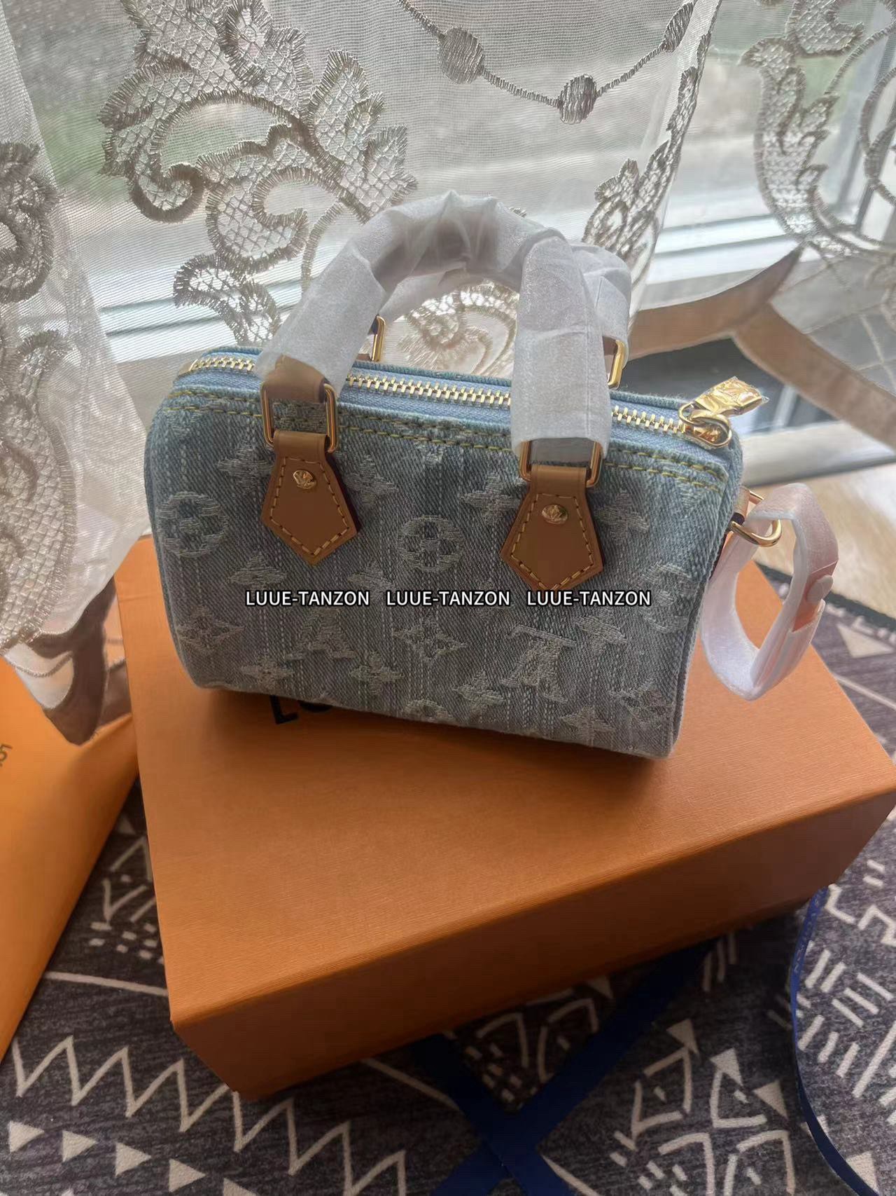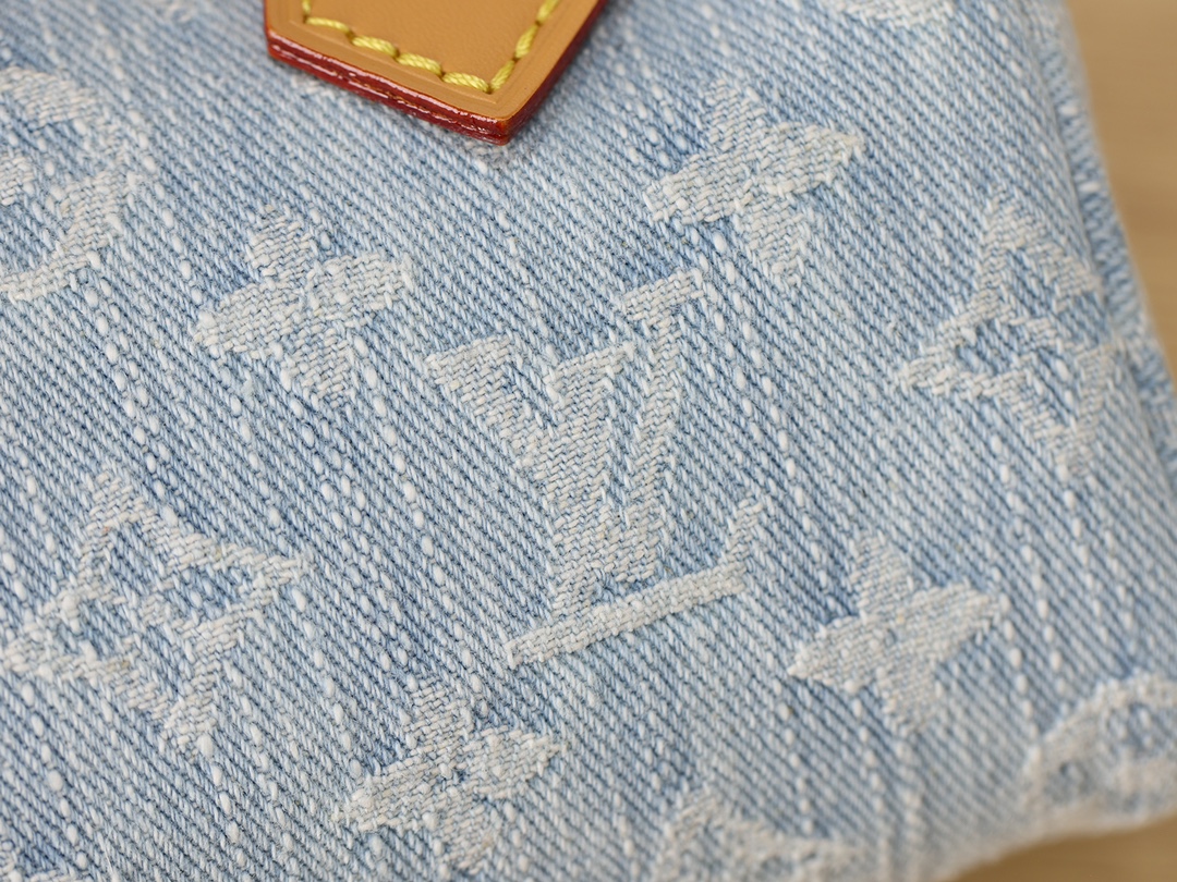 【独家实拍 M11212 】本款 Nano Speedy 手袋为棉质丹宁织就 Monogram 图案,经漂白和砂洗后呈现复古风范。牛皮革塑造手柄和可拆卸并调节的肩带,呈现微妙做旧效果。